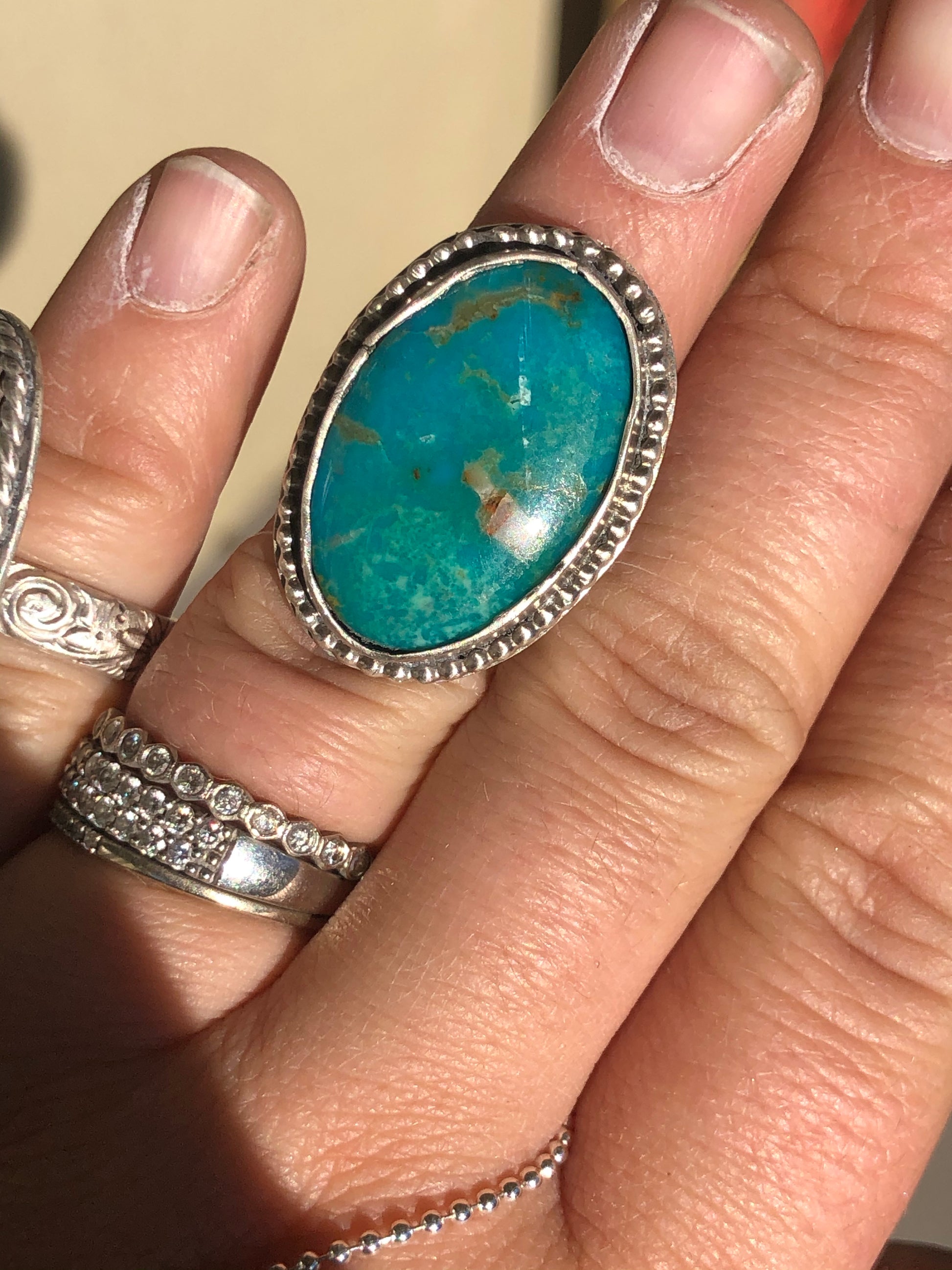 Our Kimmie Turquoise Mountain Rainy Band Turquoise Sterling Silver Ring Ships with Insurance and Tracking