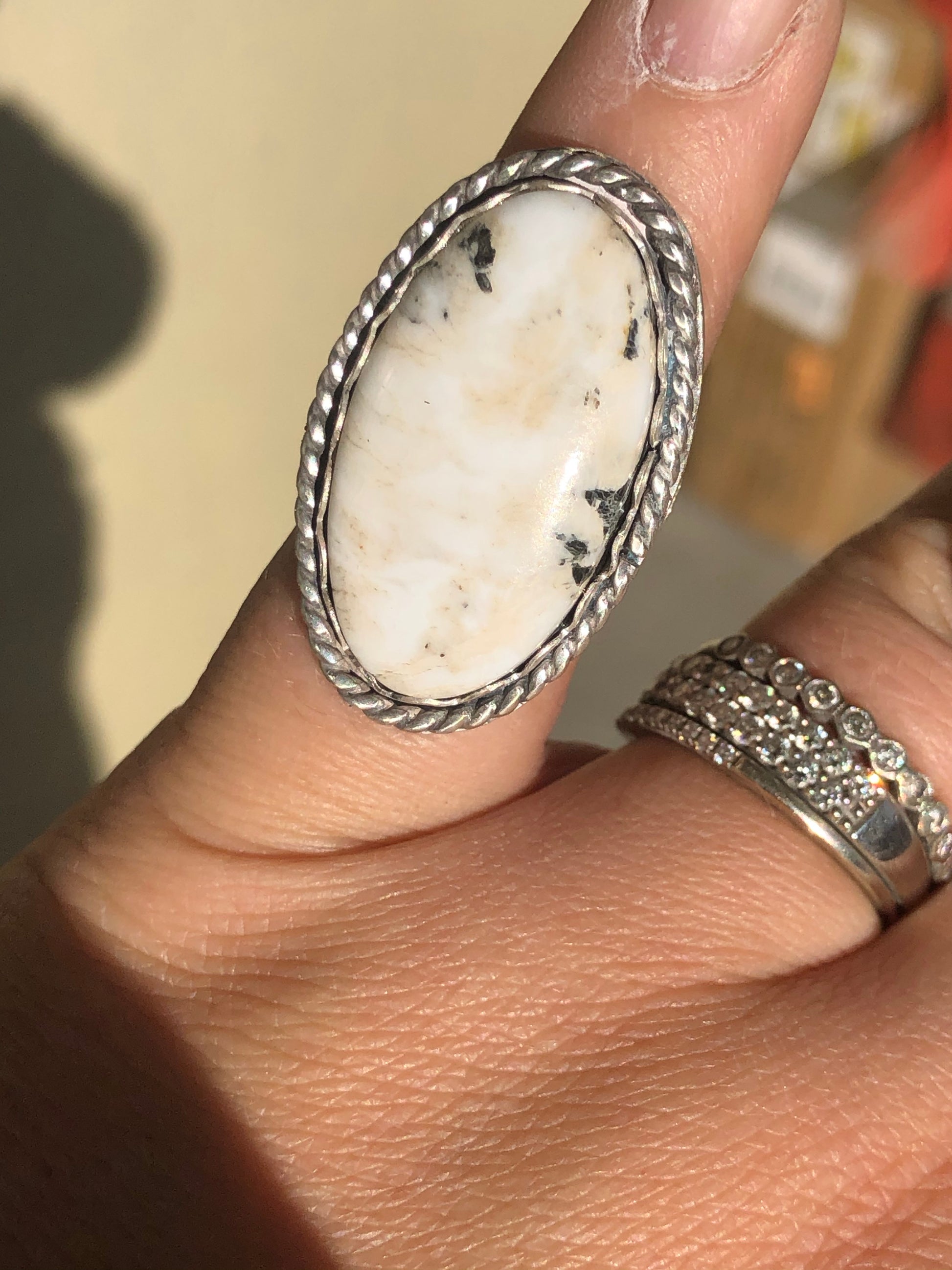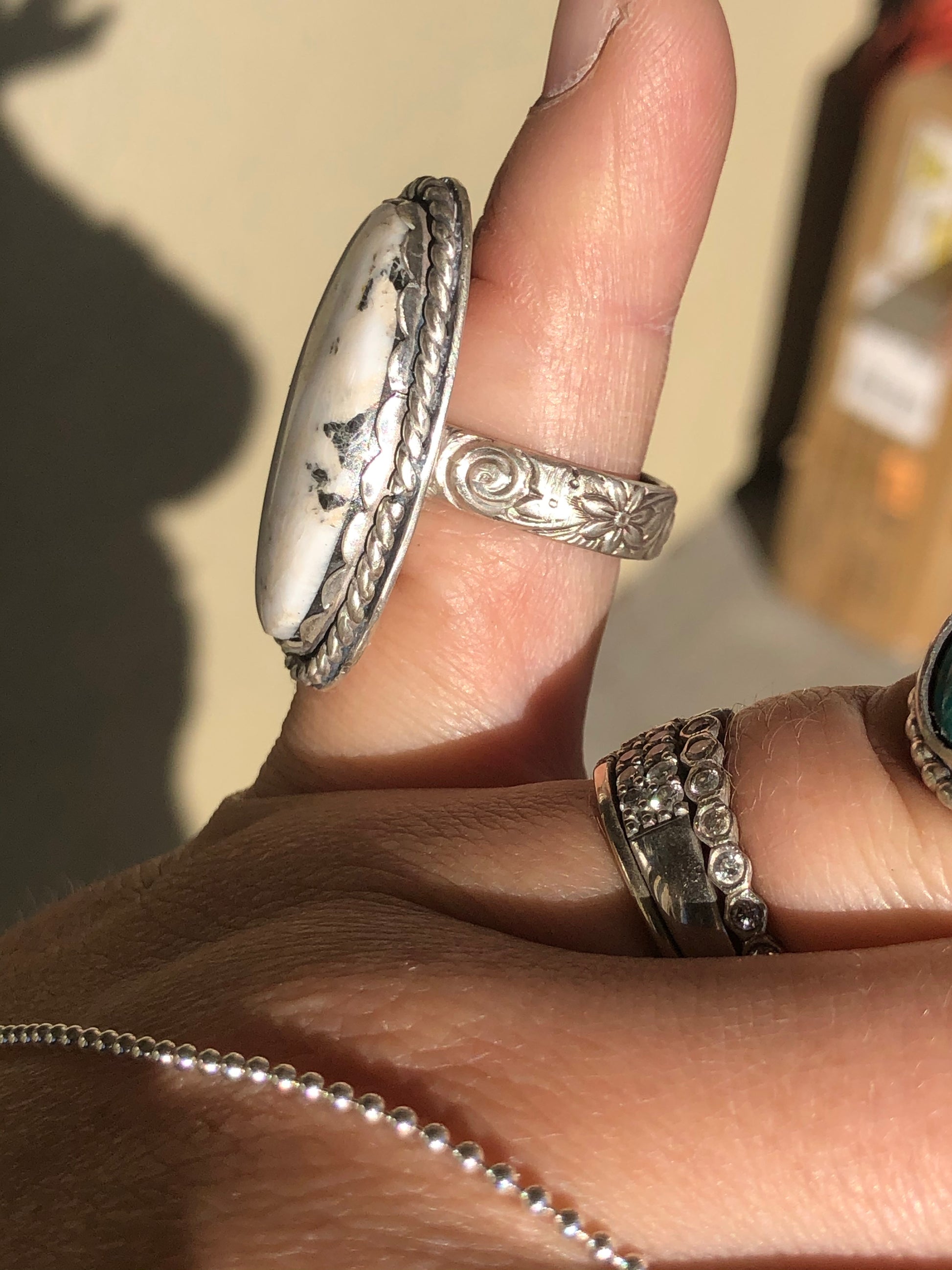 7US Mindi White Buffalo Turquoise w/ Rainy Band Sterling Silver Ring