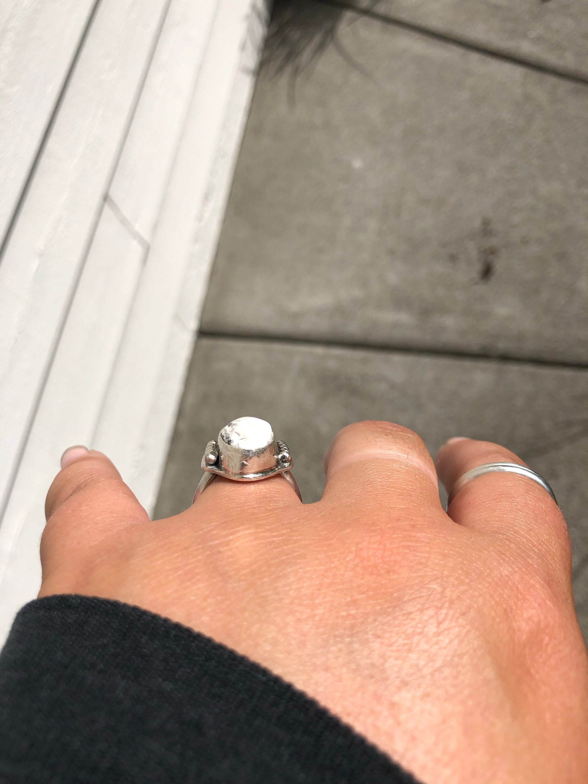 **Sterling silver is an alloy containing metals that react with chemicals found in air and produce tarnish; high moisture levels, exposure to sunlight and contaminants such as salt water increase this reaction. Properly care for ring by polishing with sterling silver polish & a clean cotton cloth.