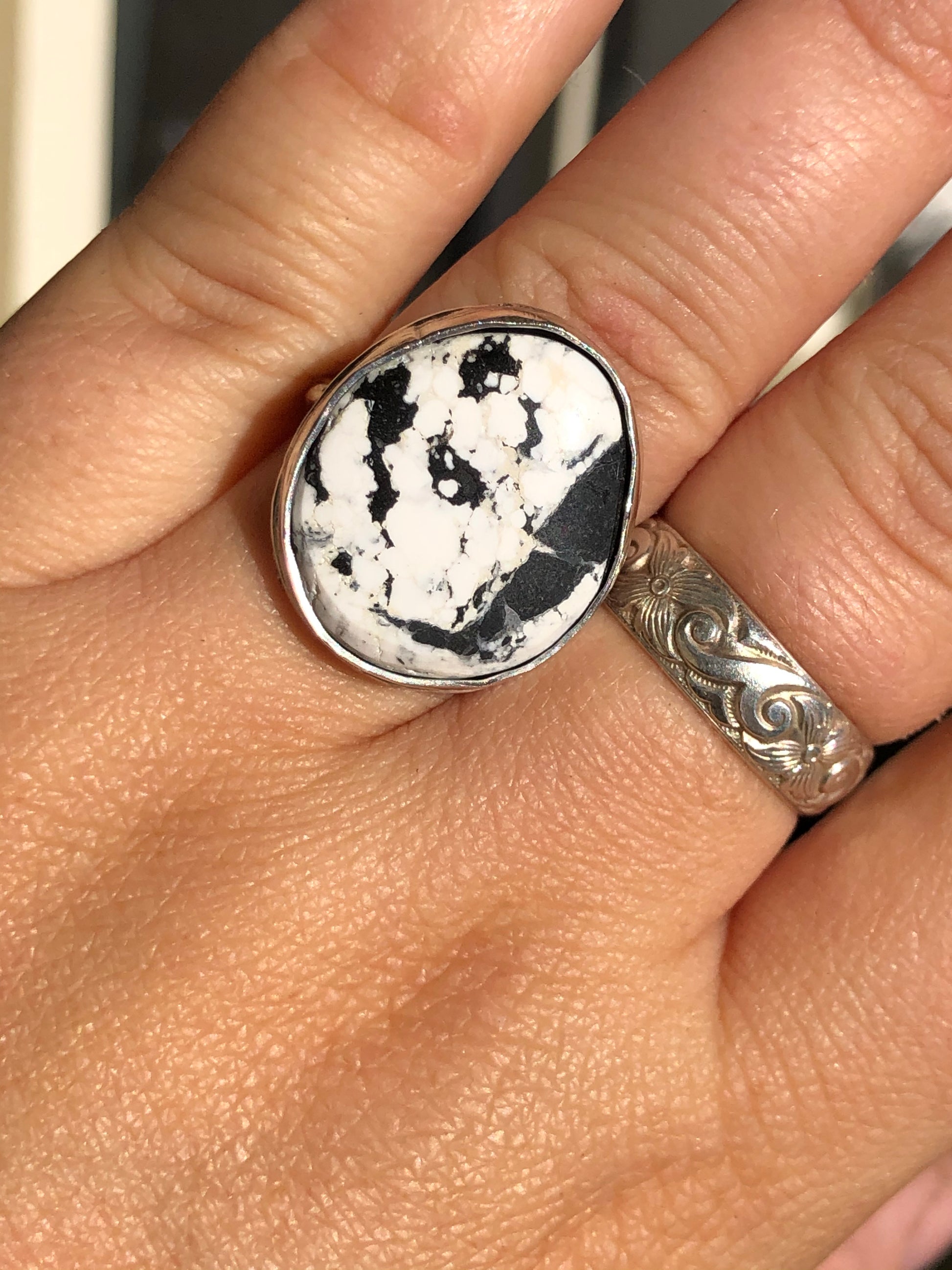 8US Twisted Cowgirl White Buffalo Turquoise Sterling Silver Ring