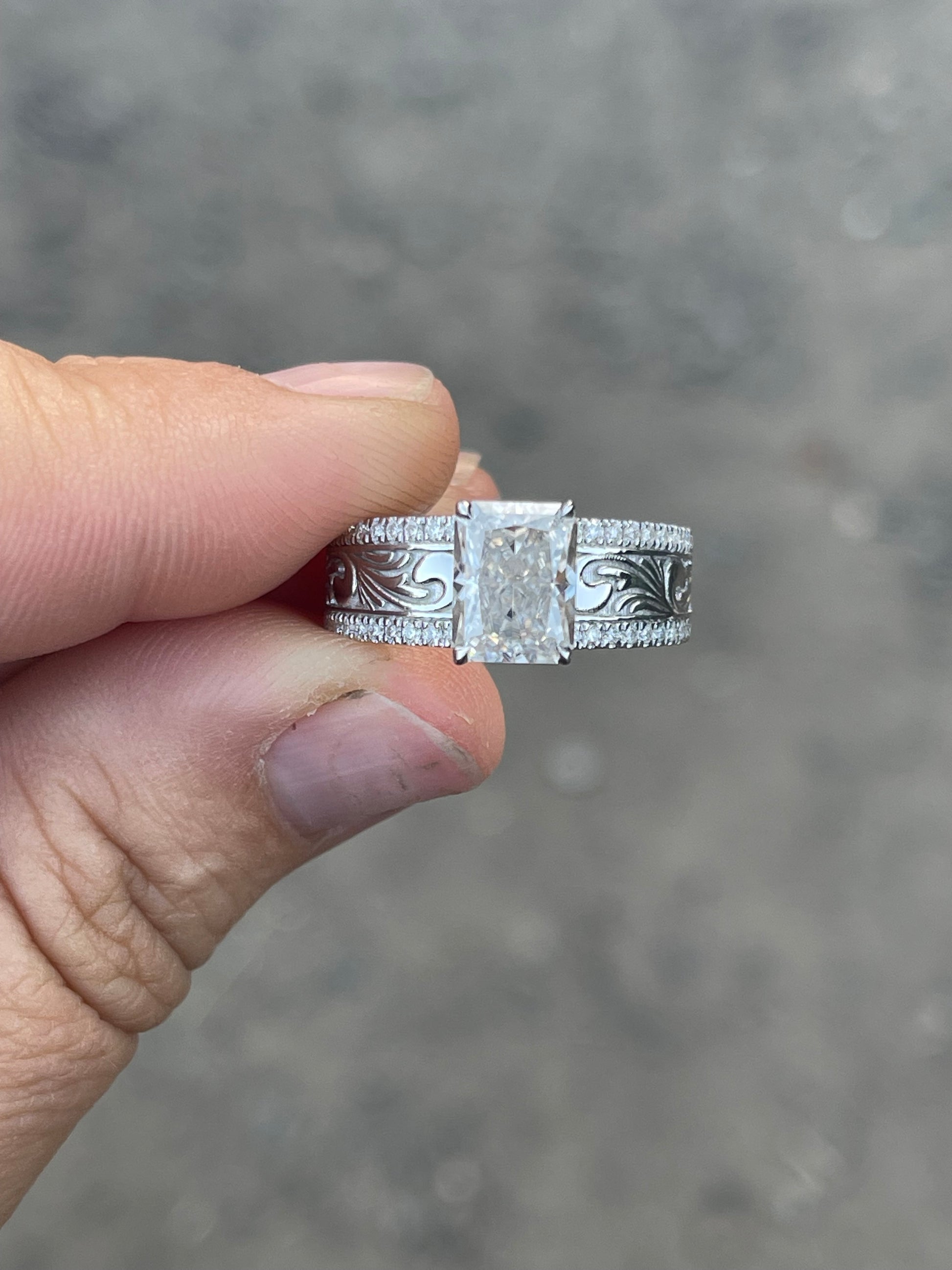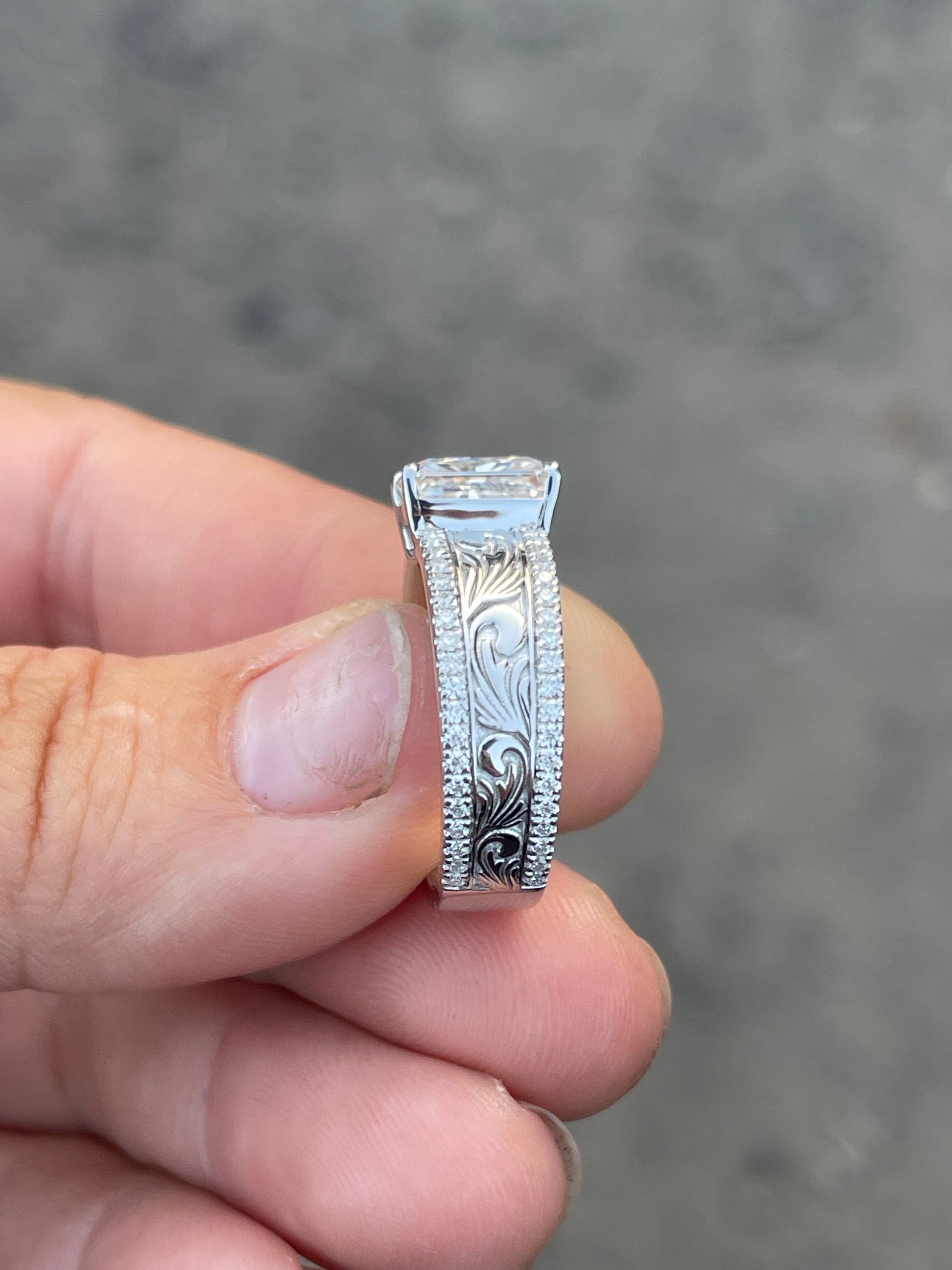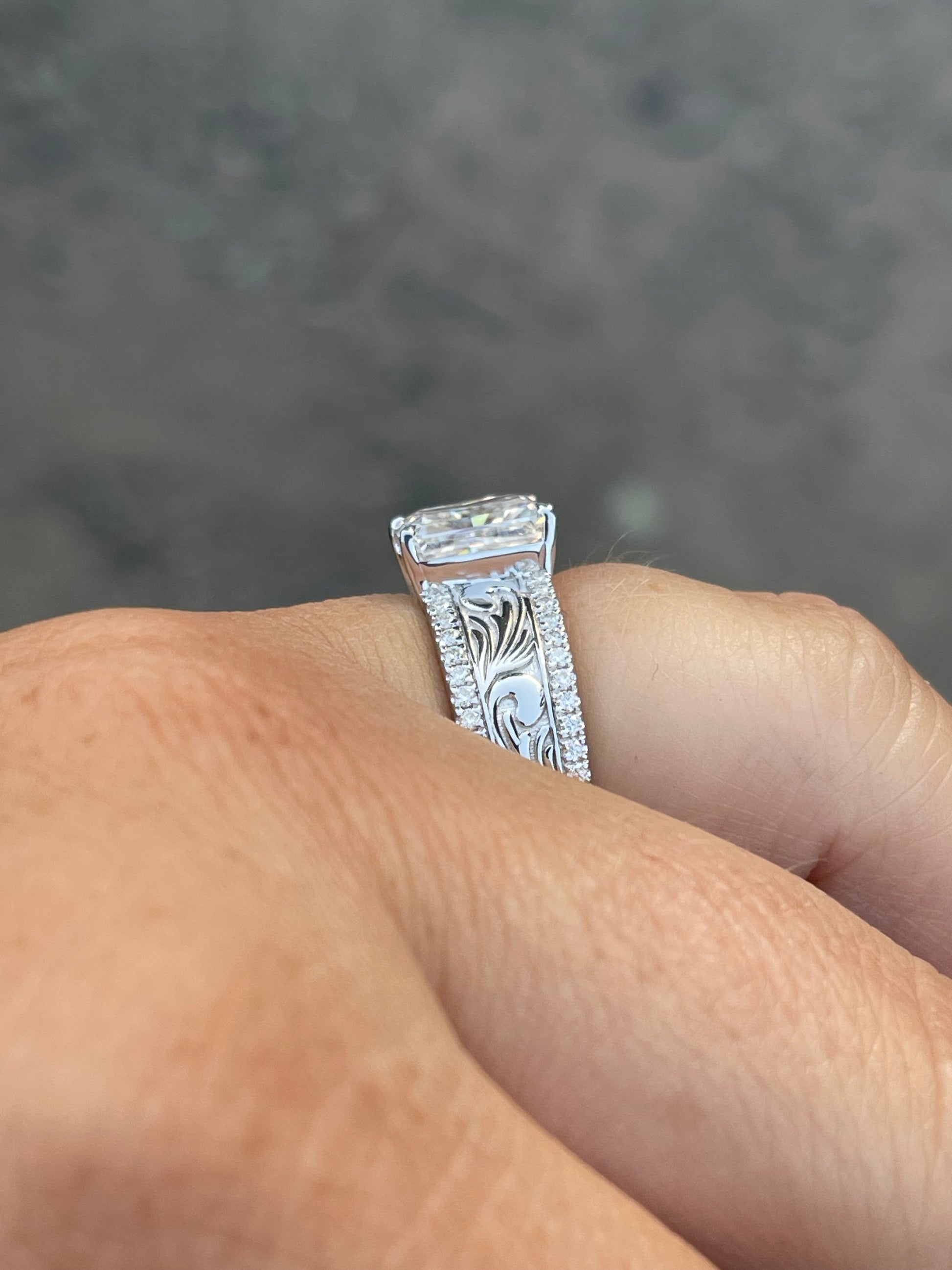 3ct Radiant Cut Moissanite with 5mm to 3mm Tapered Pattern Band with Stones.