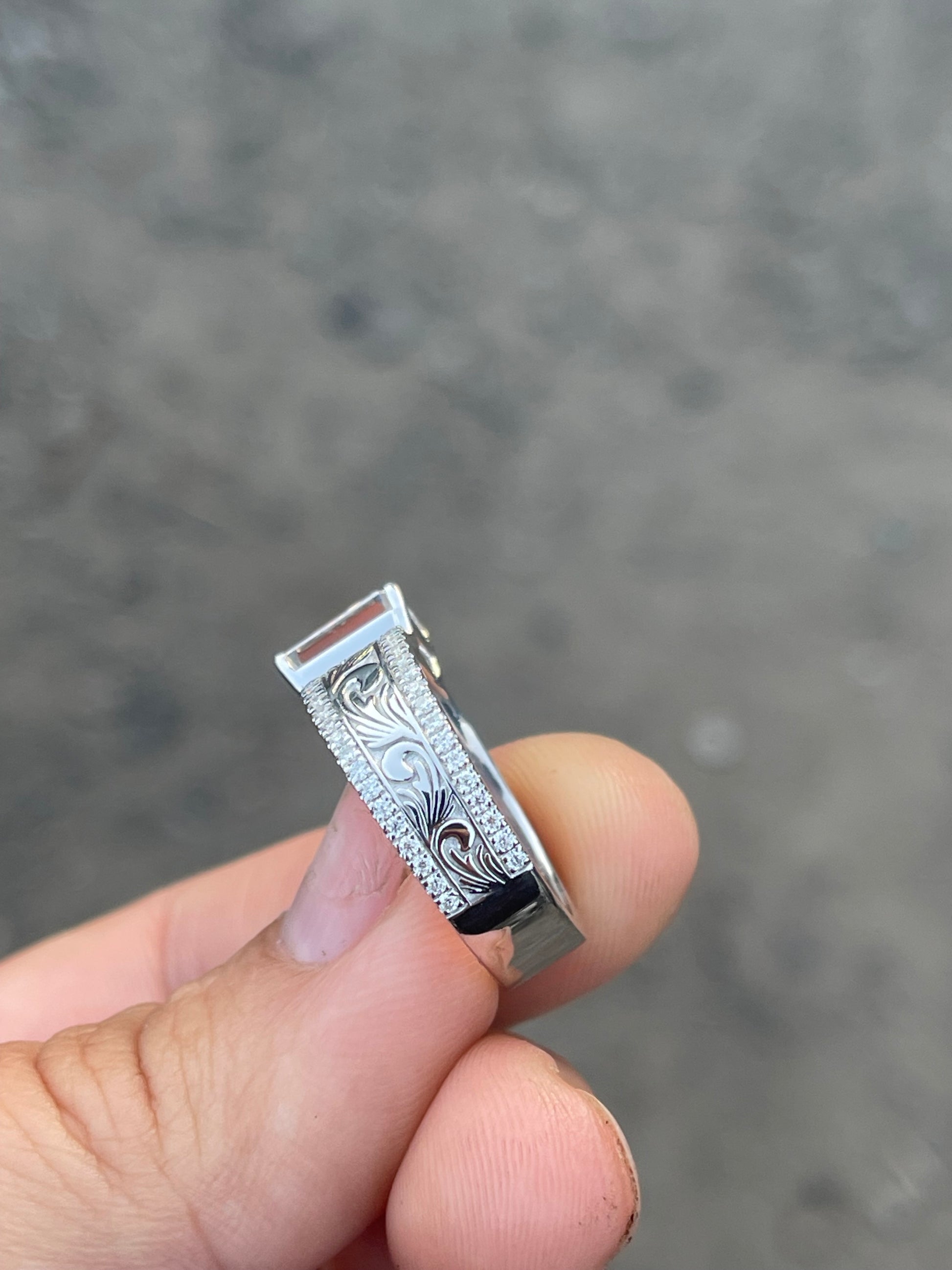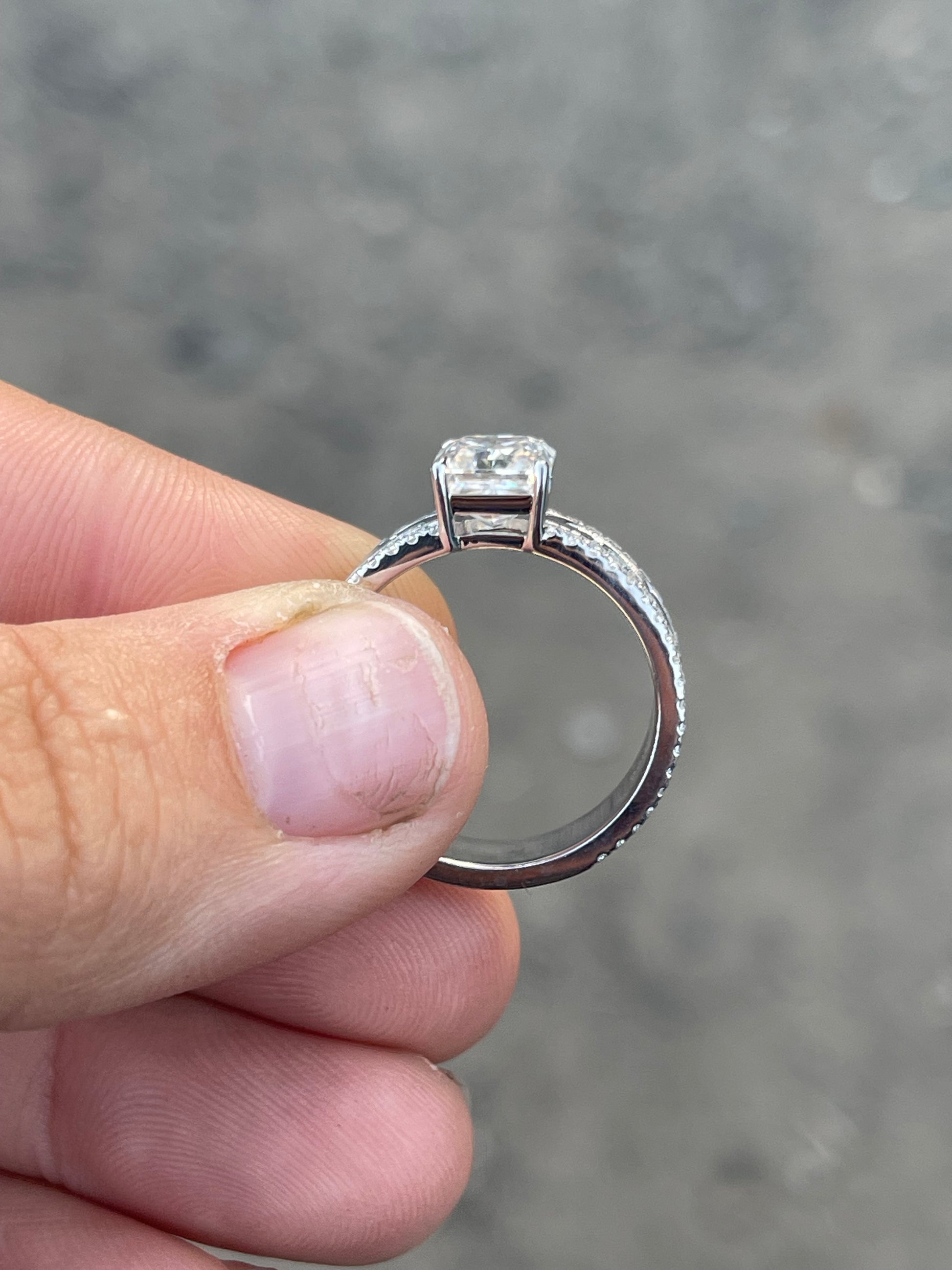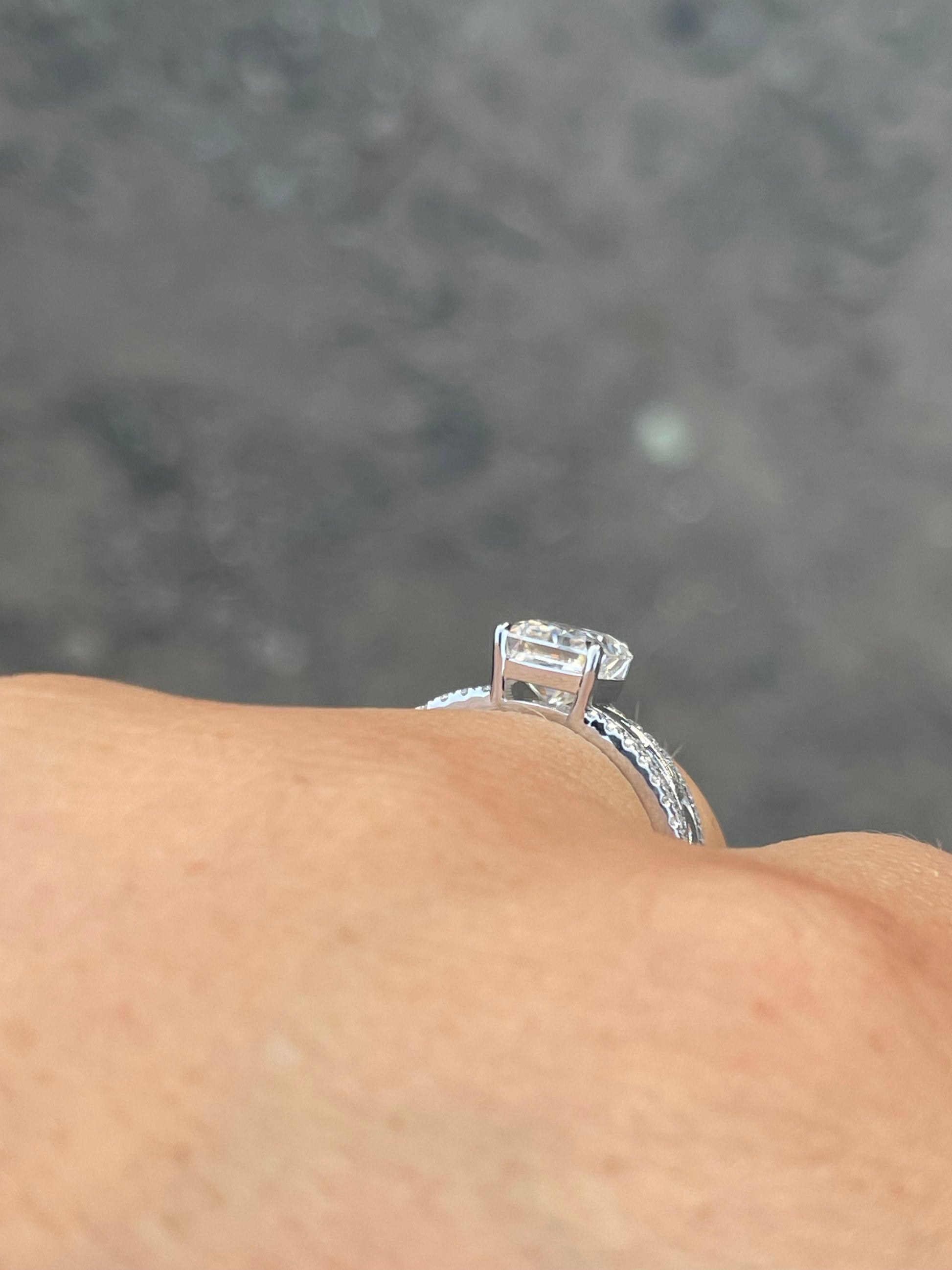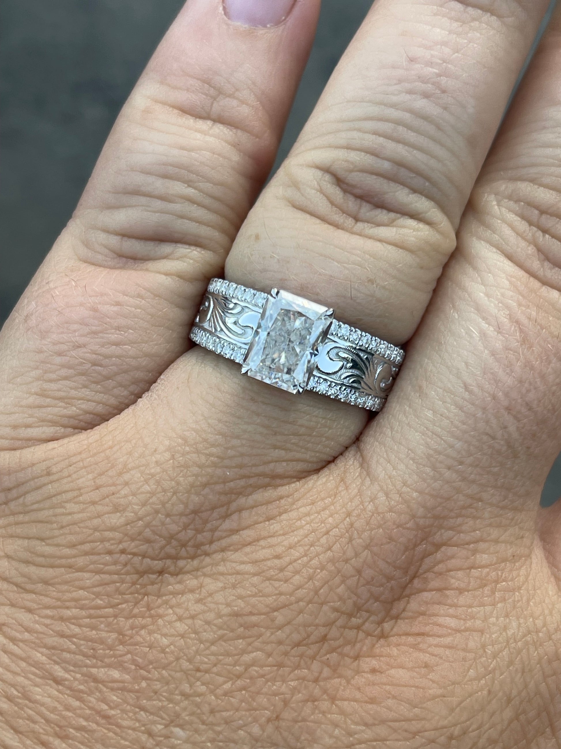 3ct Radiant Cut Moissanite with 5mm to 3mm Tapered Pattern Band with Stones.