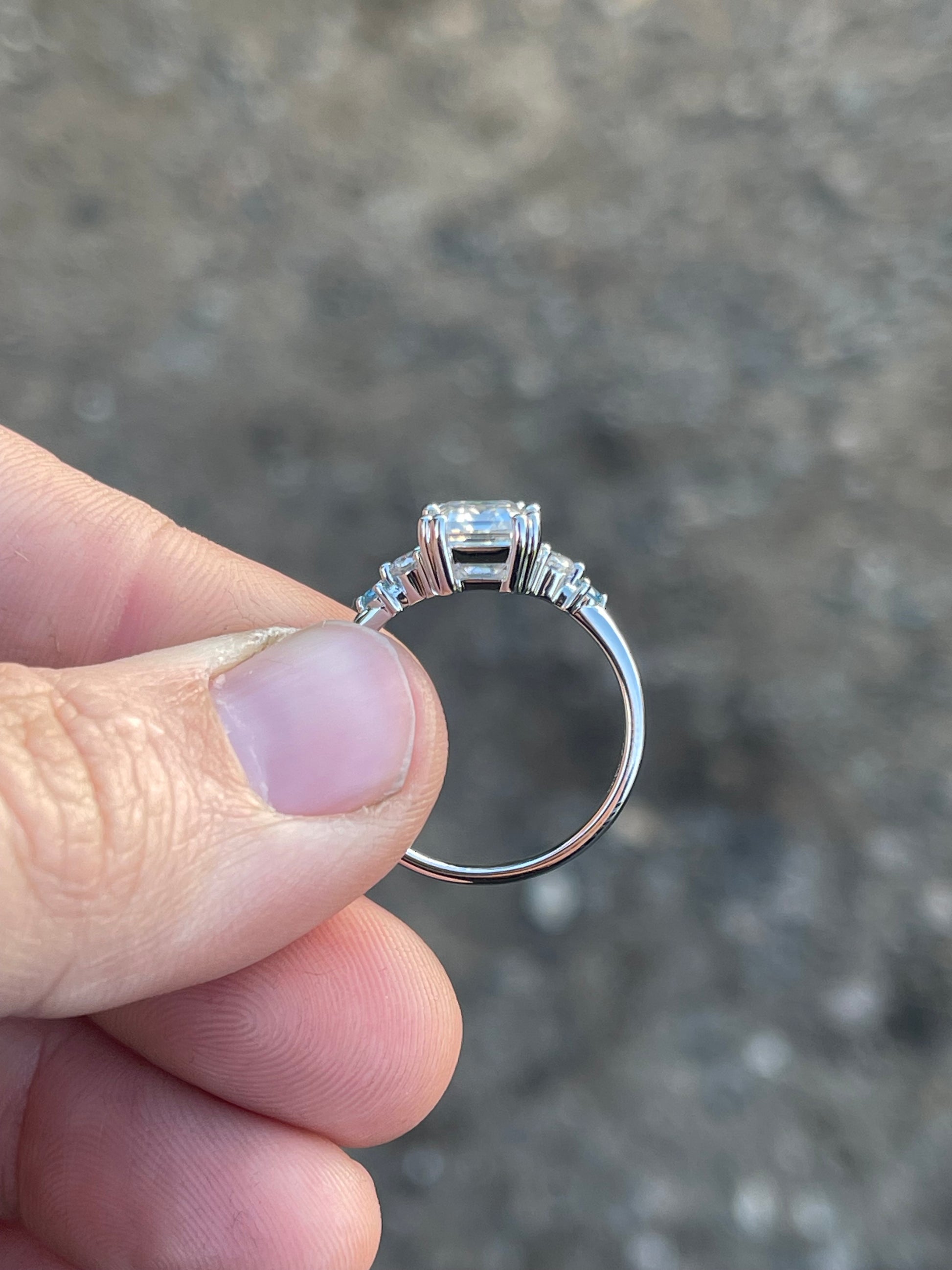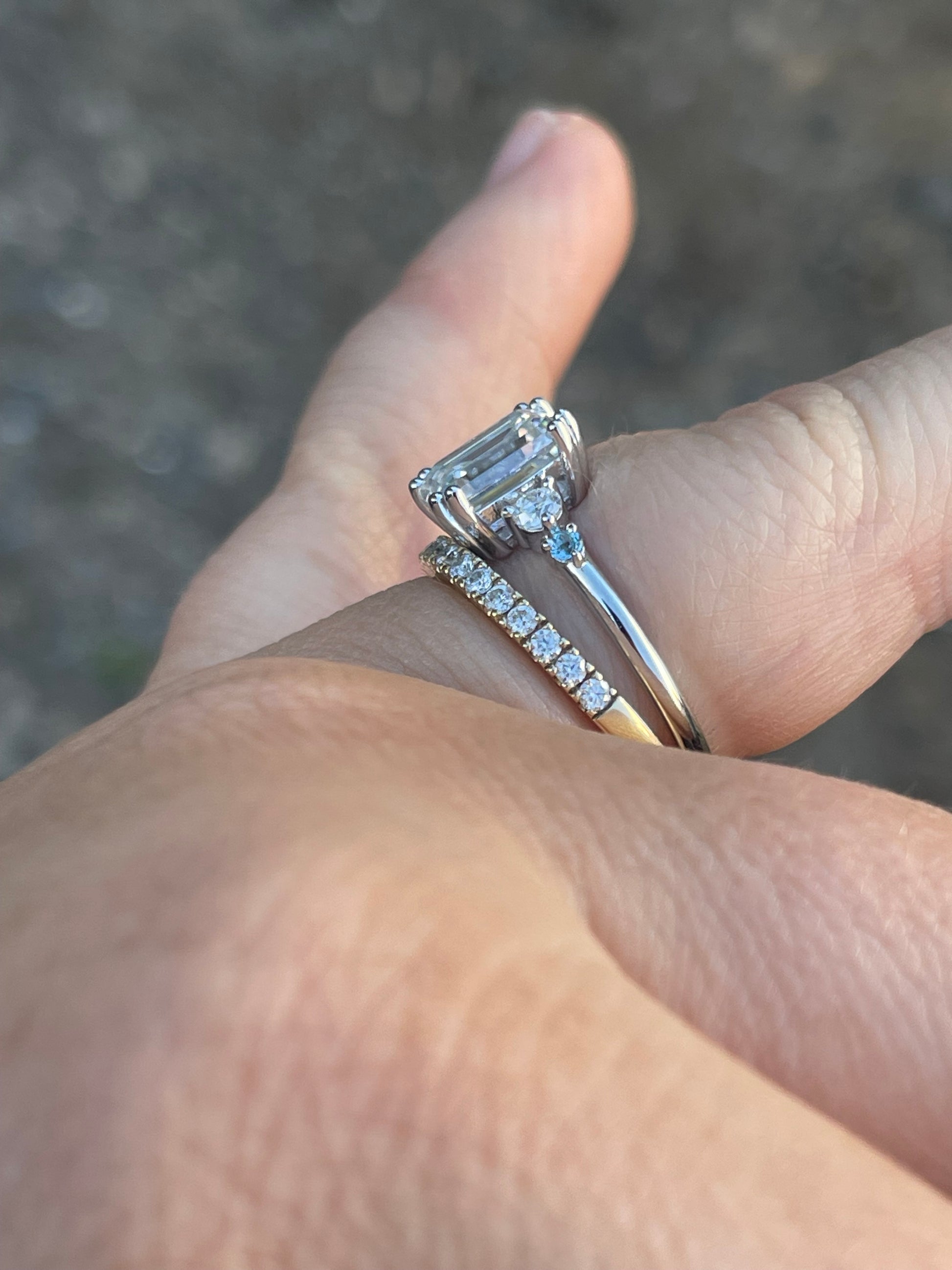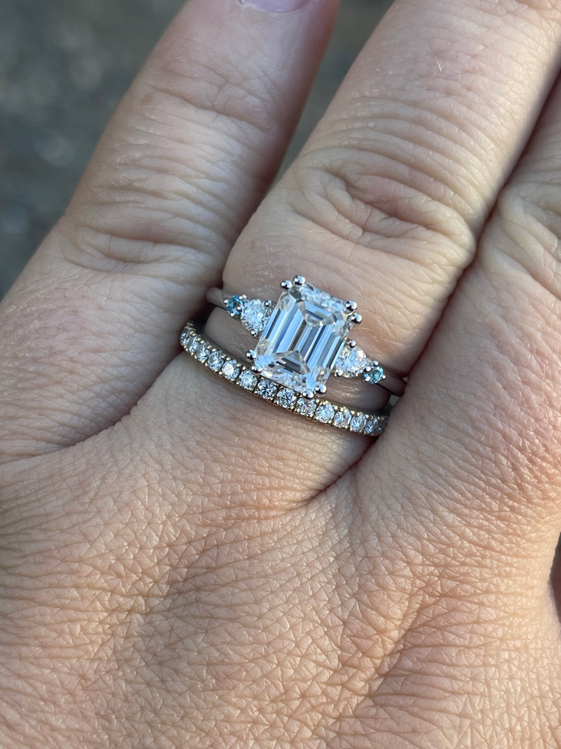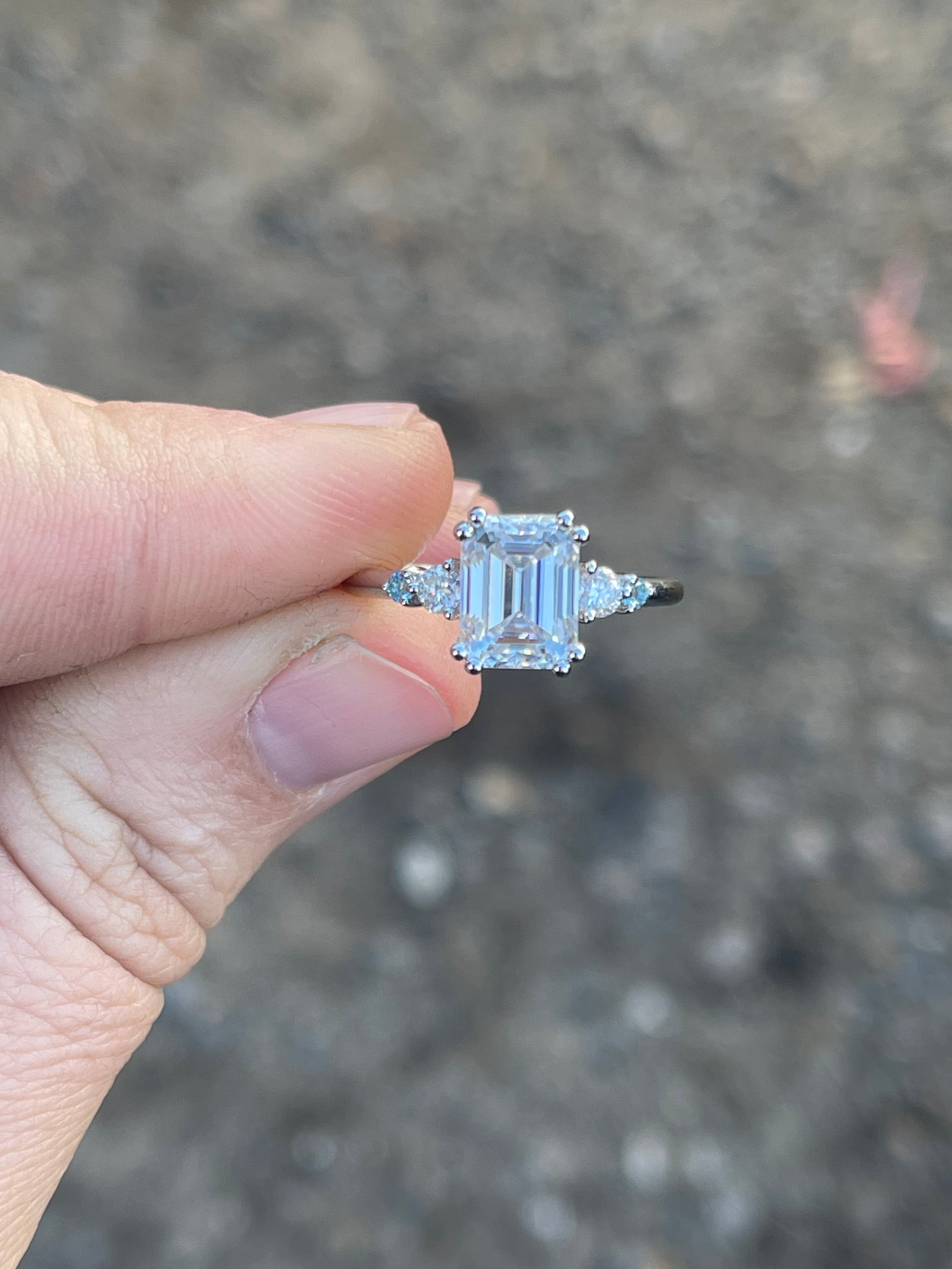 3ct Emerald Cut Moissanite with Blue Moissanite Side Stones with a 2.5mm Smooth Band