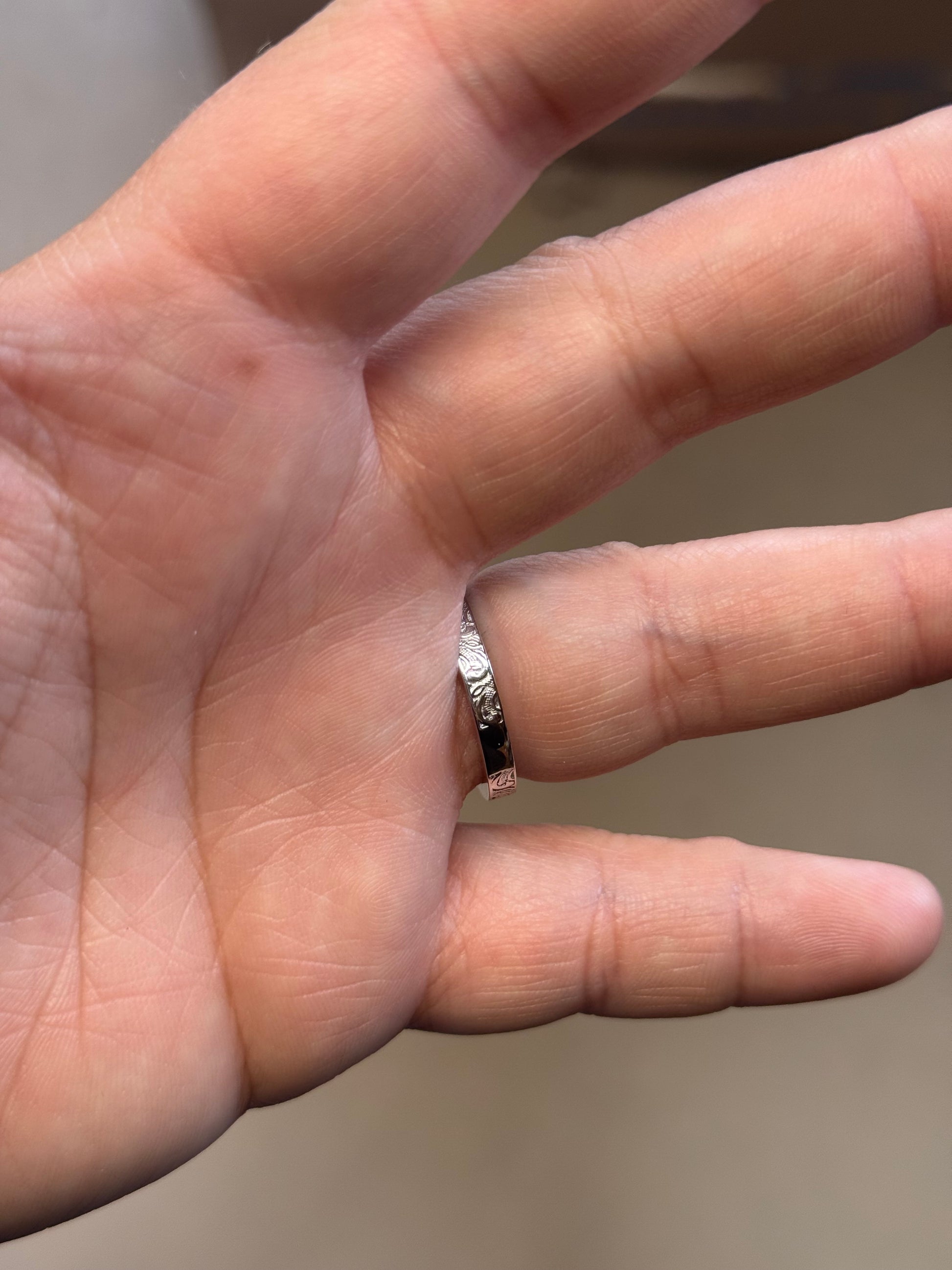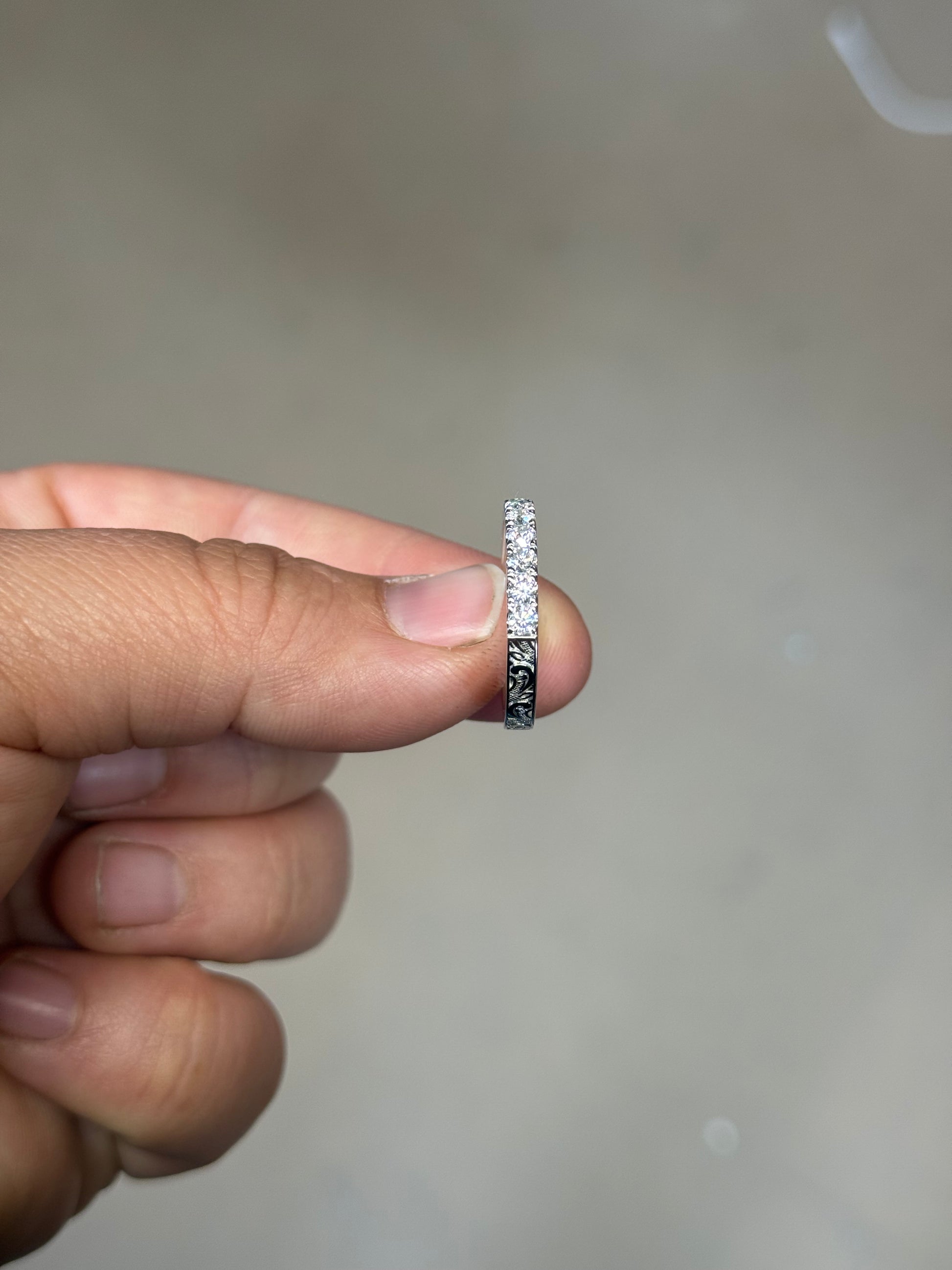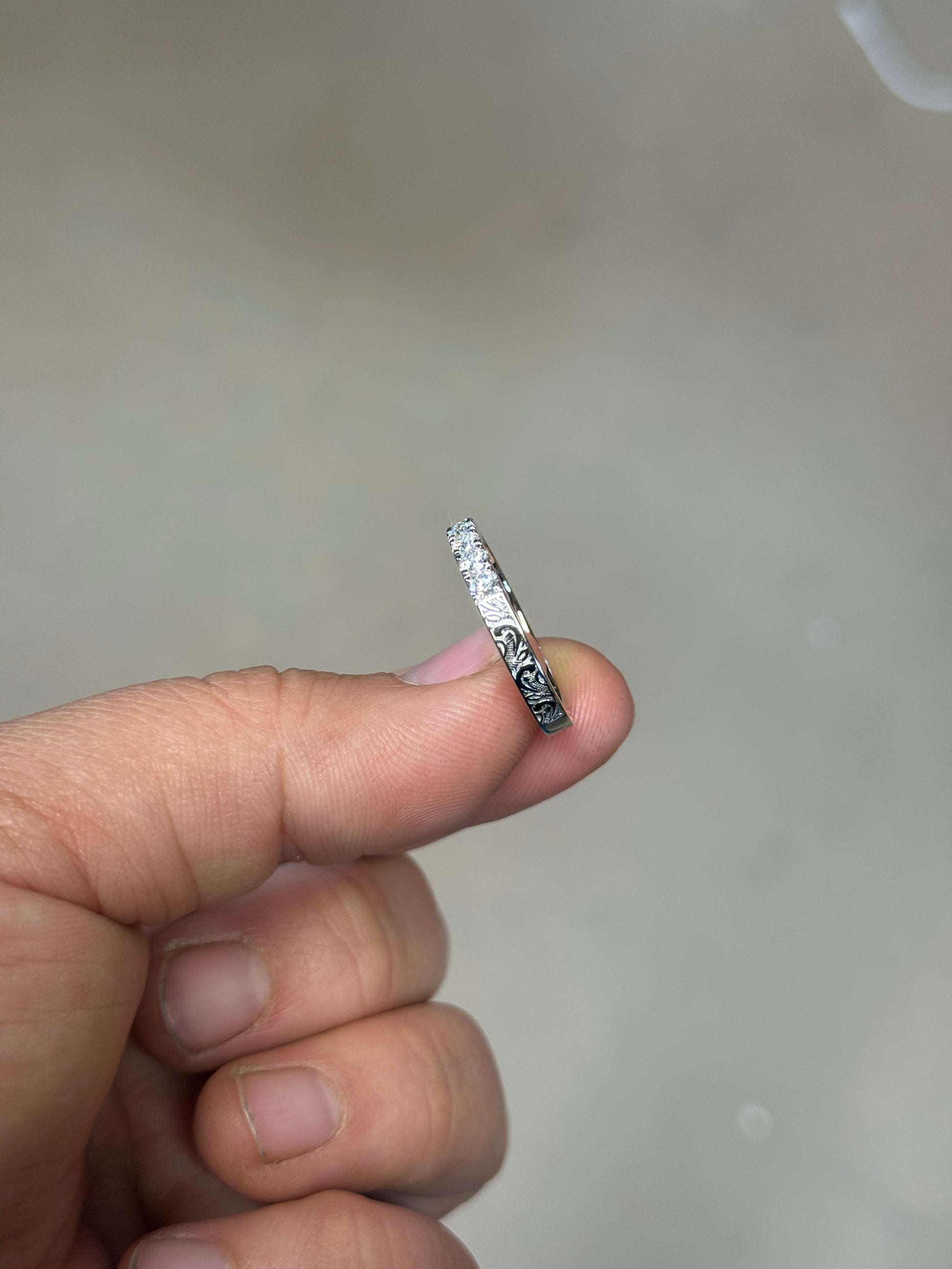 3mm Pattern Wedding Band with 2.8mm Round Cut French Pave Set Moissanite Stones.
