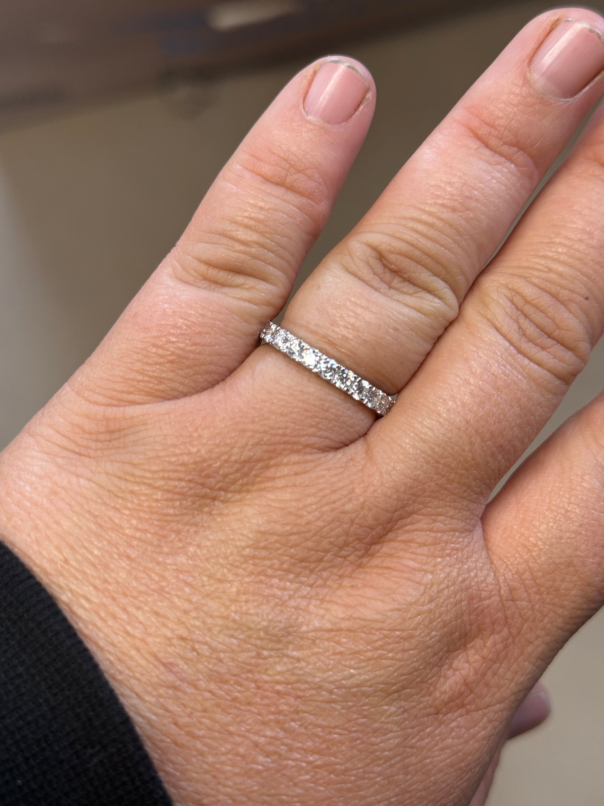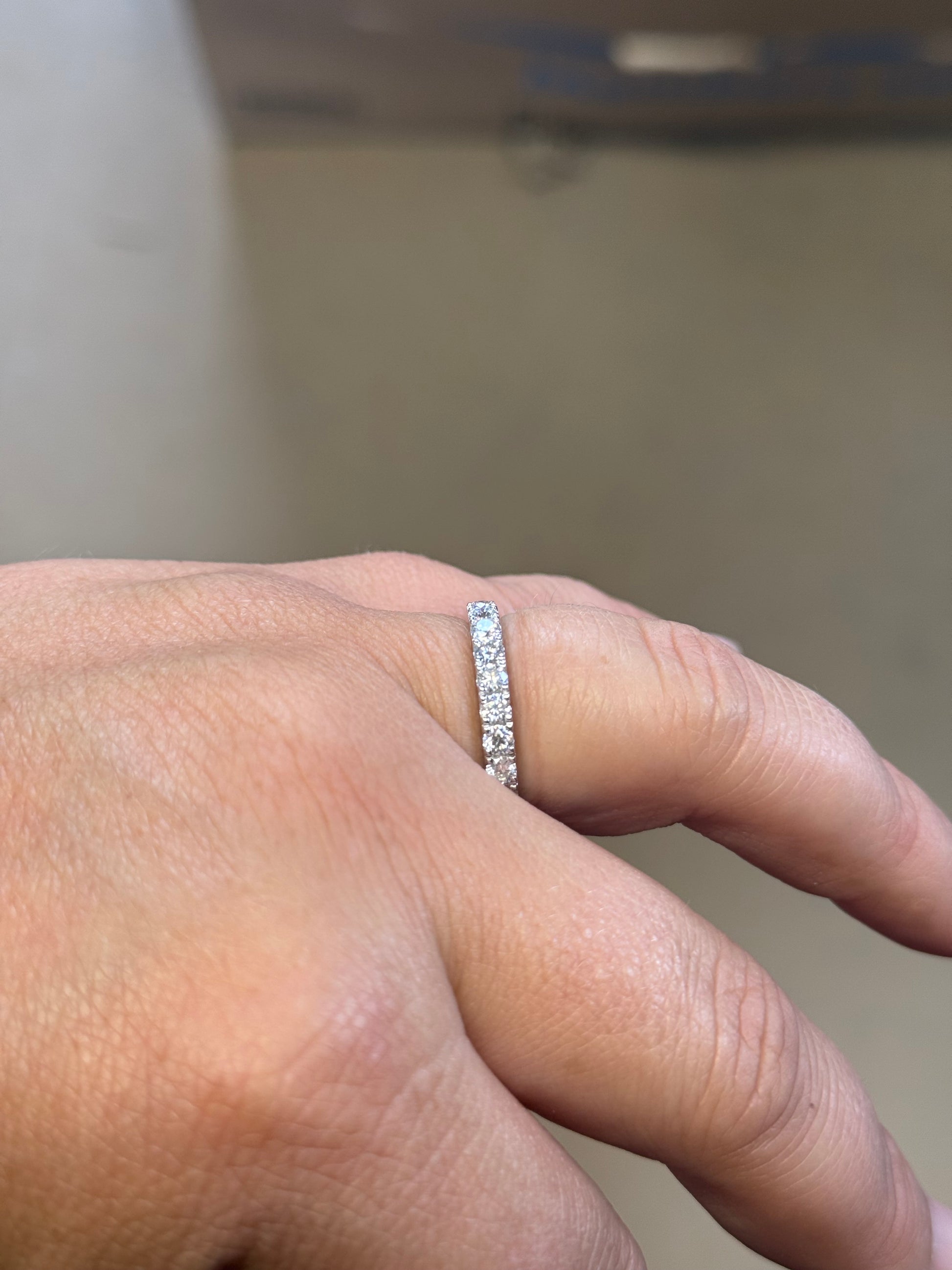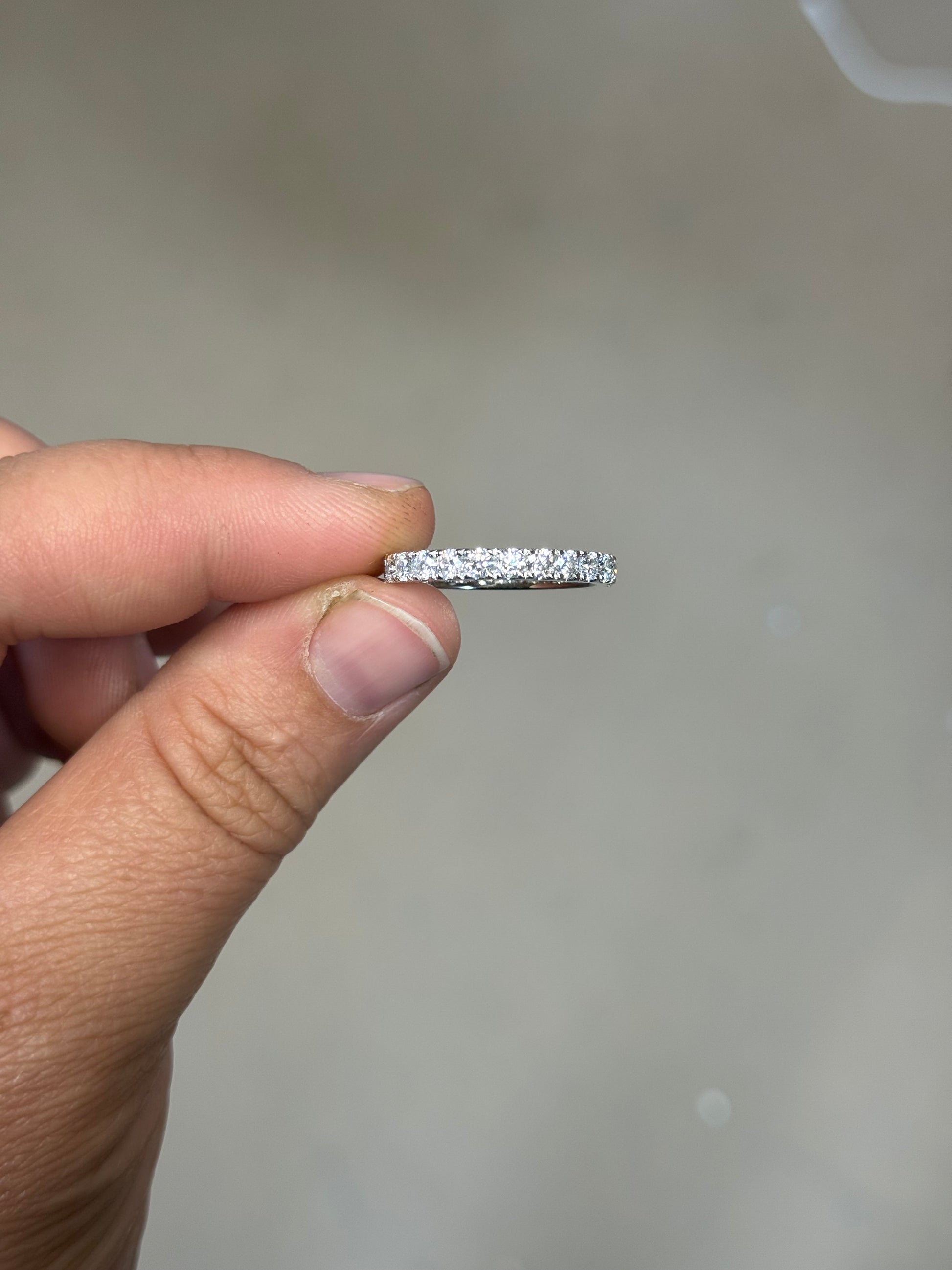 3mm Pattern Wedding Band with 2.8mm Round Cut French Pave Set Moissanite Stones.