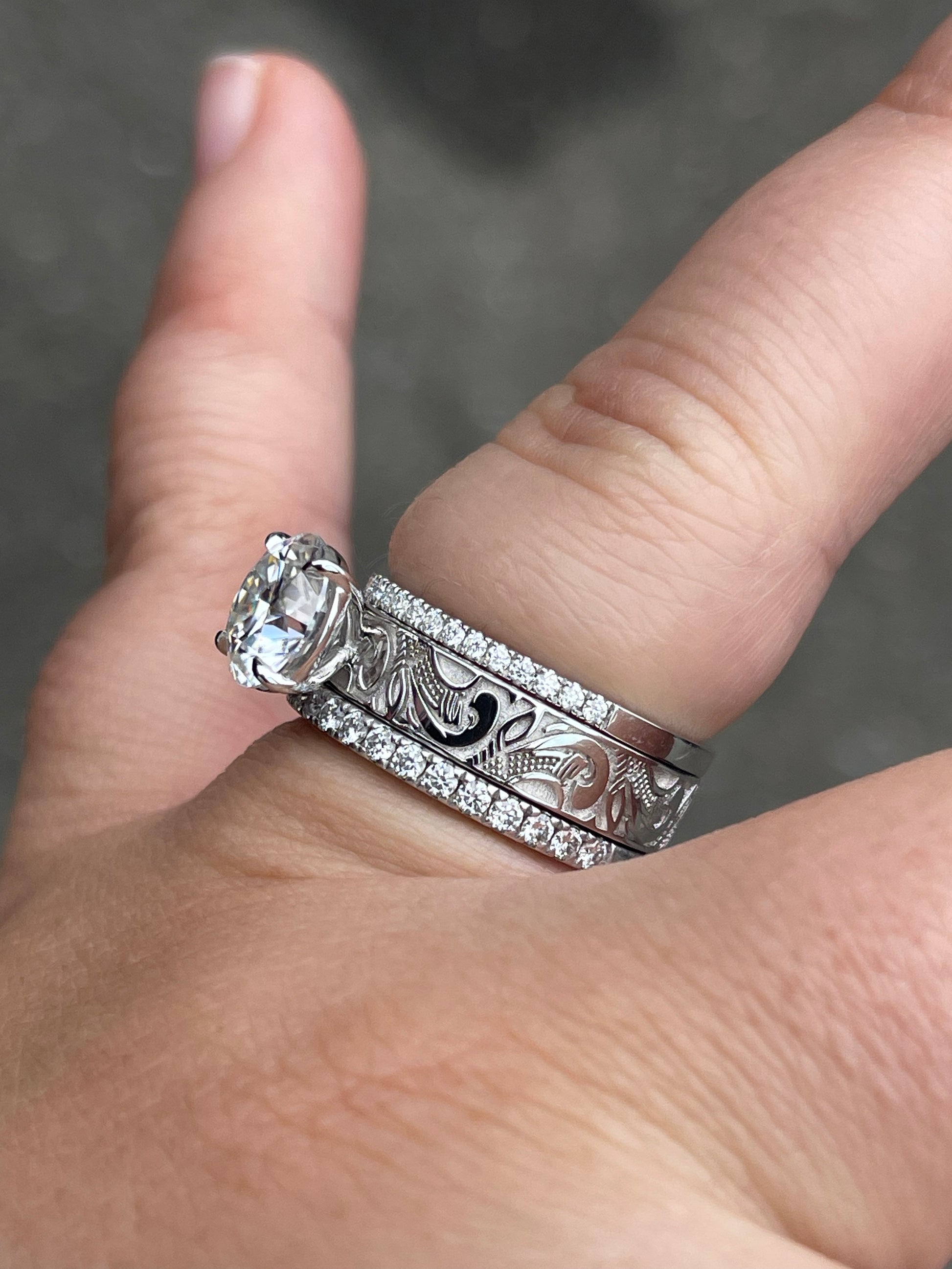 3CT Round Cut Moissanite Brielle Engagement Ring ($450, $1,600) with 2 Rylee Bands ($400, $900).