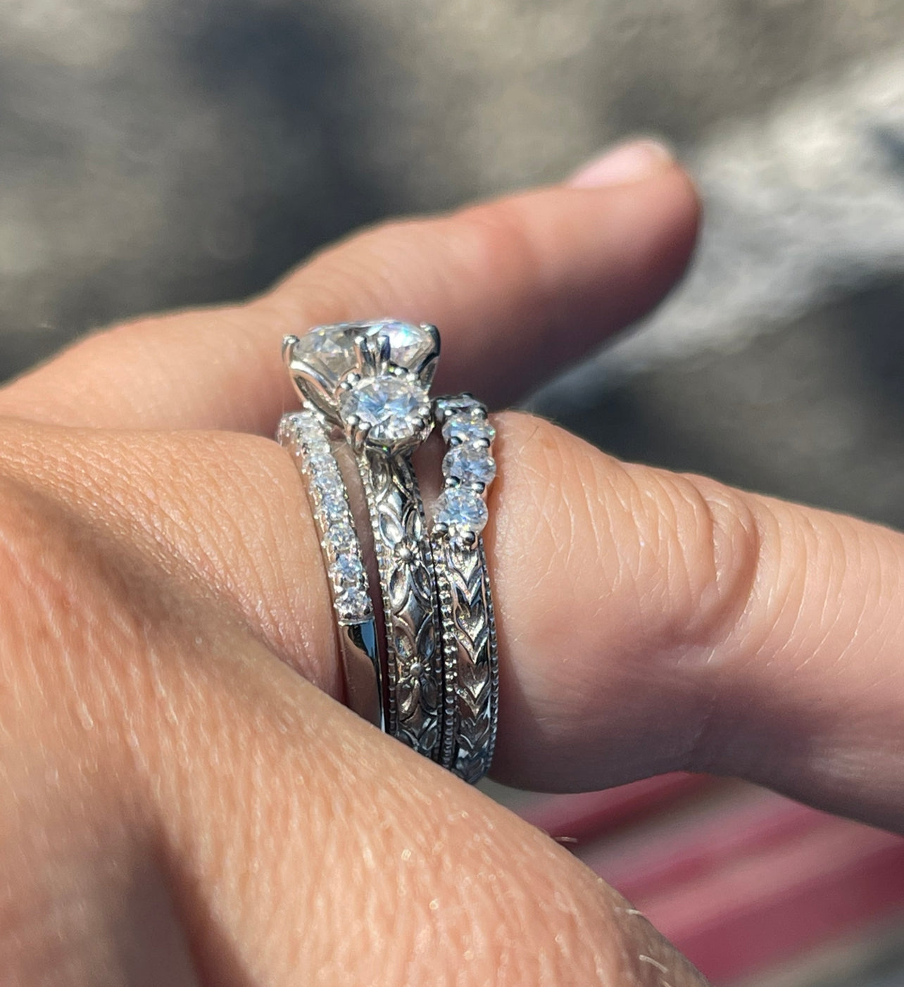 3 Stone Round Cut Moissanite Brittany Engagement Ring ($300, $900) with 1 Mae Band ($250,$650) and 1 Rylee Band ($250, $600).