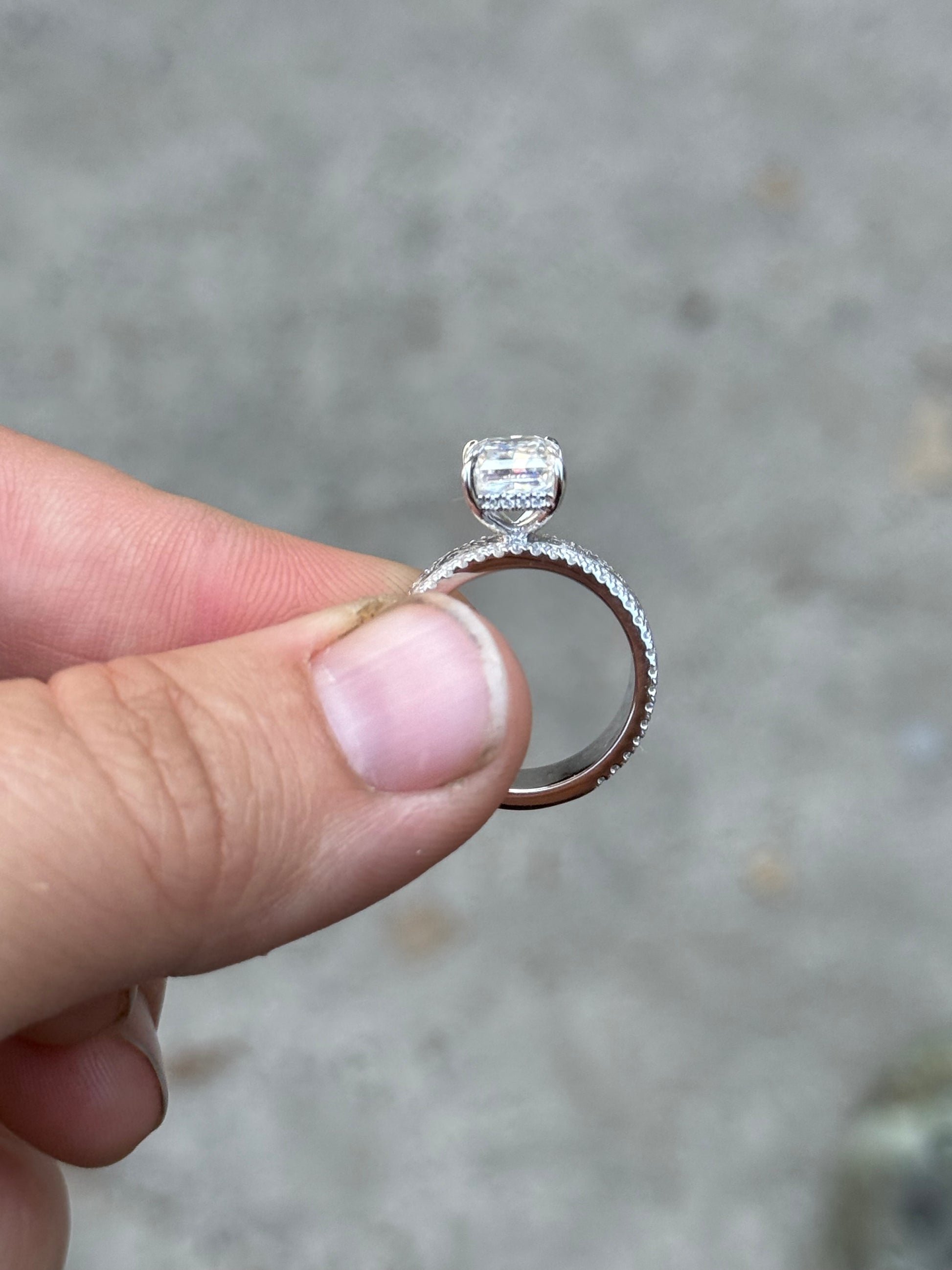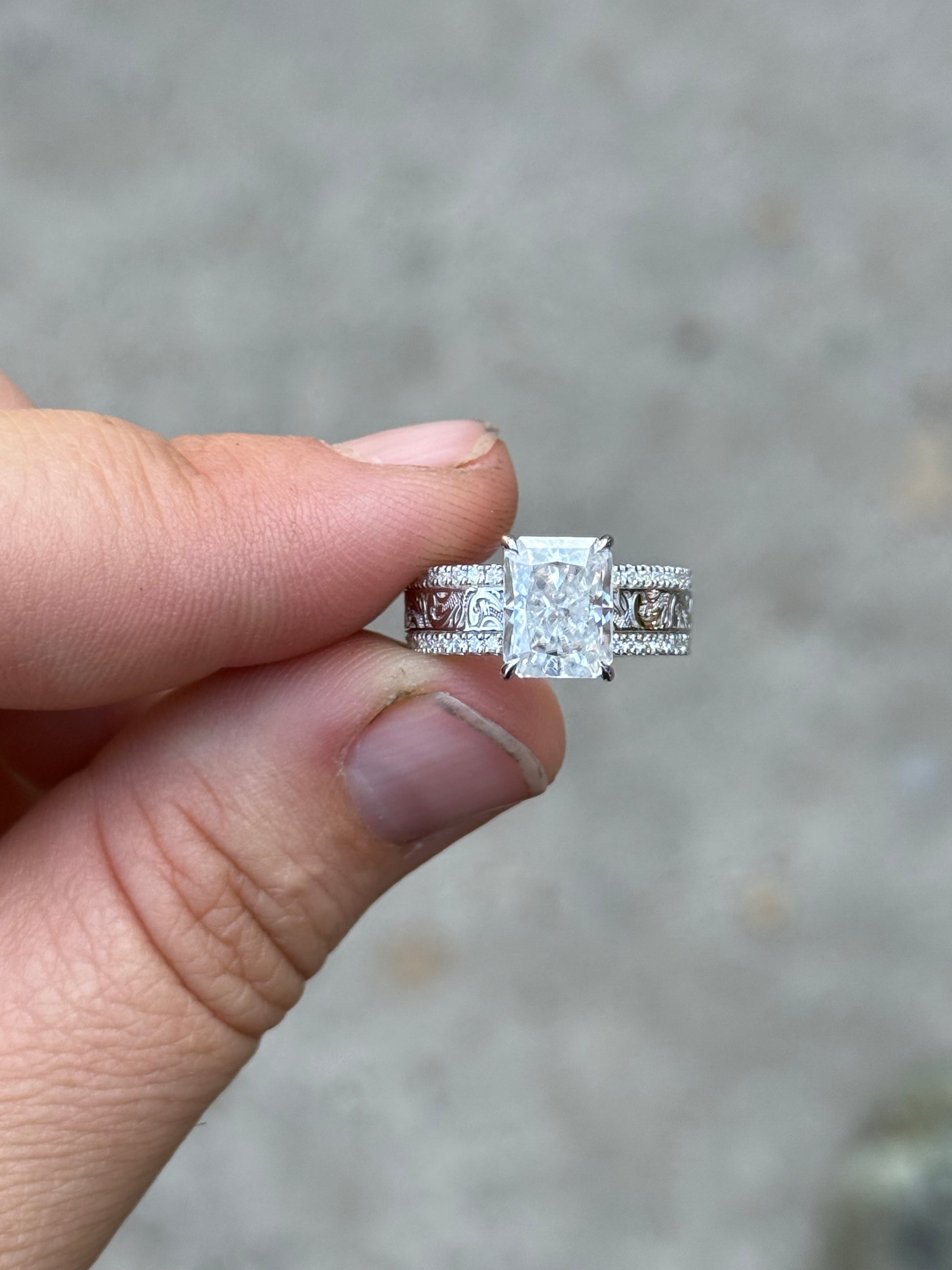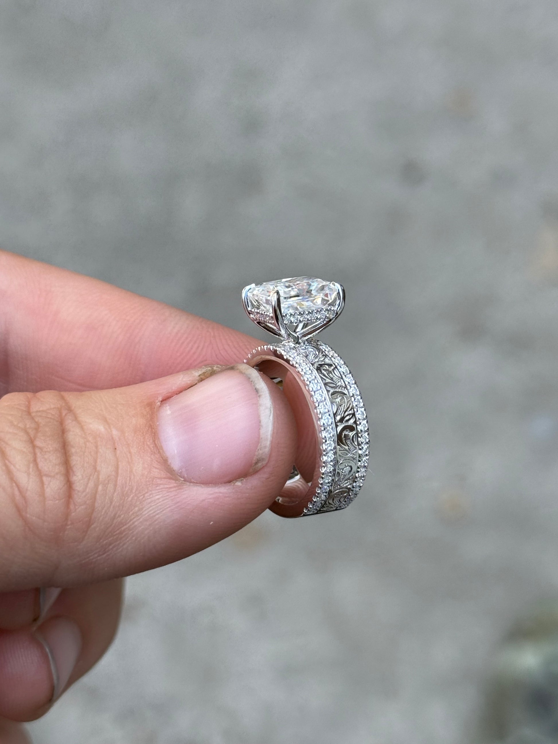 3ct Radiant Cut Moissanite with Hidden Halo on 5.8mm Pattern Band