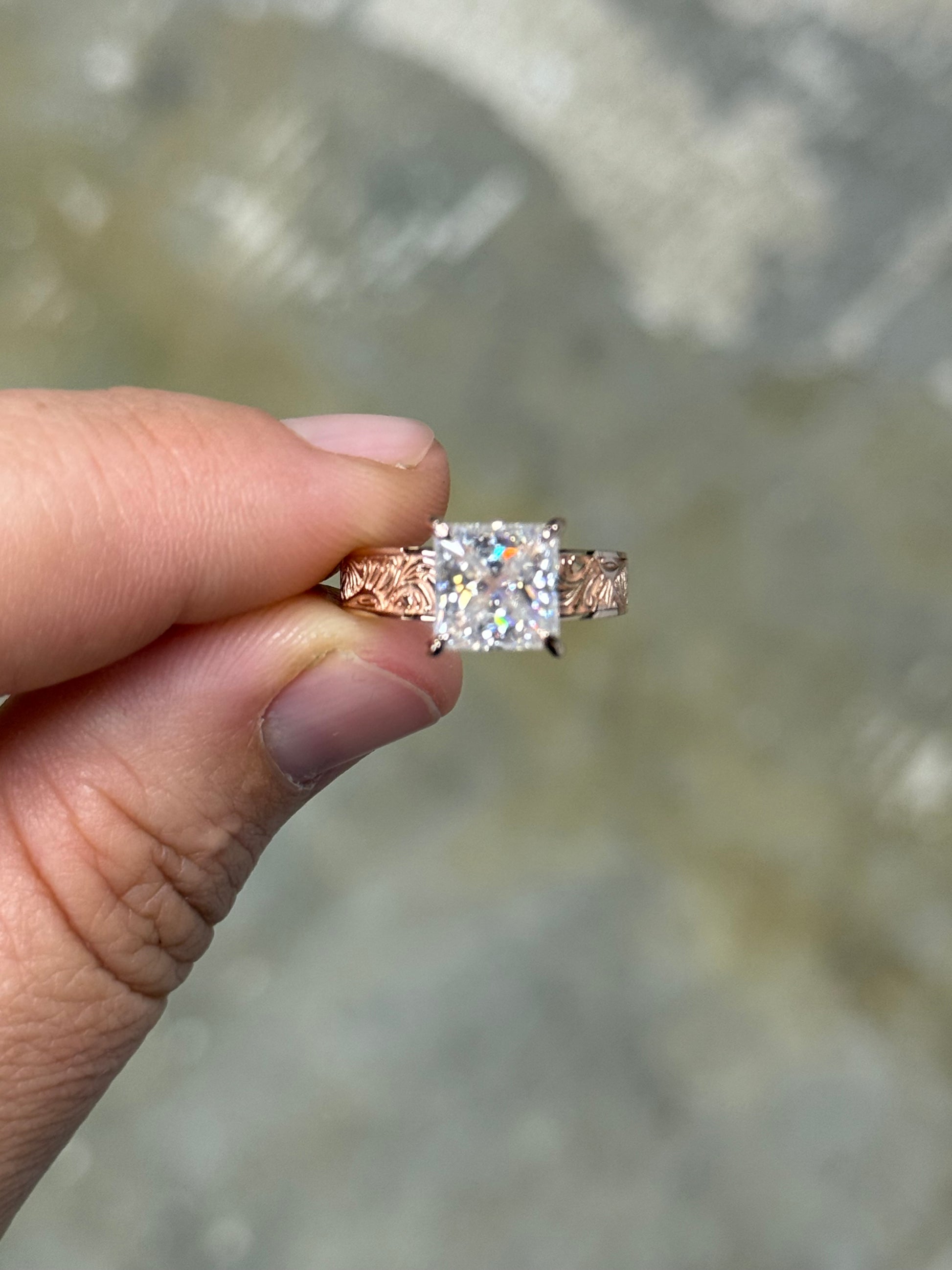 3ct Princess Cut Elk Antler Moissanite with 5mm to 3mm Tapered Pattern Band