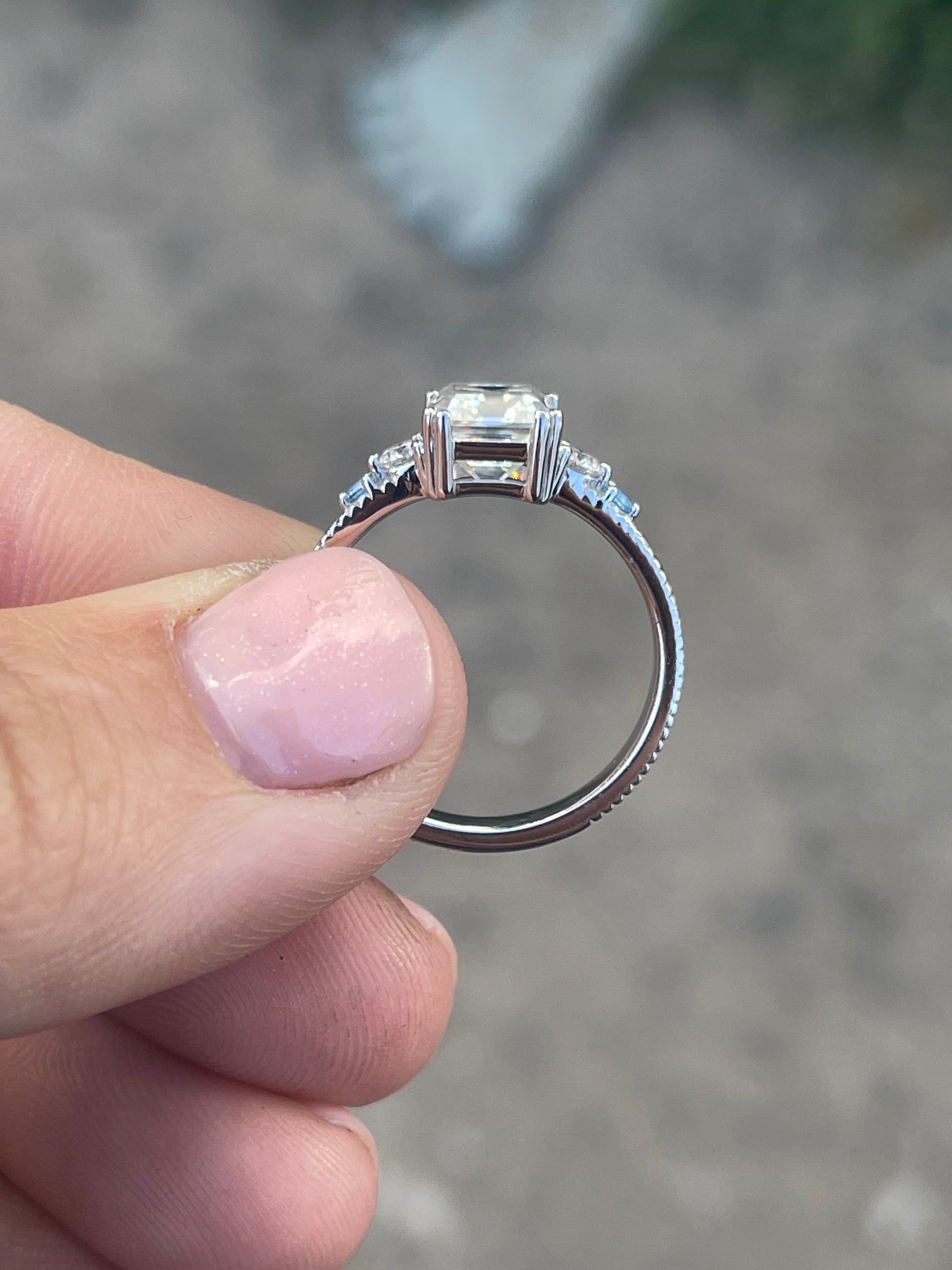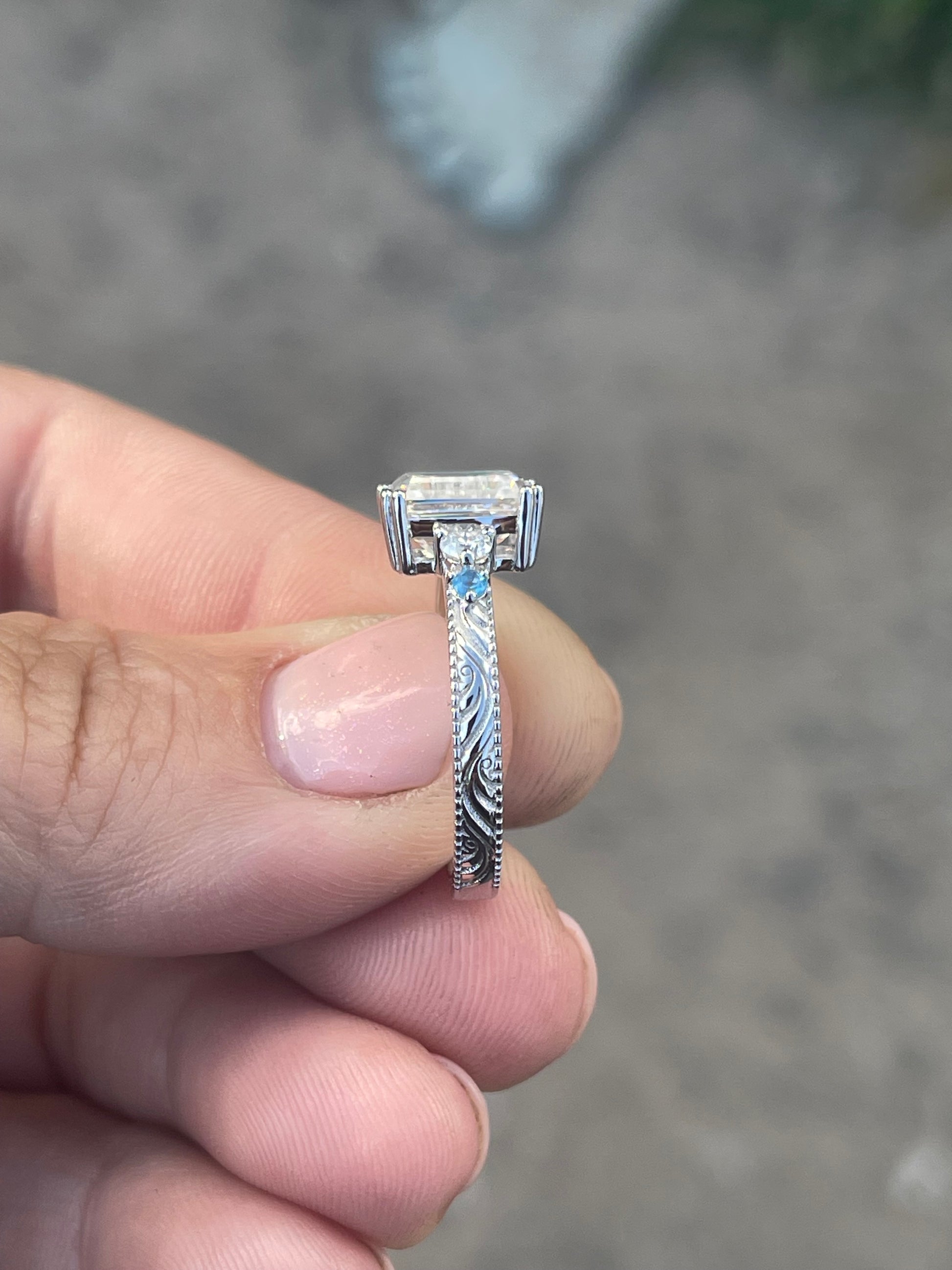 3ct Emerald Cut Moissanite with Blue Moissanite Side Stones with a 3mm Pattern Band