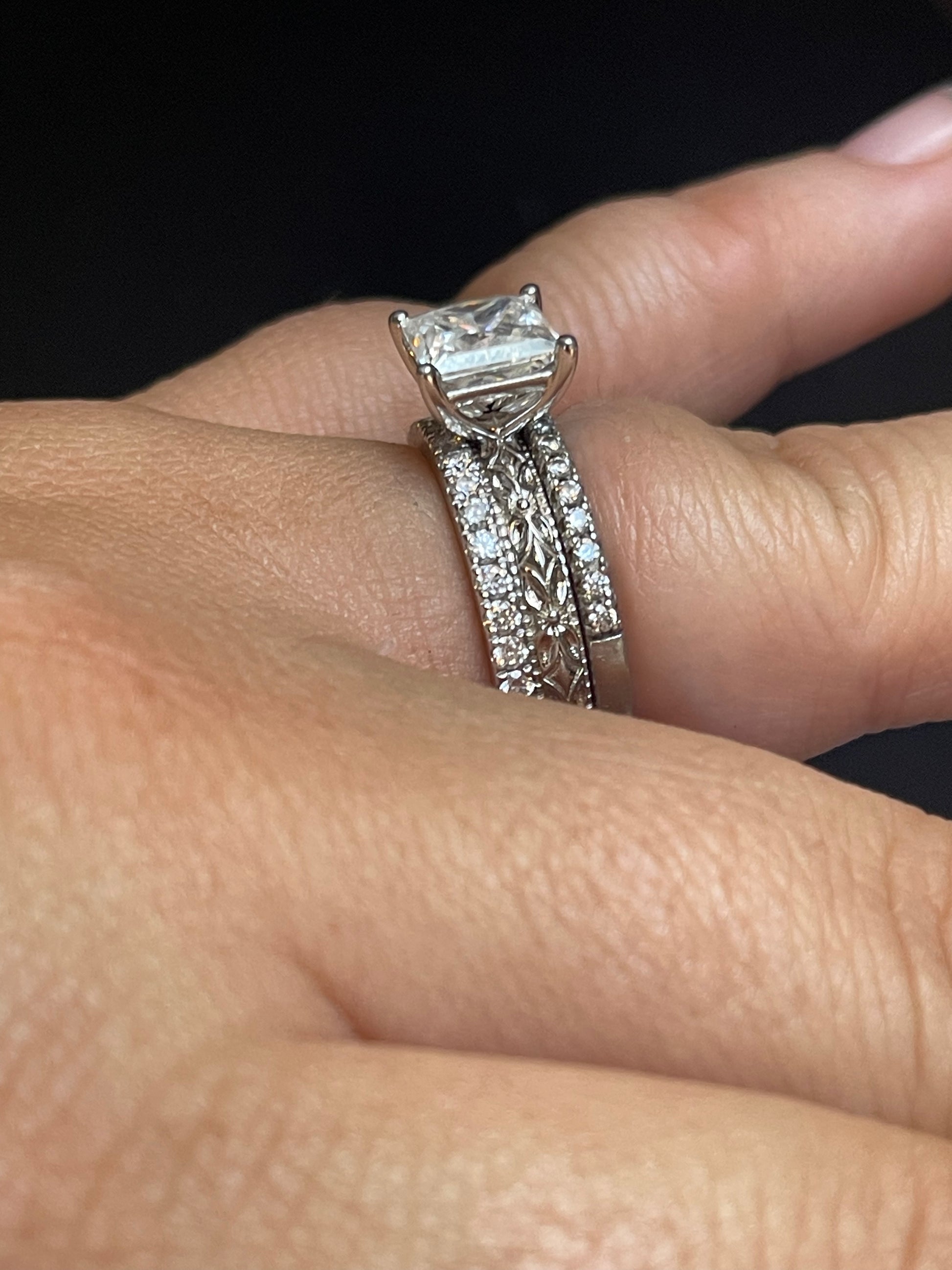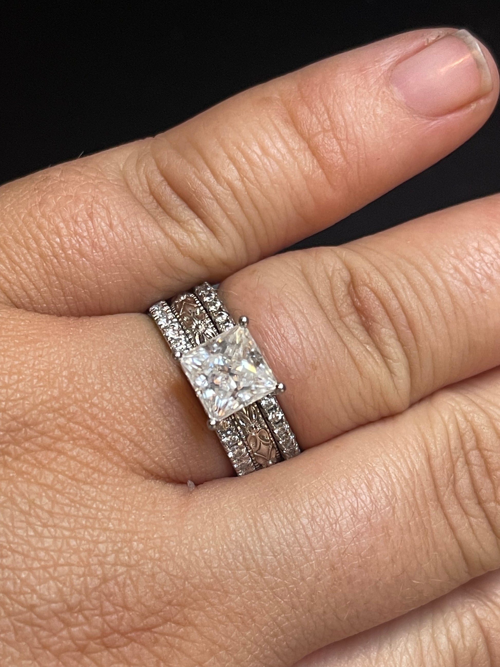 3CT Princess Cut Moissanite Ember Engagement Ring ($400, $950) with 2 Rylee Bands ($400, $900).