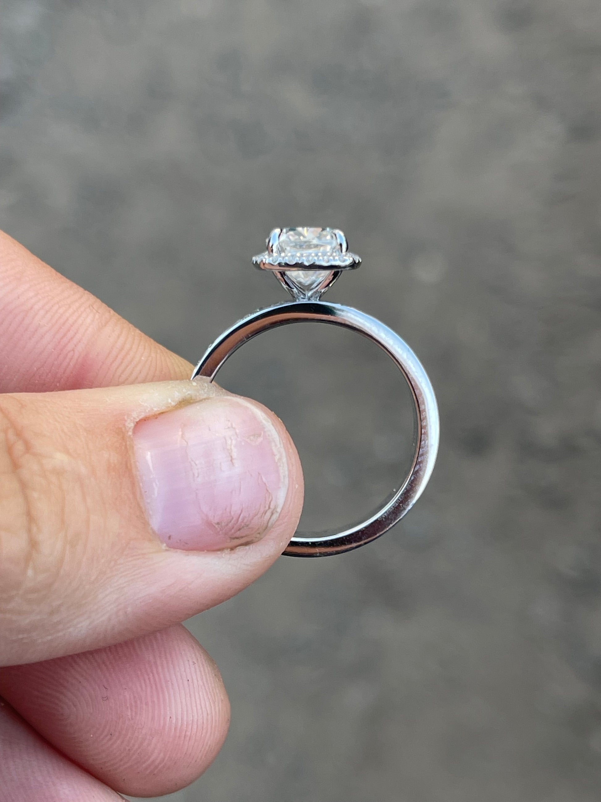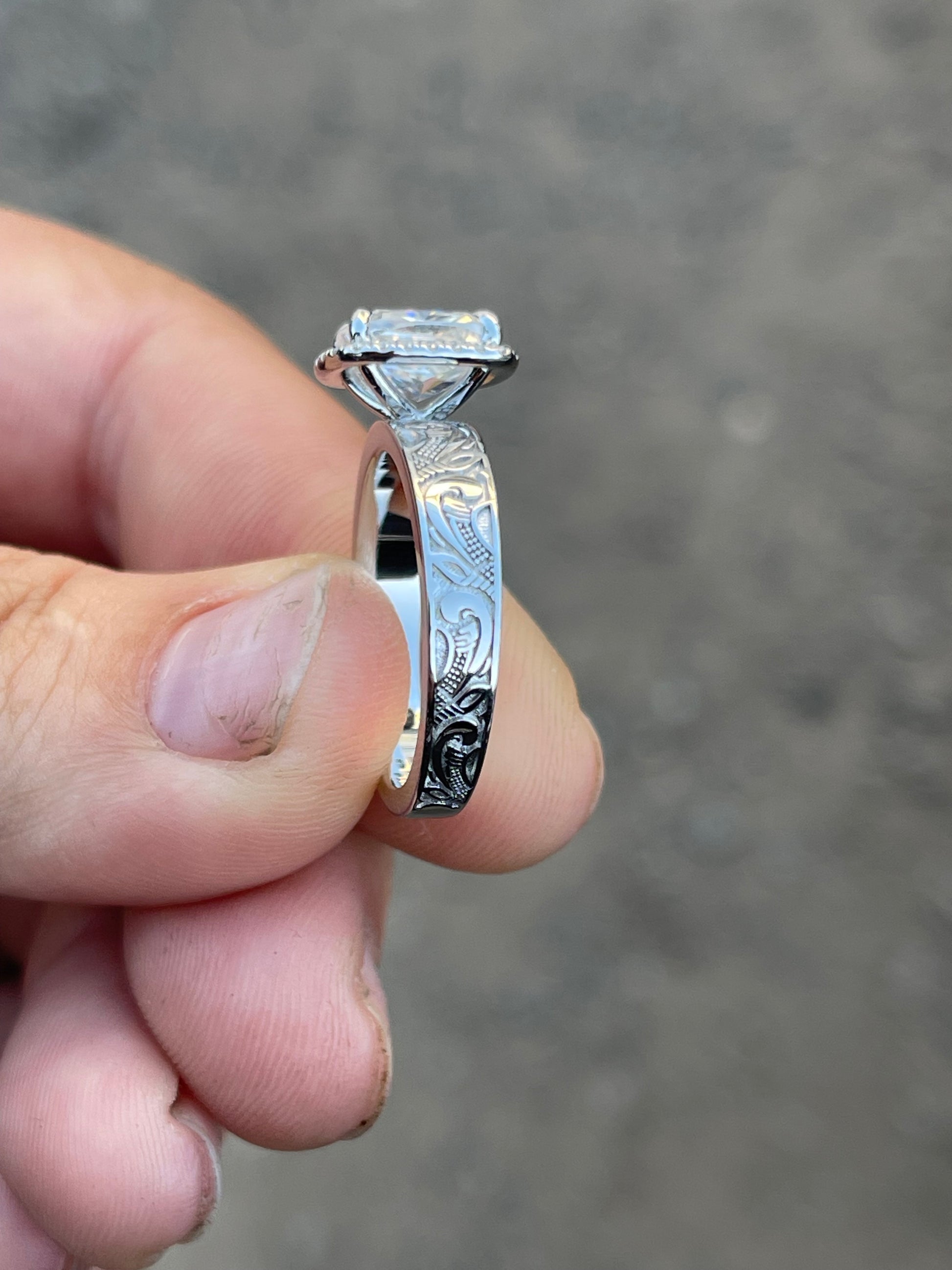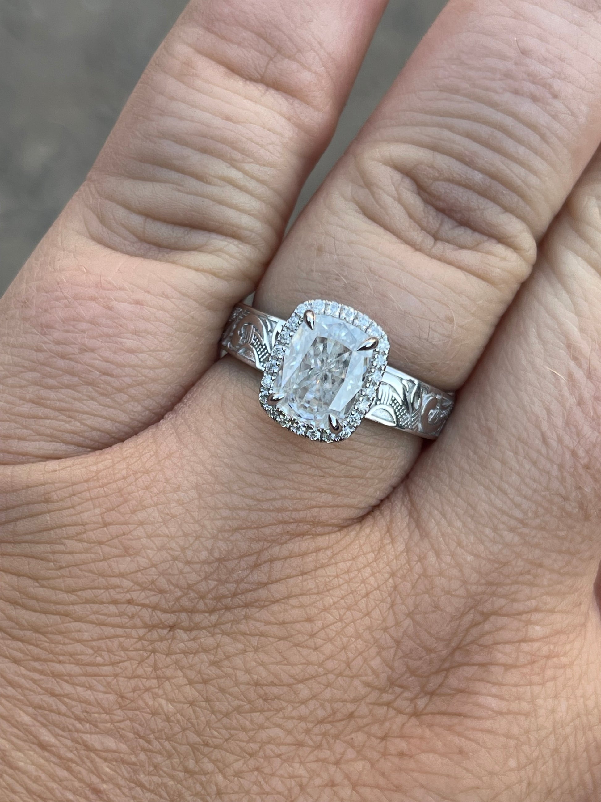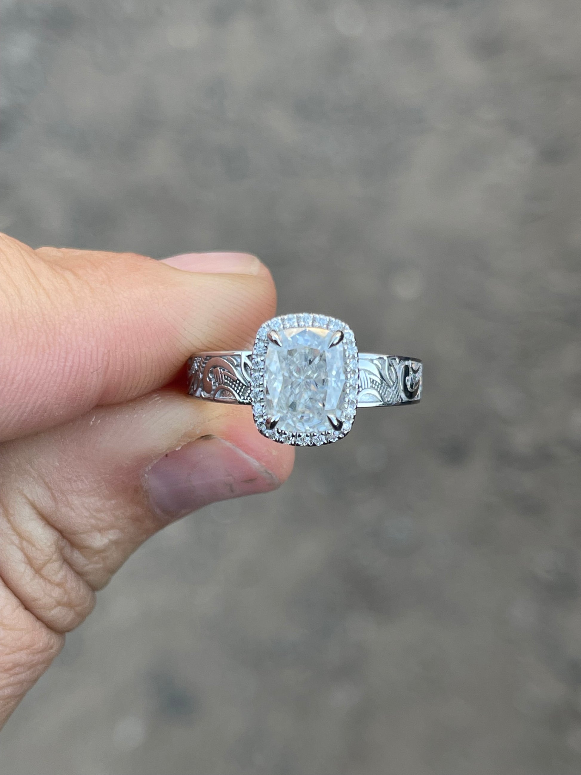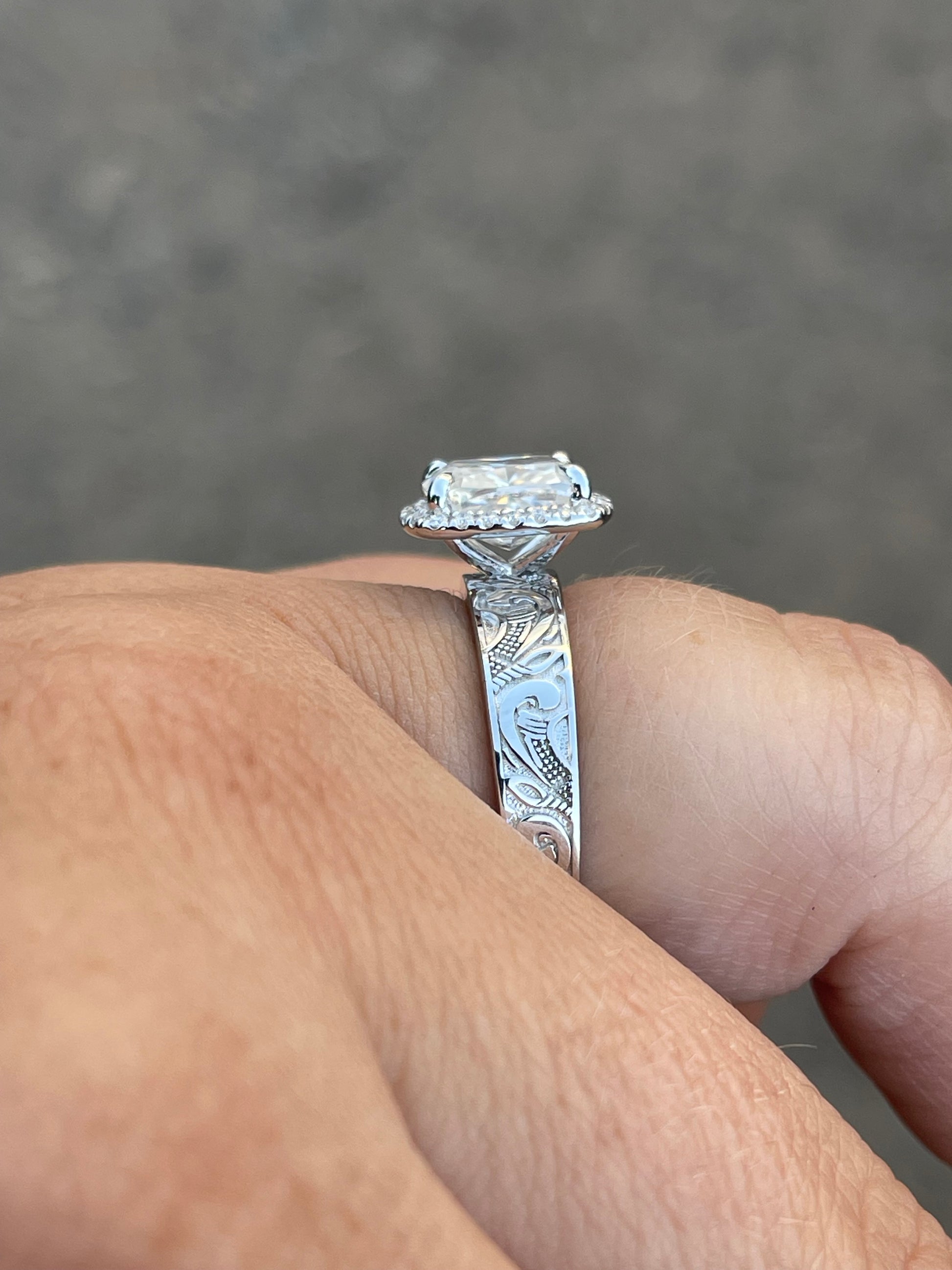 3ct Cushion Cut Moissanite in a Halo Setting with a 5mm to 3mm Tapered Pattern Band