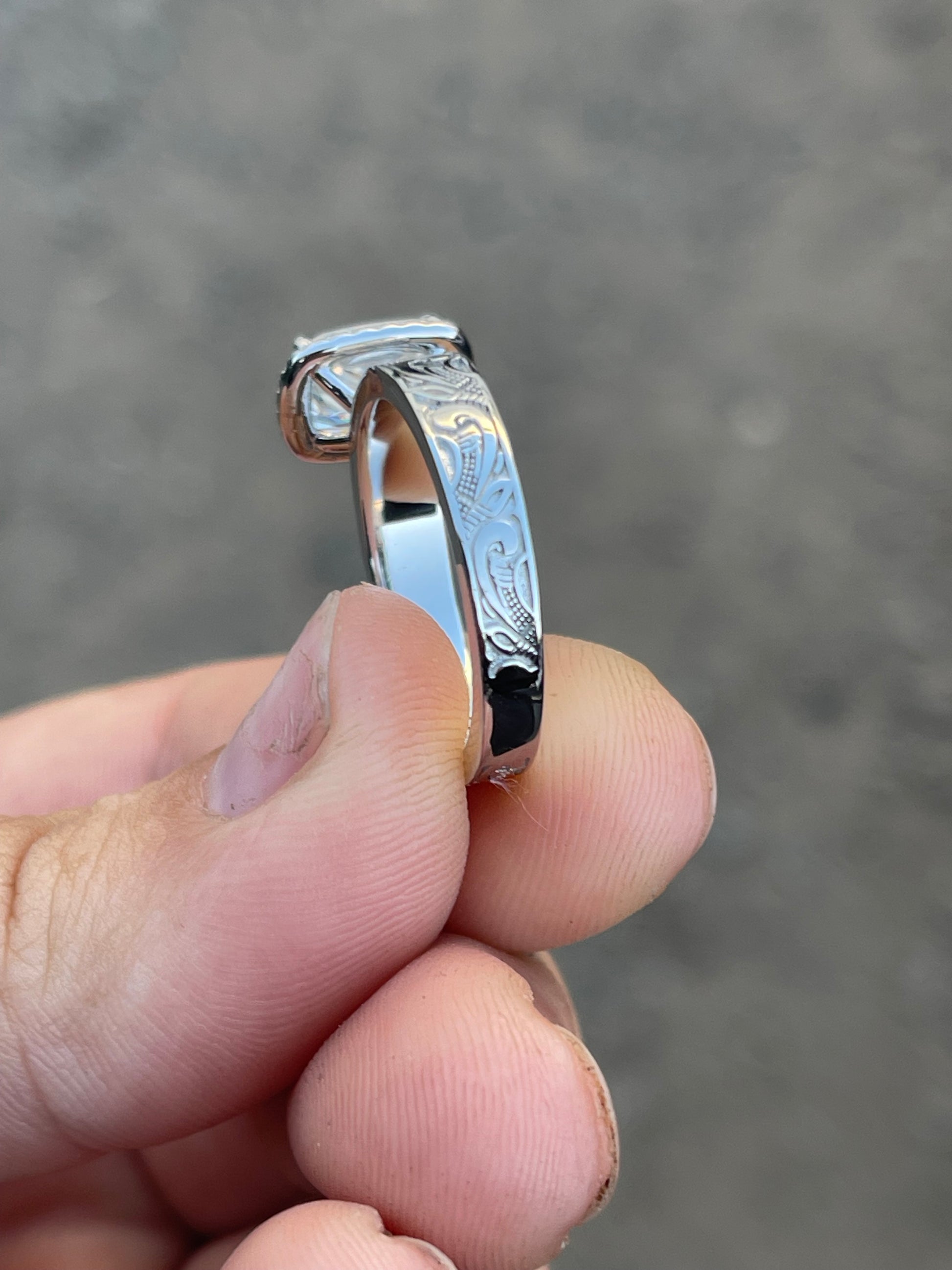 **Sterling Silver can react with chemicals found in air and produce tarnish and oxidize; high moisture levels, exposure to sunlight and contaminants such as salt water increase this reaction. Properly care for ring by polishing with polish & a clean cotton cloth.