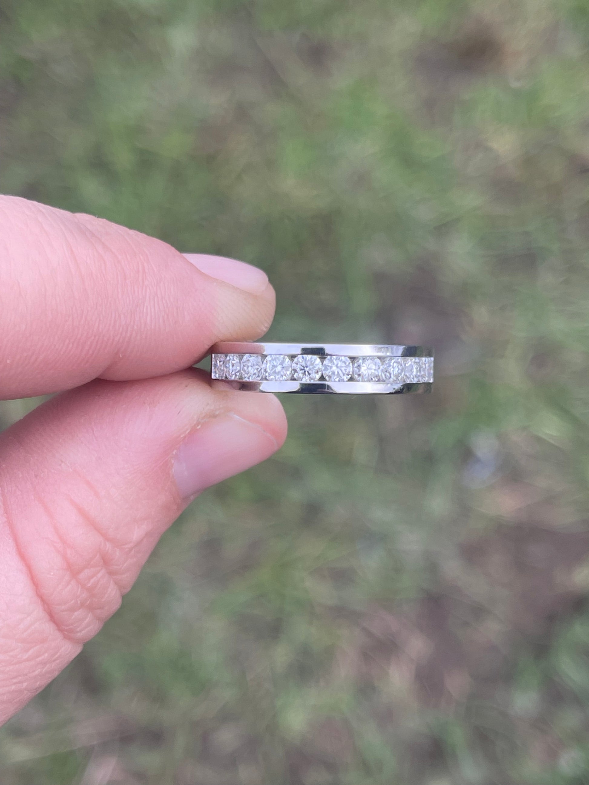 5mm Smooth Wedding Band with 3mm Channel Set Moissanite Stones in 10K and 14K Solid Yellow, Rose or White Gold.