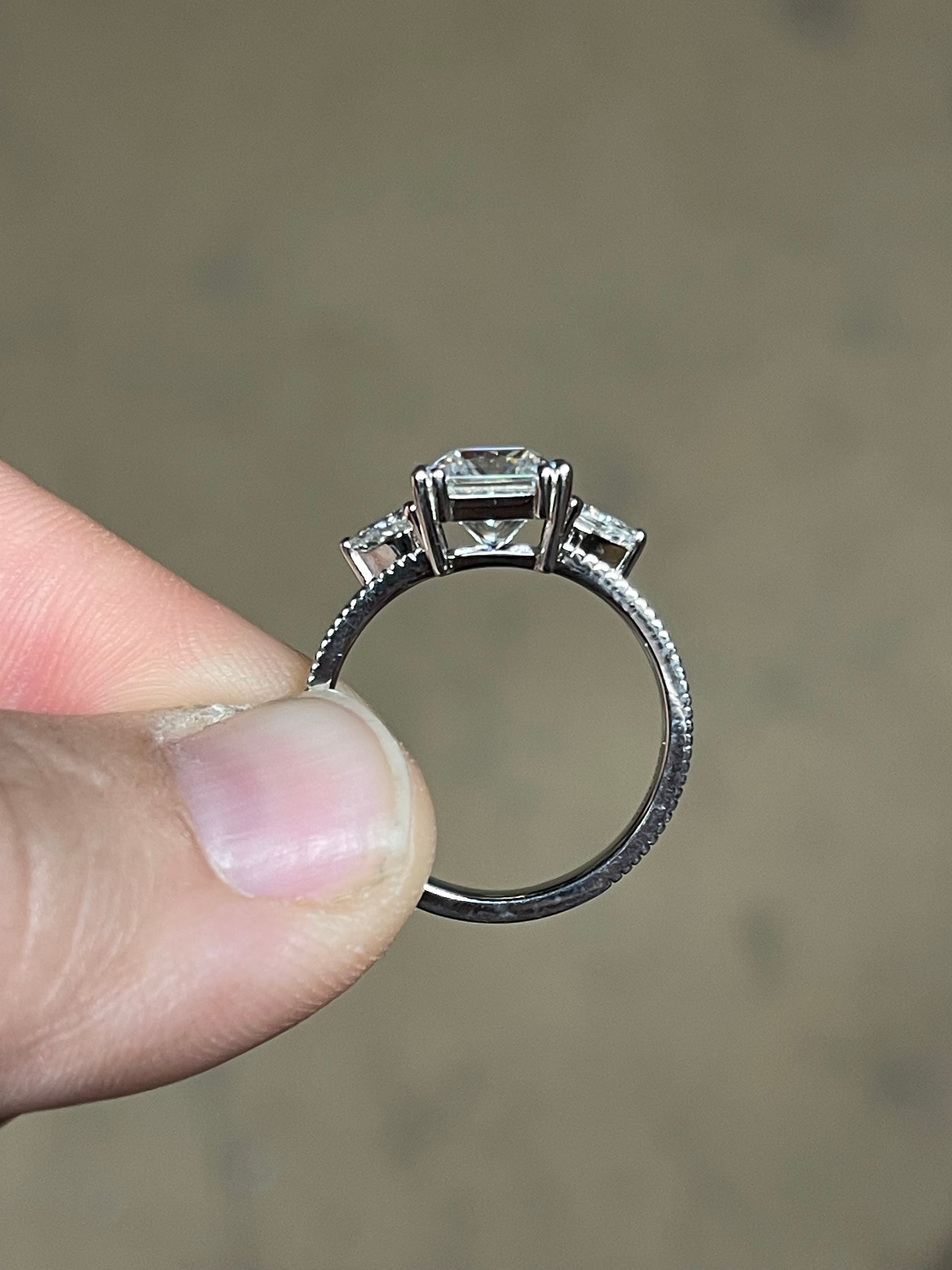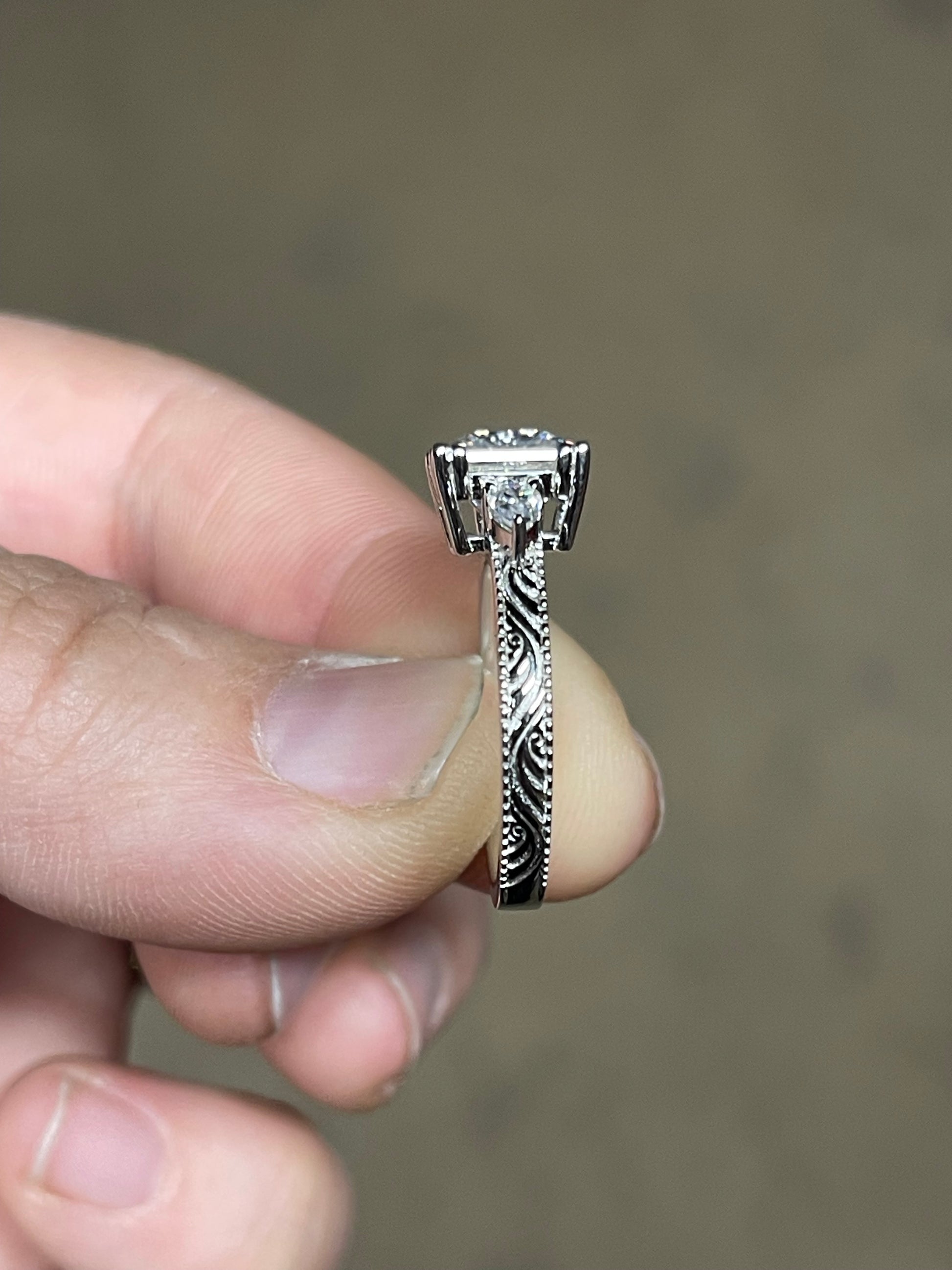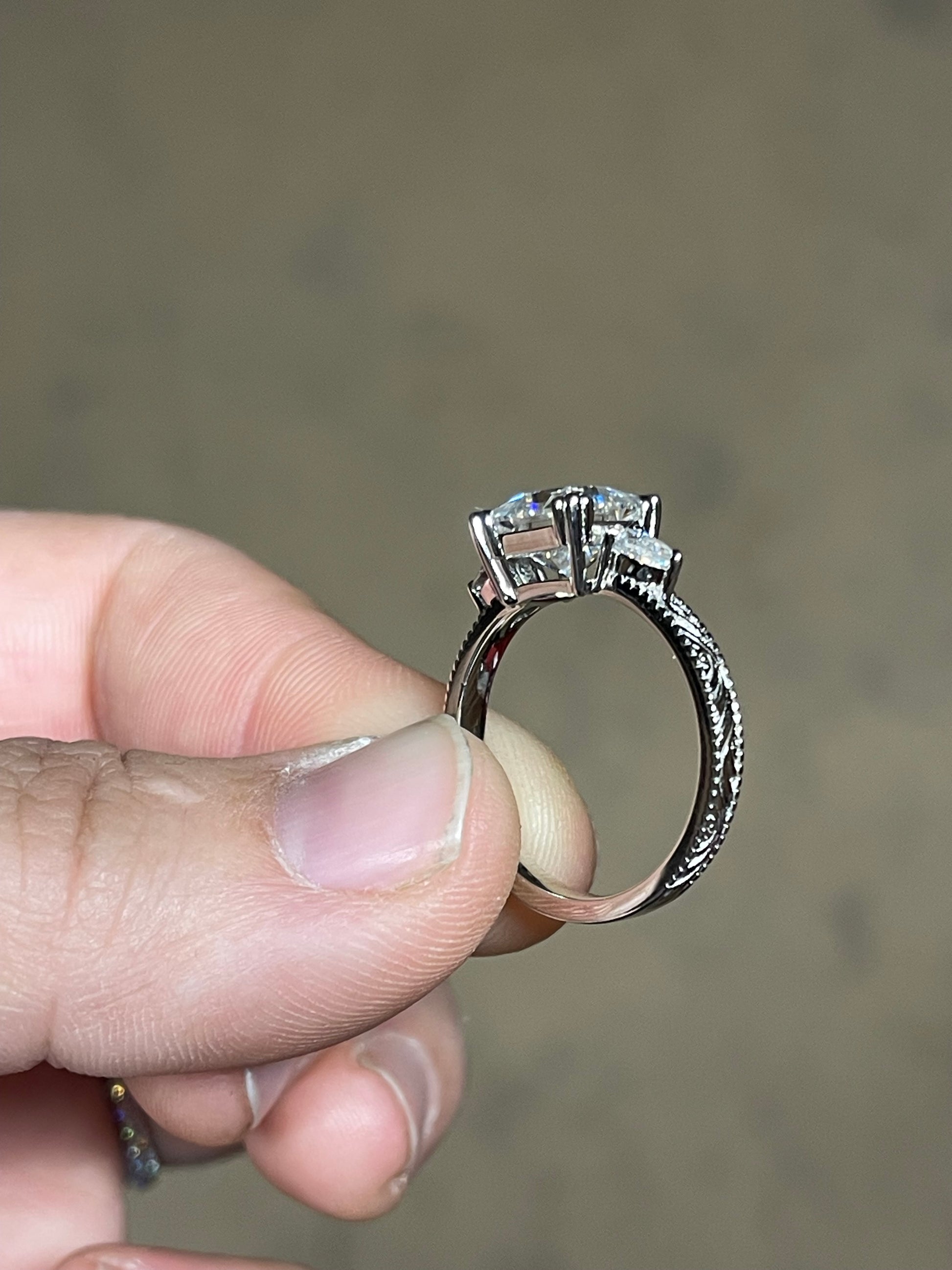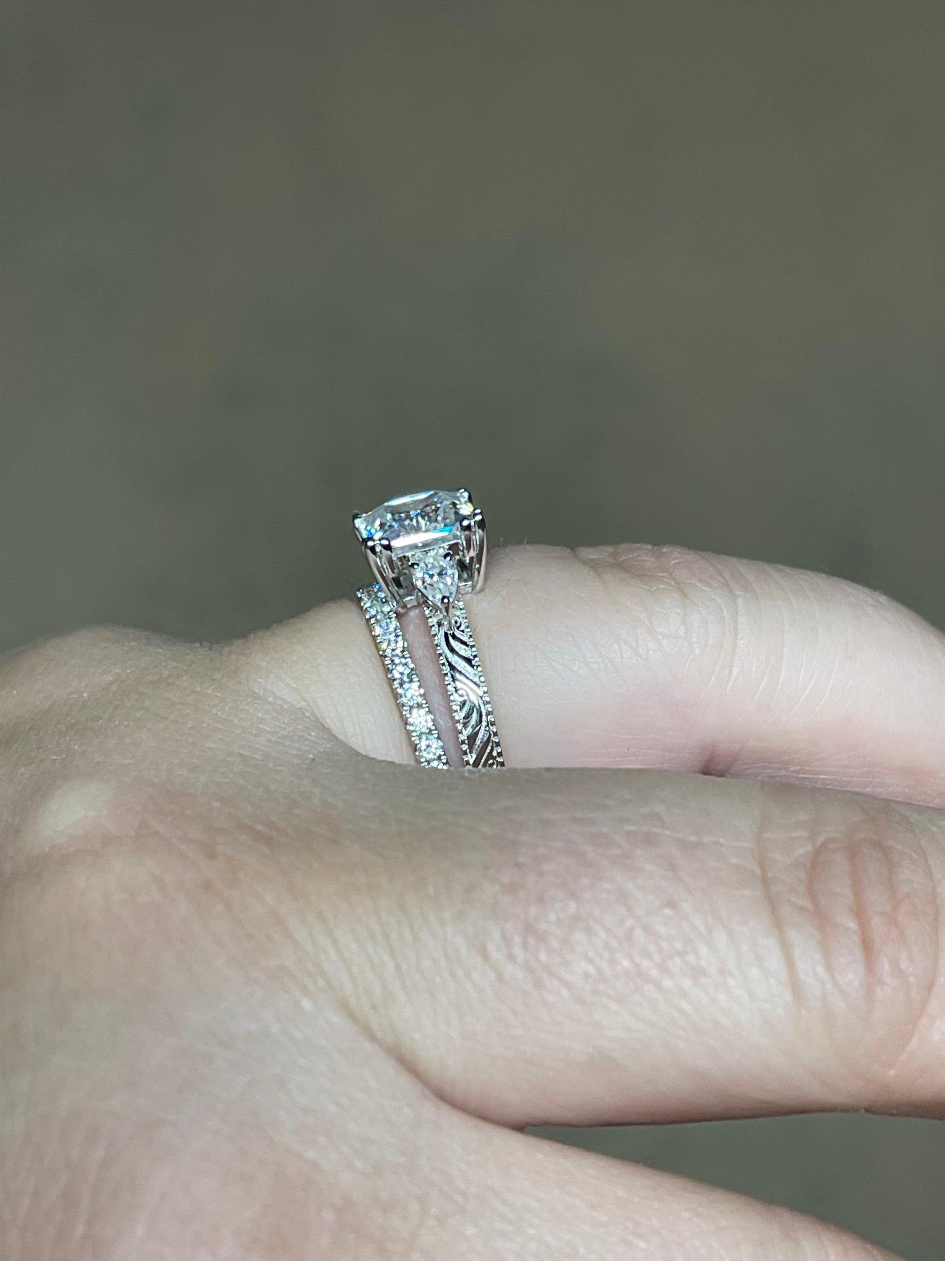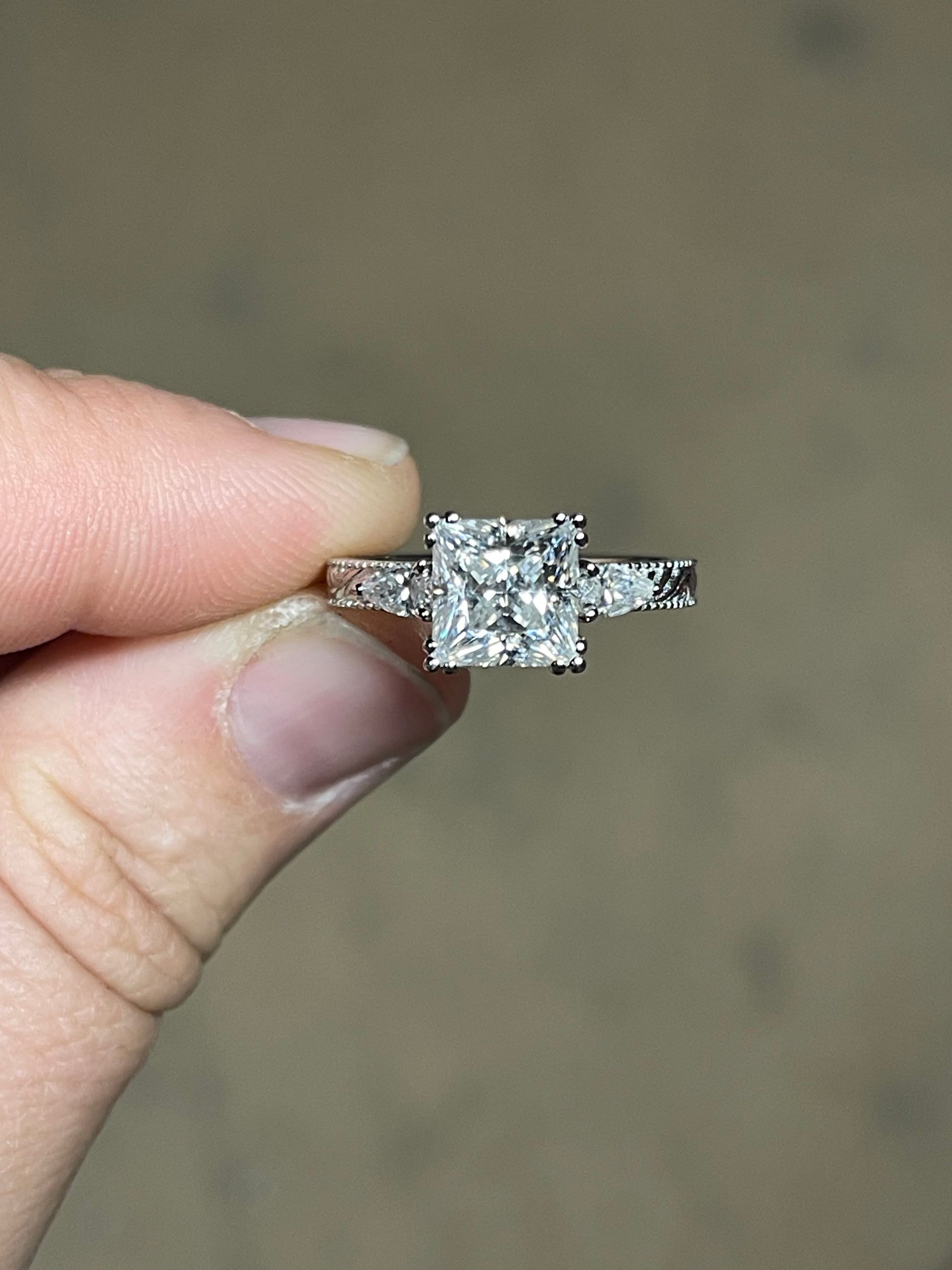 3ct Princess Cut Moissanite with Tear Drop Moissanite Side Stones with 3mm Pattern Band