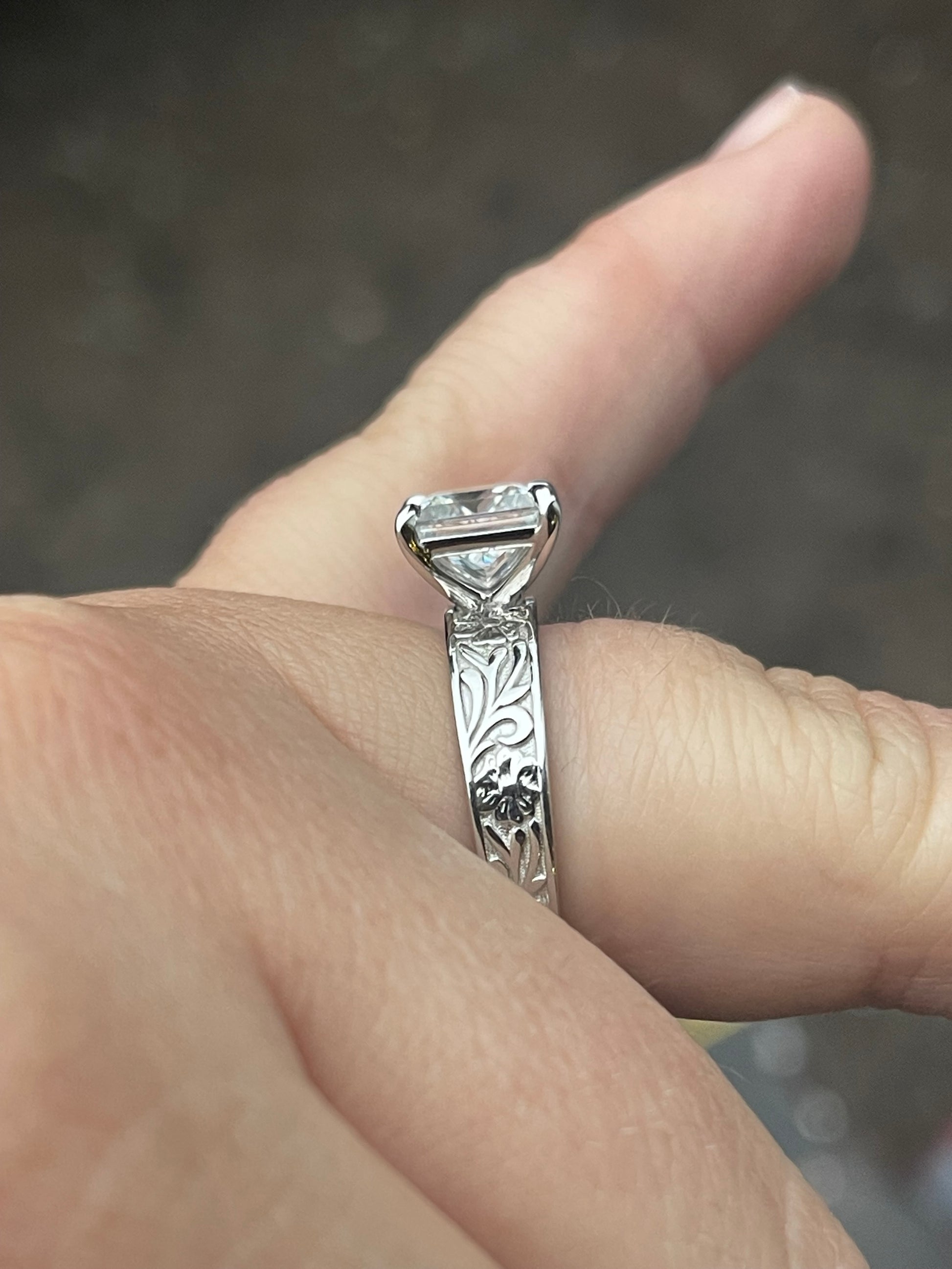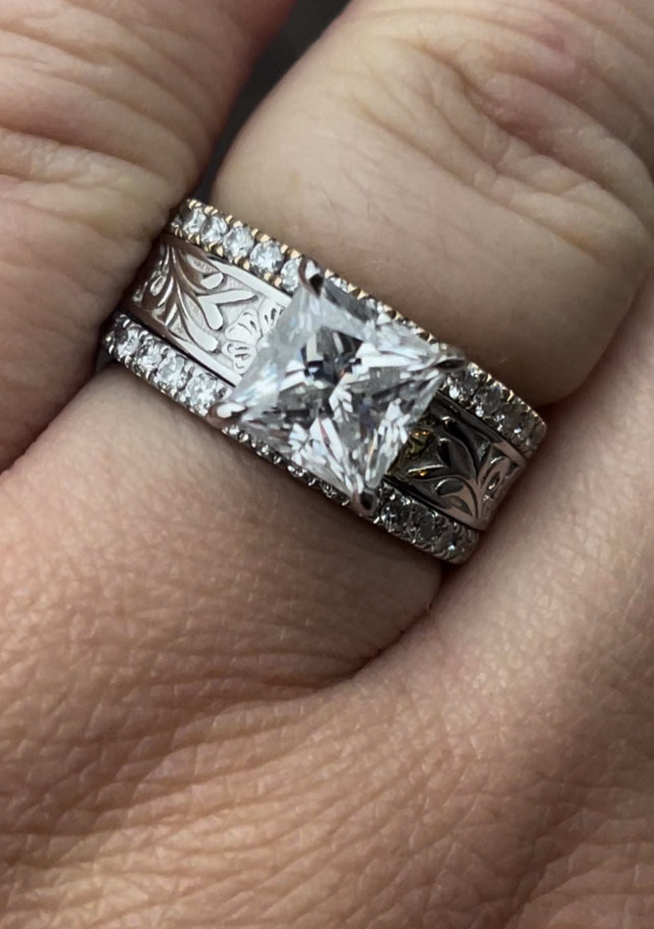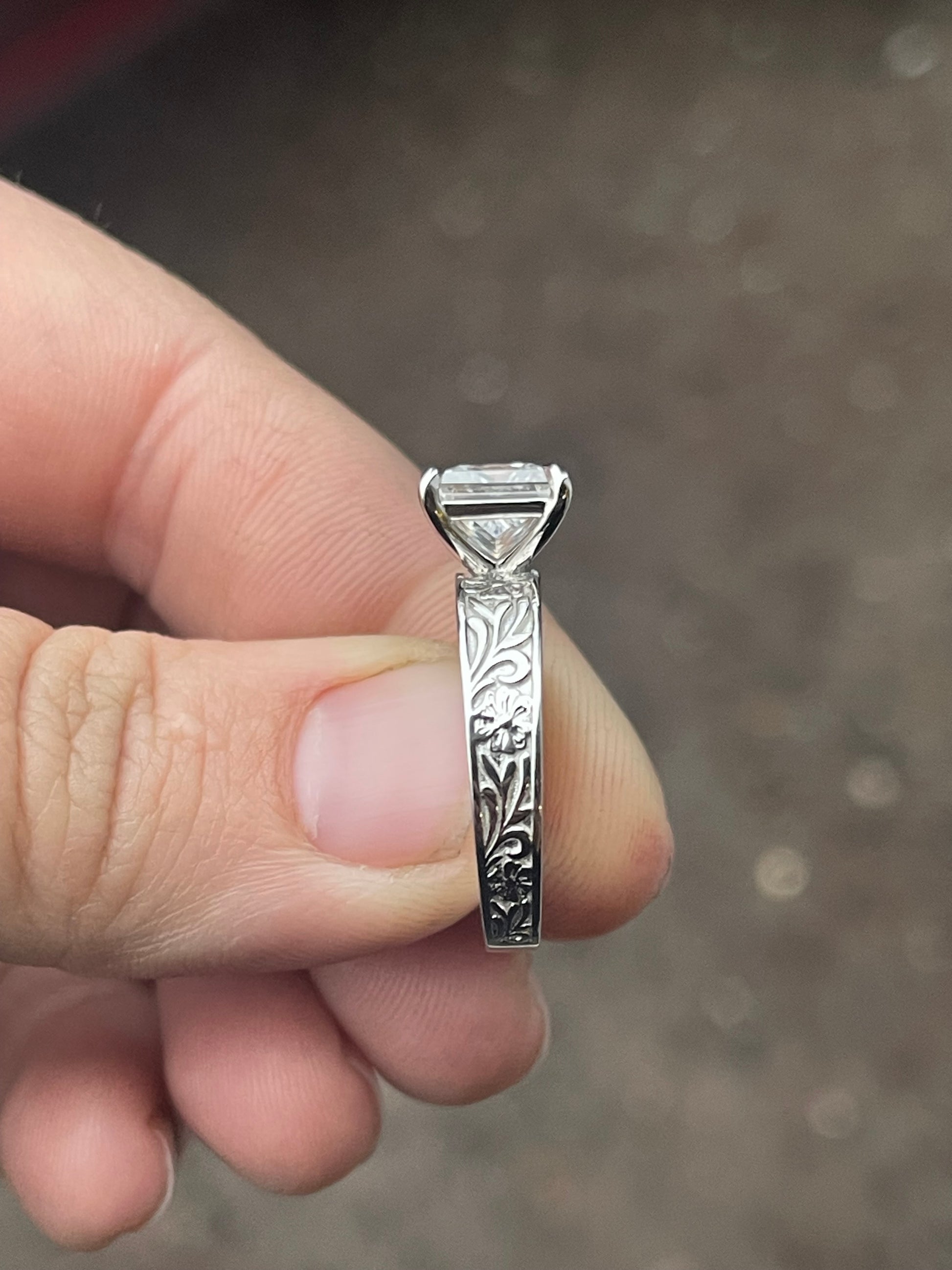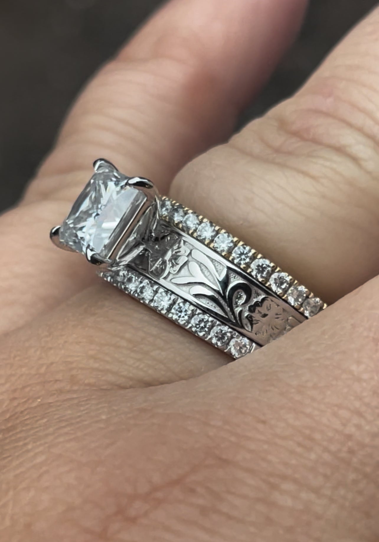 3ct Princess Cut Moissanite with 5mm to 3mm Tapered Pattern Band