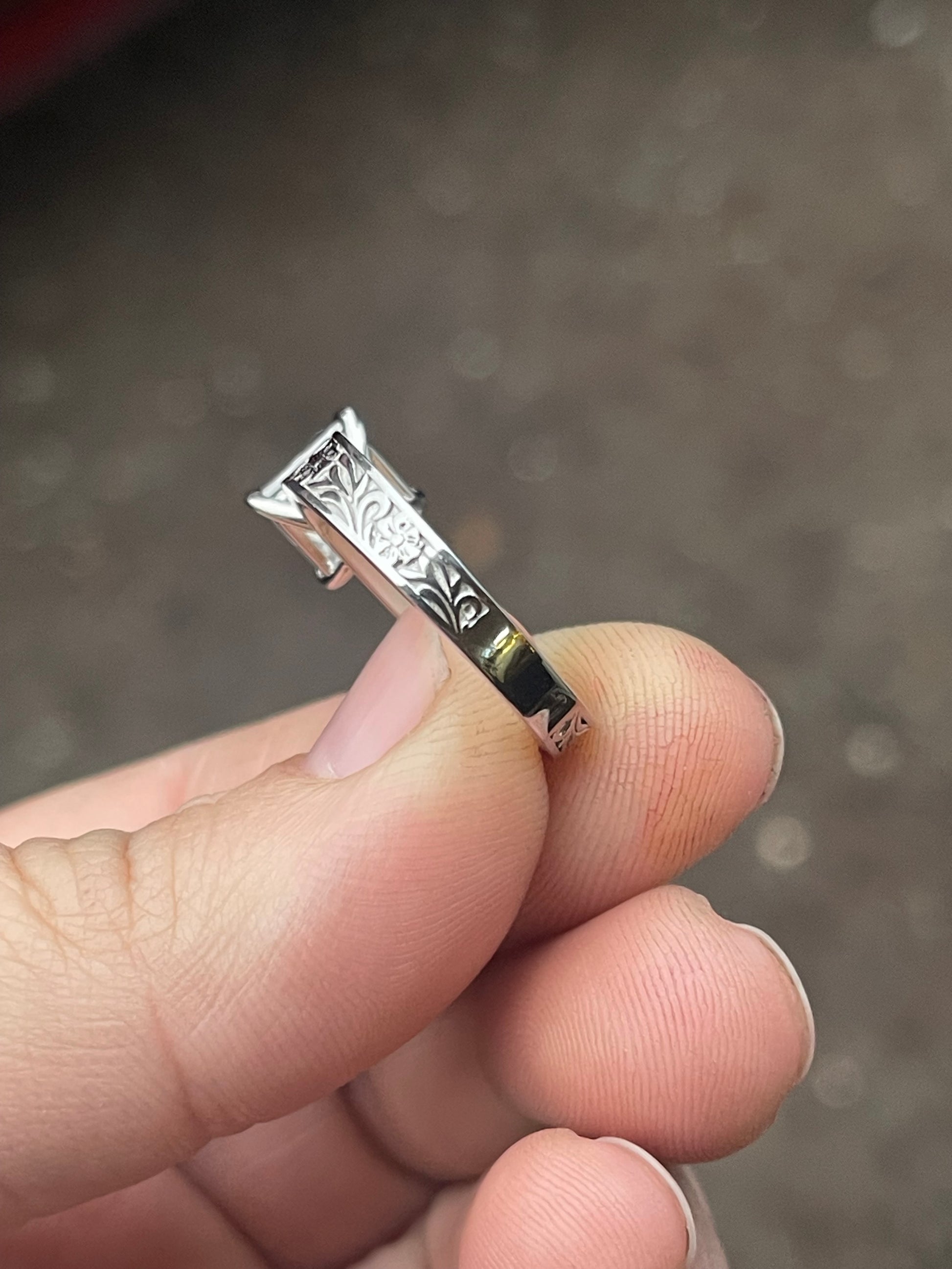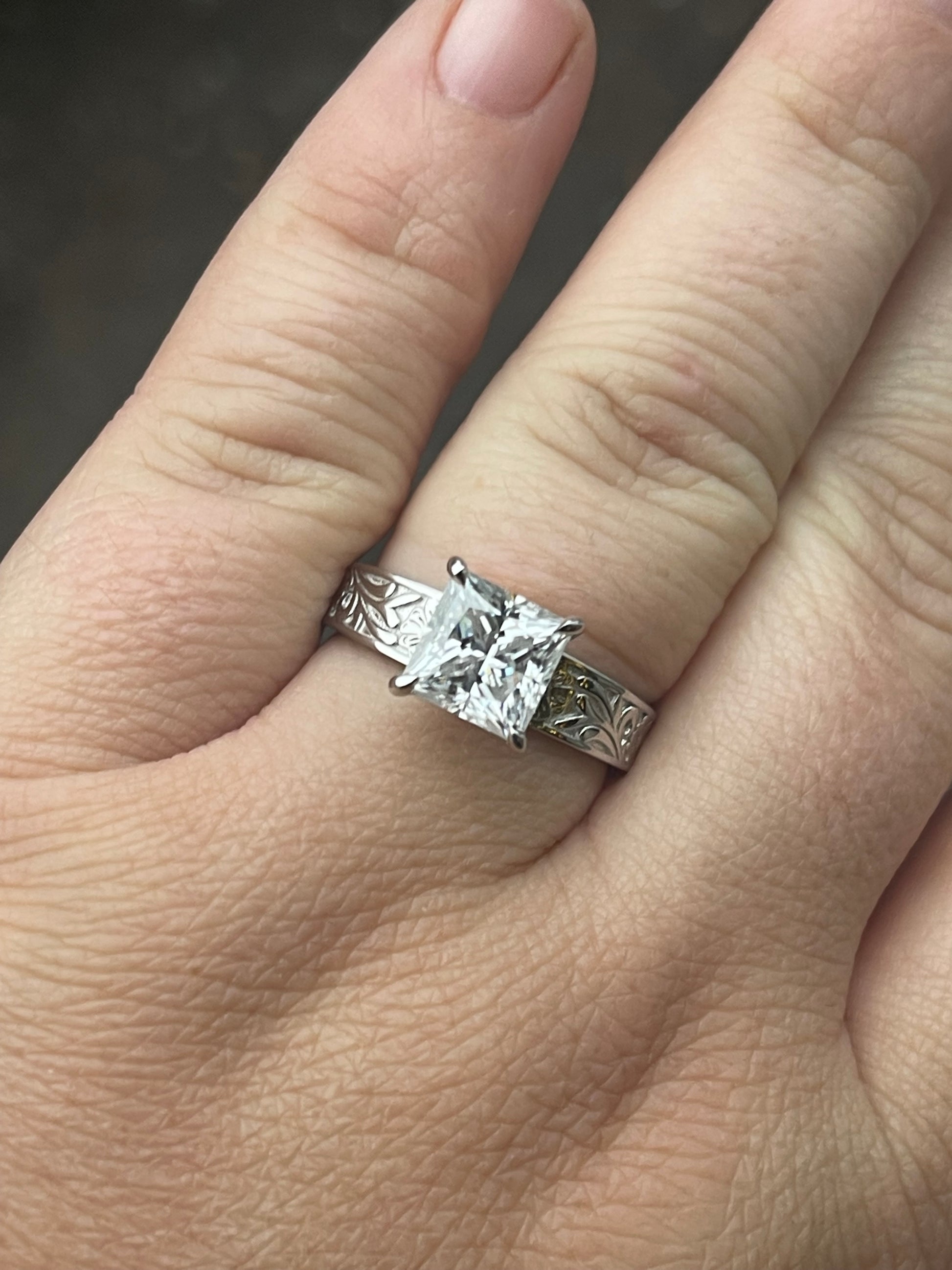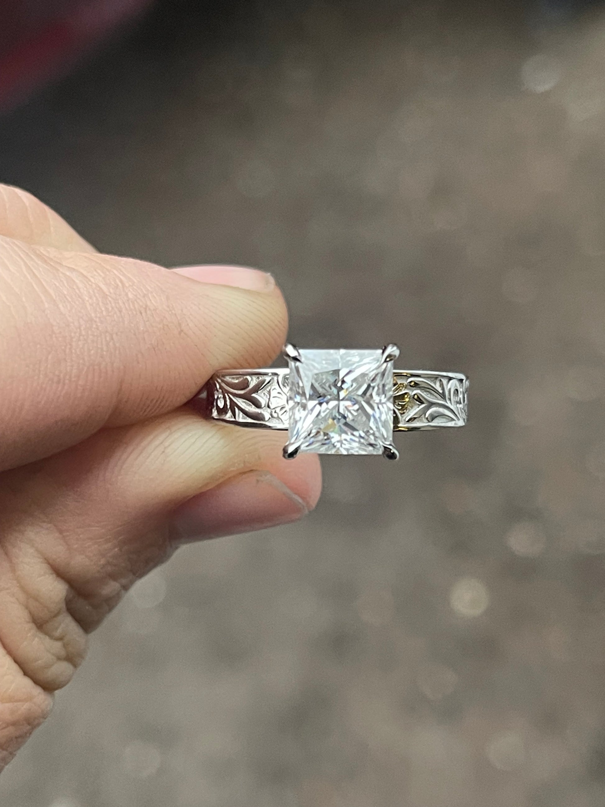 3ct Princess Cut Moissanite with 5mm to 3mm Tapered Pattern Band