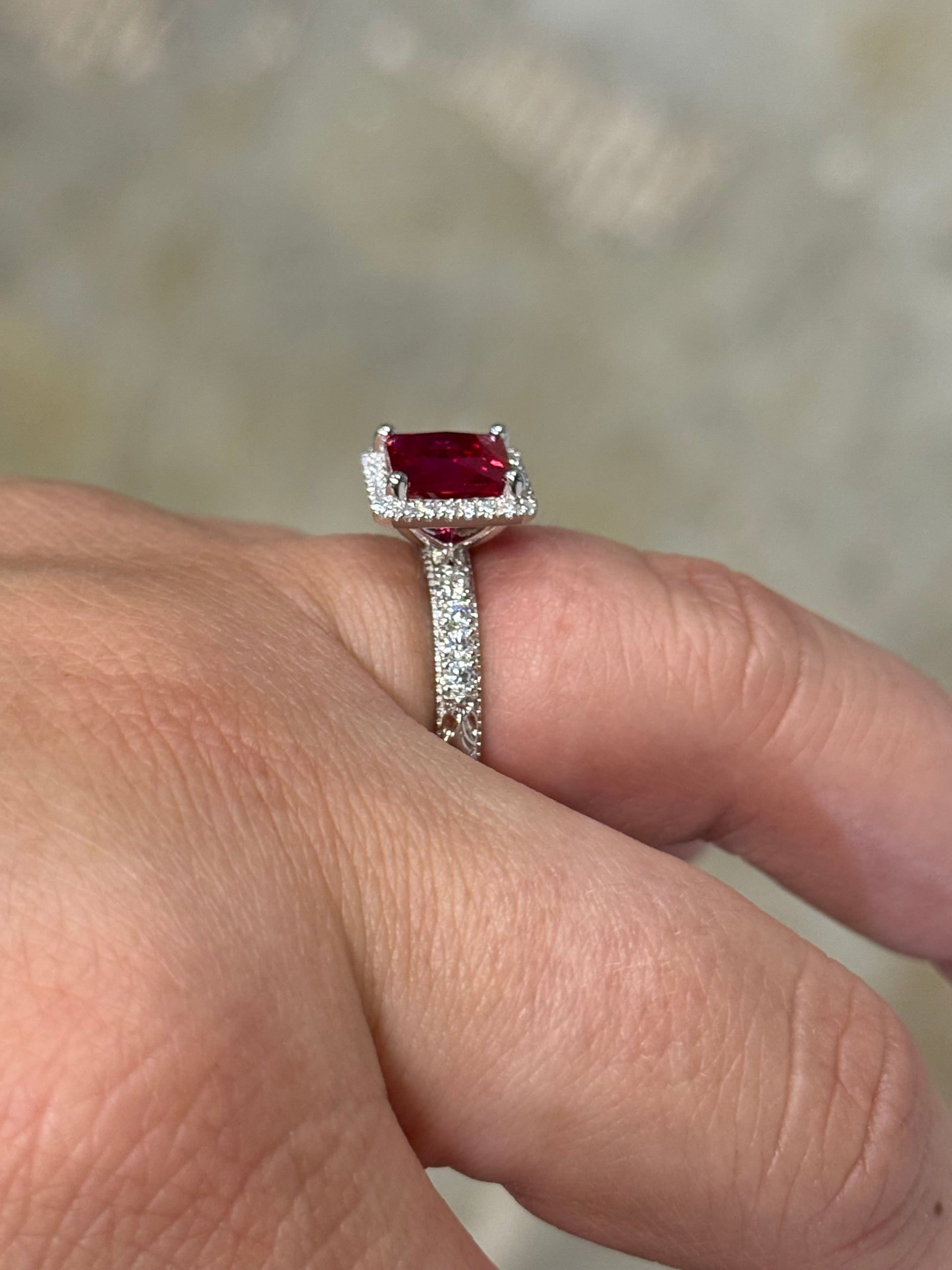 3ct Princess Cut Lab Created Ruby with Halo Moissanite Stones on a 3mm Pattern Band with Pave Set Moissanite Stones