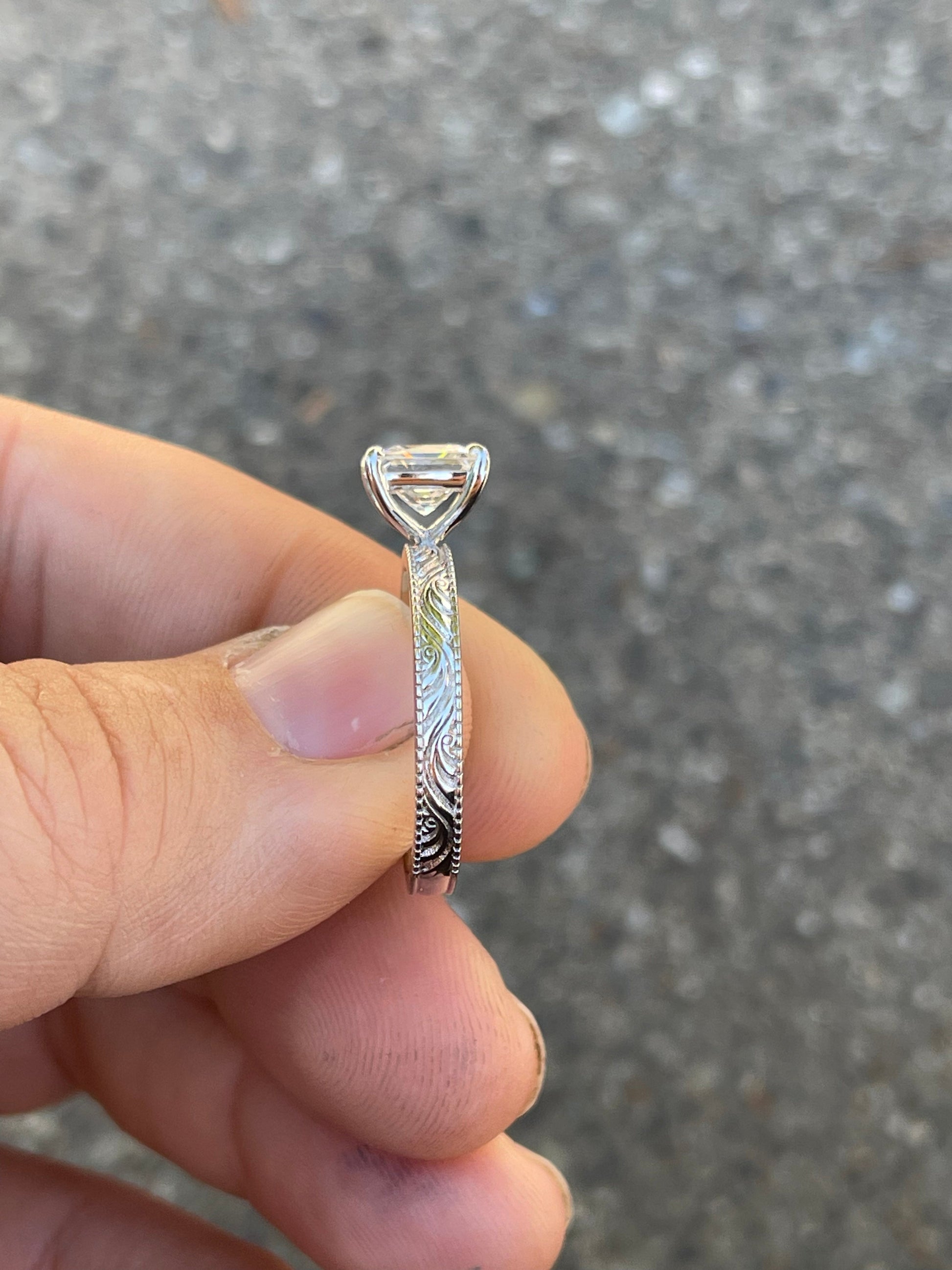 **Sterling Silver can react with chemicals found in air and produce tarnish and oxidize; high moisture levels, exposure to sunlight and contaminants such as salt water increase this reaction. Properly care for ring by polishing with polish & a clean cotton cloth.