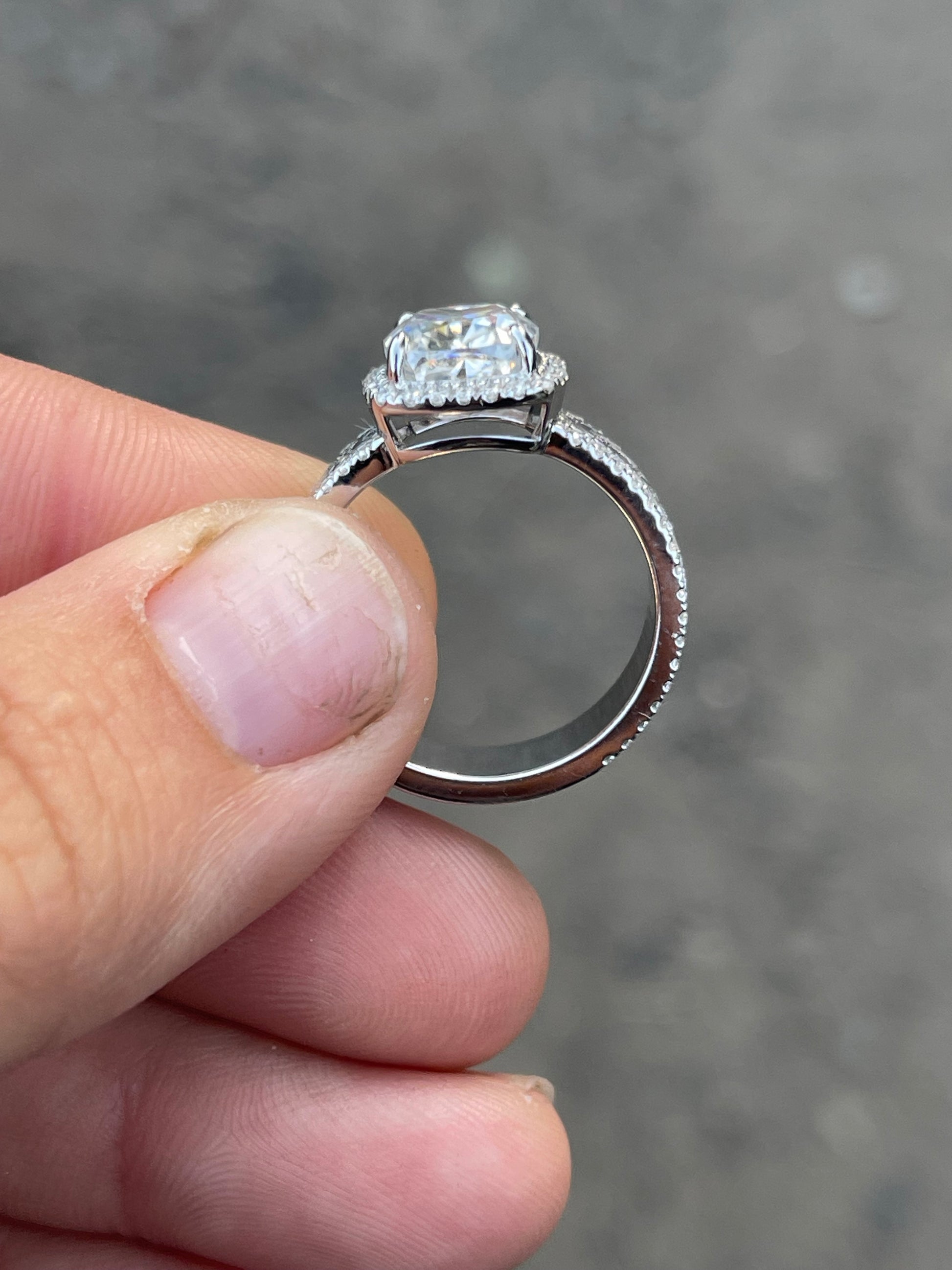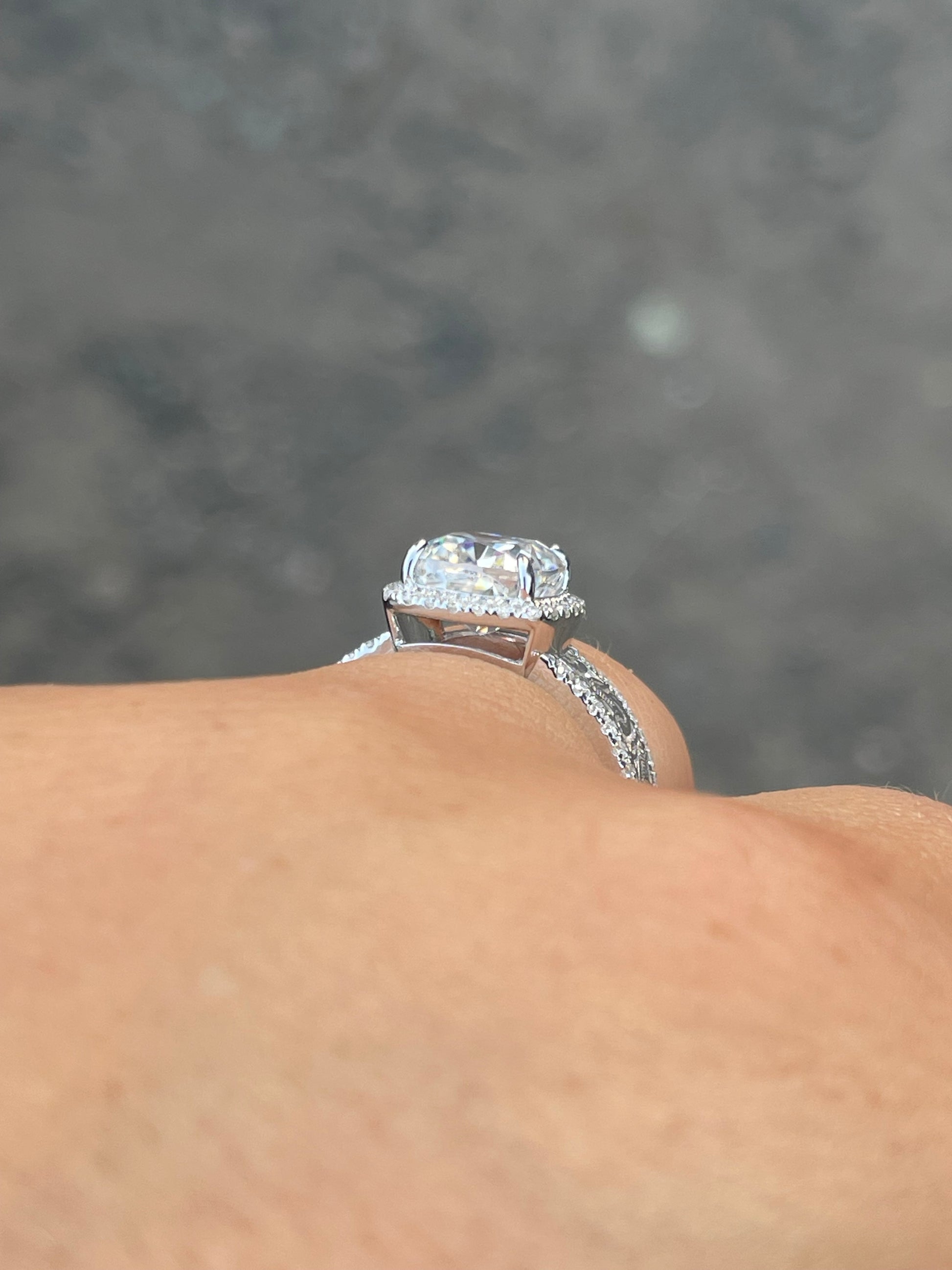 3ct Cushion Cut Moissanite with Halo and 5mm Pattern Band