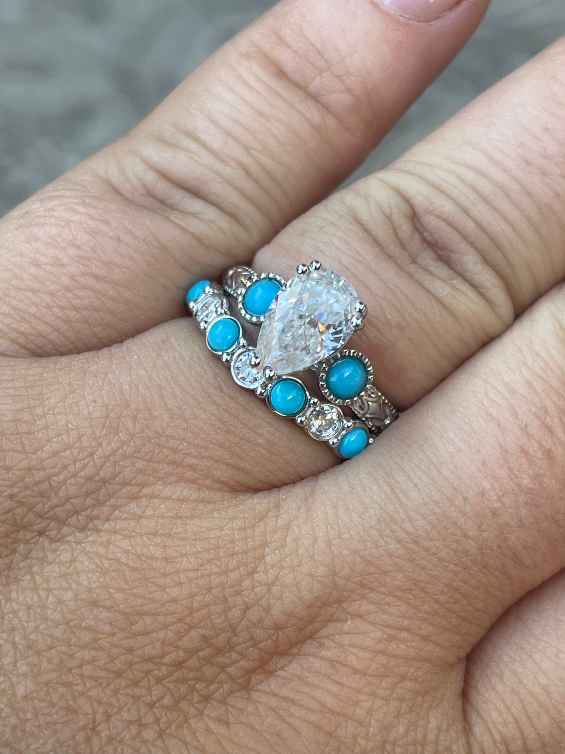 3ct Pear Cut Moissanite 7*11mm with 4mm Turquoise Stones and 3mm Pattern Band