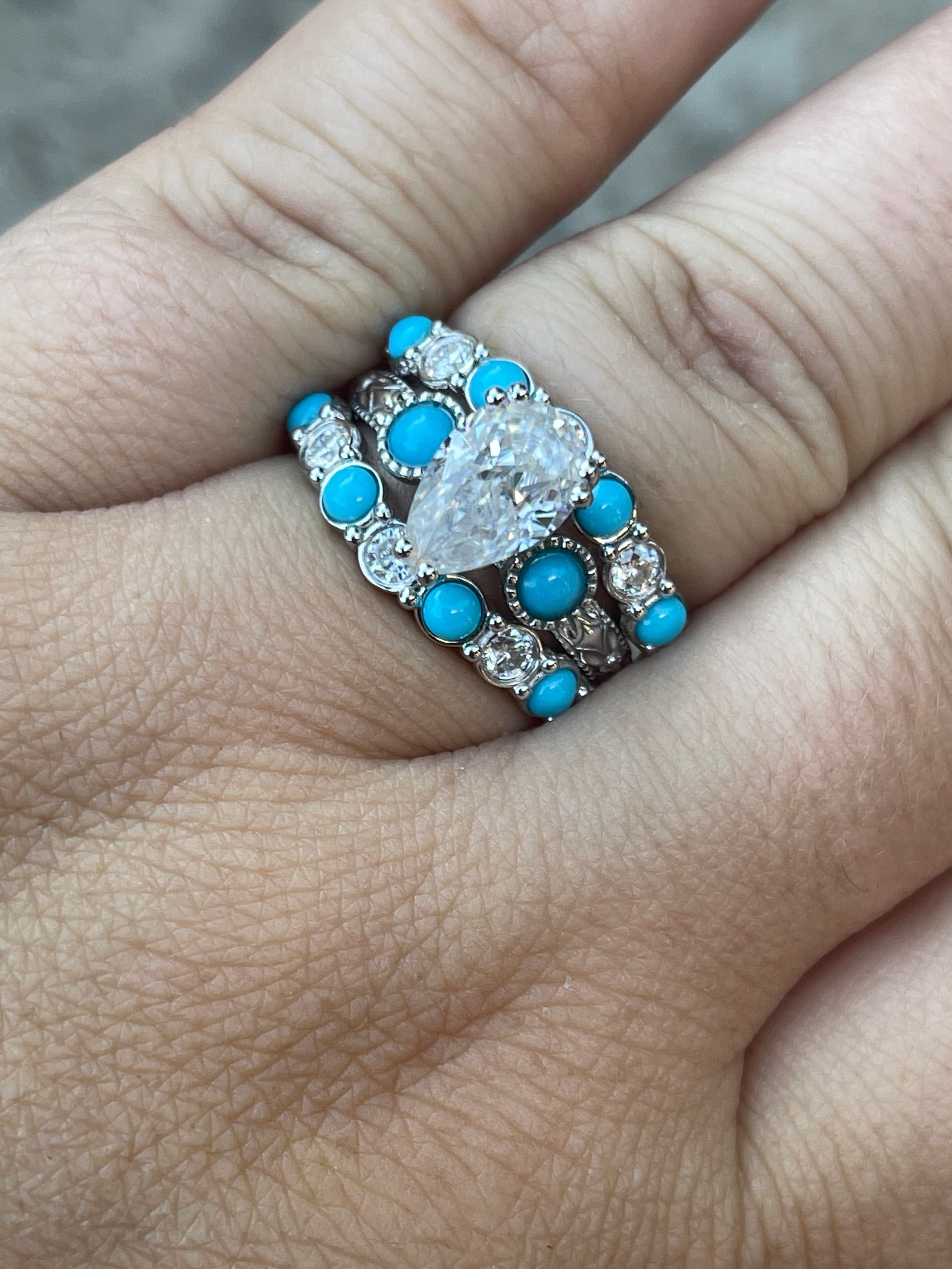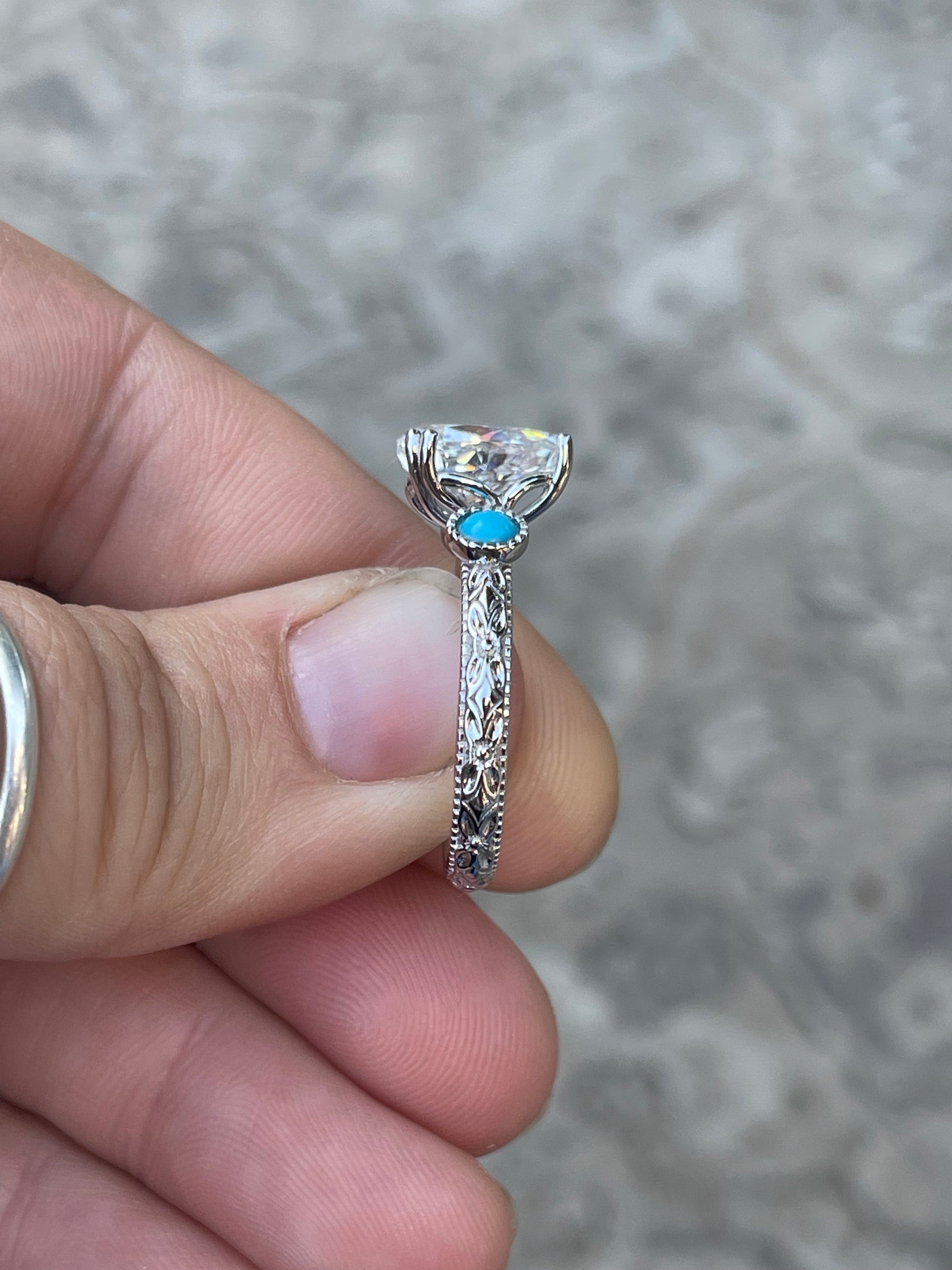 3ct Pear Cut Moissanite 7*11mm with 4mm Turquoise Stones and 3mm Pattern Band