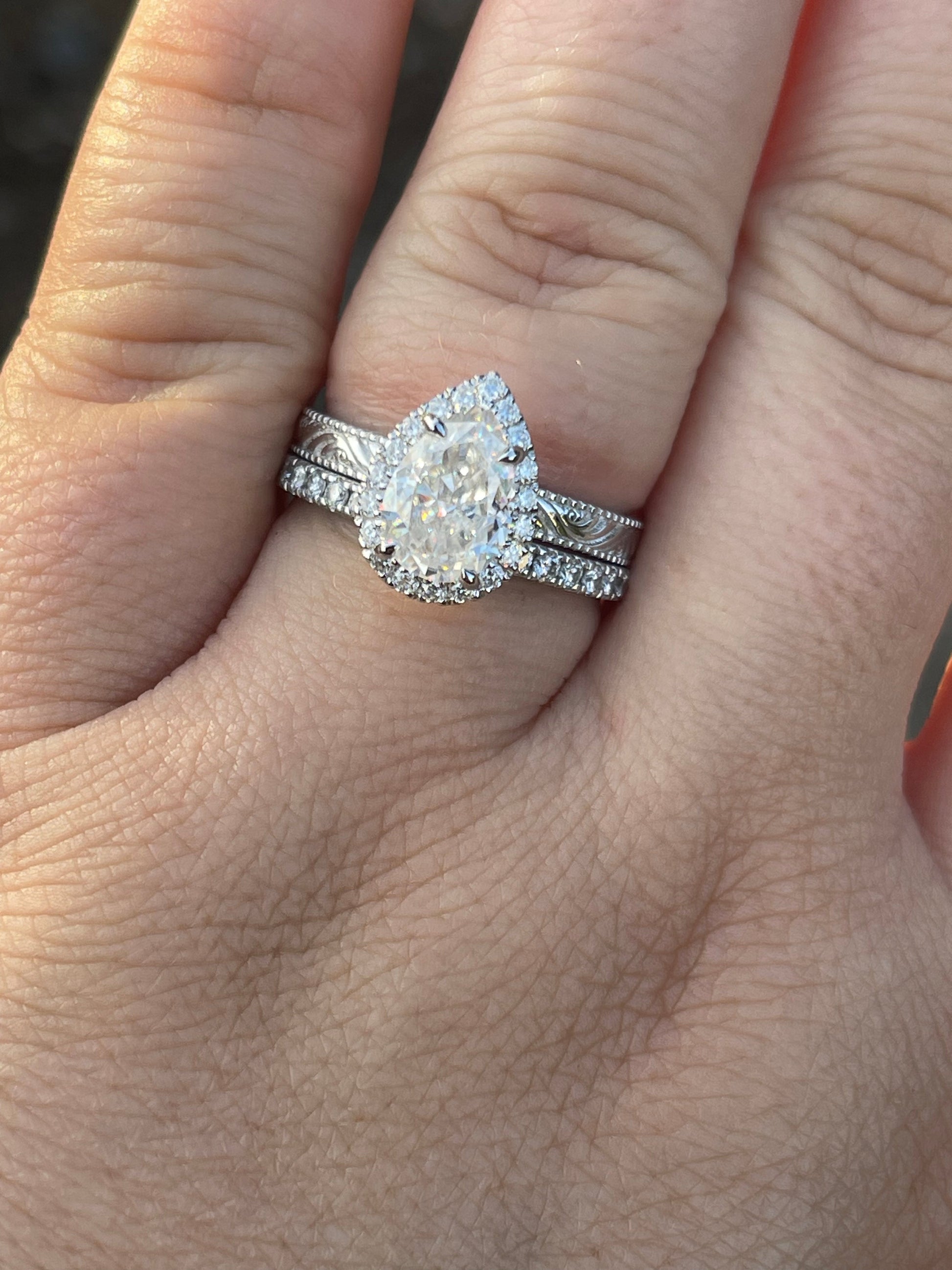 2ct Pear Cut Lab Diamond with Halo Lab Diamond Stones on 3mm Pattern Band