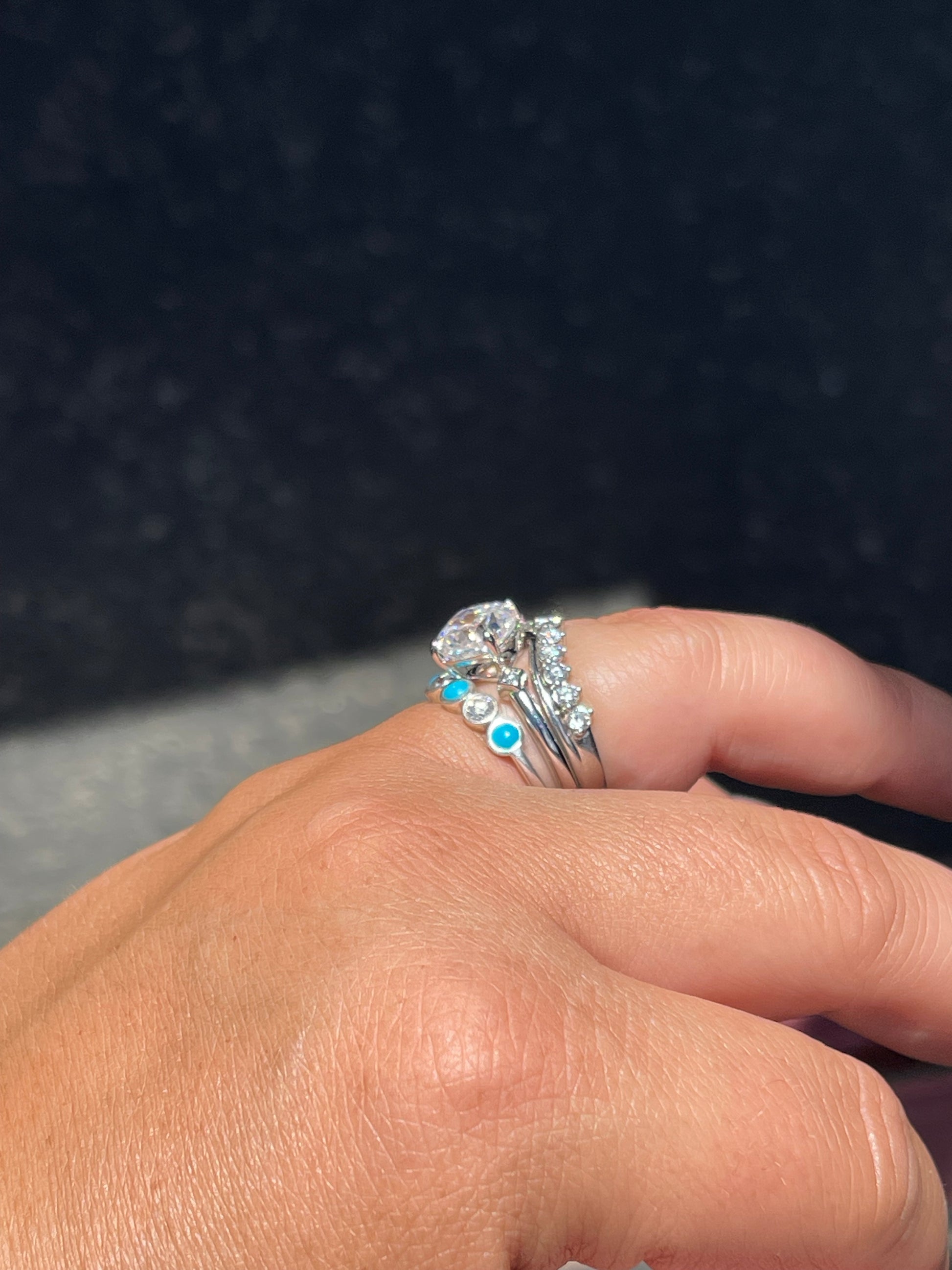 **Sterling Silver can react with chemicals found in air and produce tarnish and oxidize; high moisture levels, exposure to sunlight and contaminants such as salt water increase this reaction. Properly care for ring by polishing with polish & a clean cotton cloth.