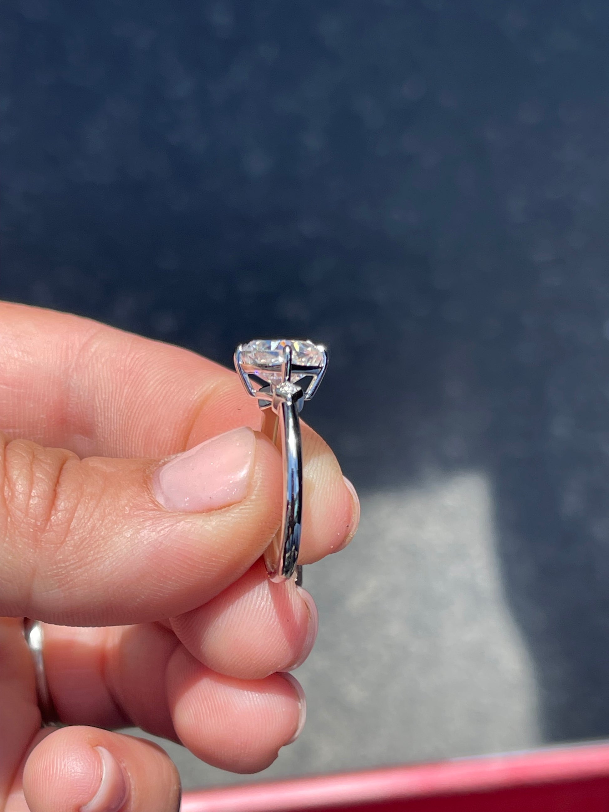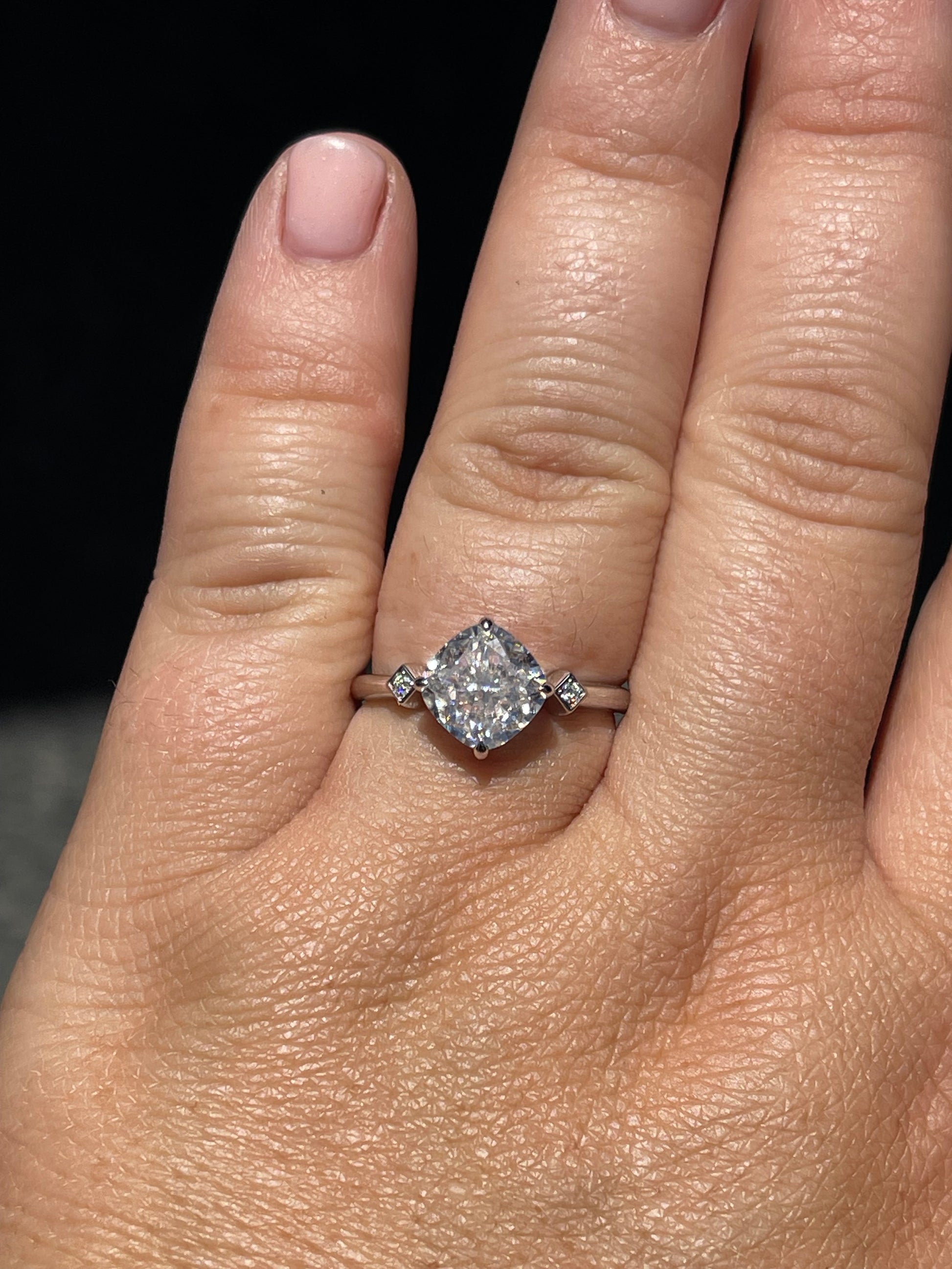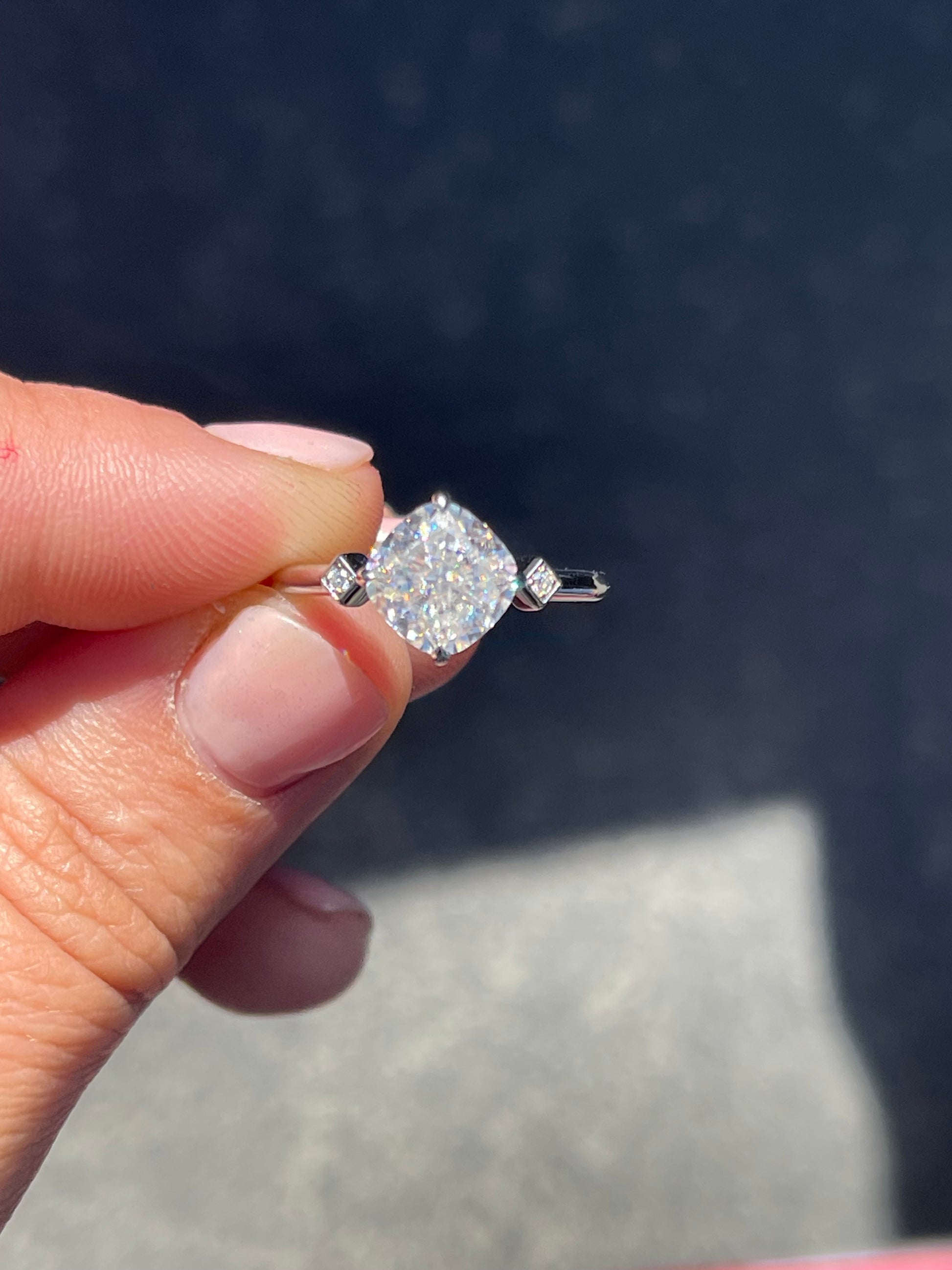 3ct Cushion Cut 8.5*8.5mm on a Liw Setting with a 2mm Smooth Band and 1.5mm Moissanite Stones