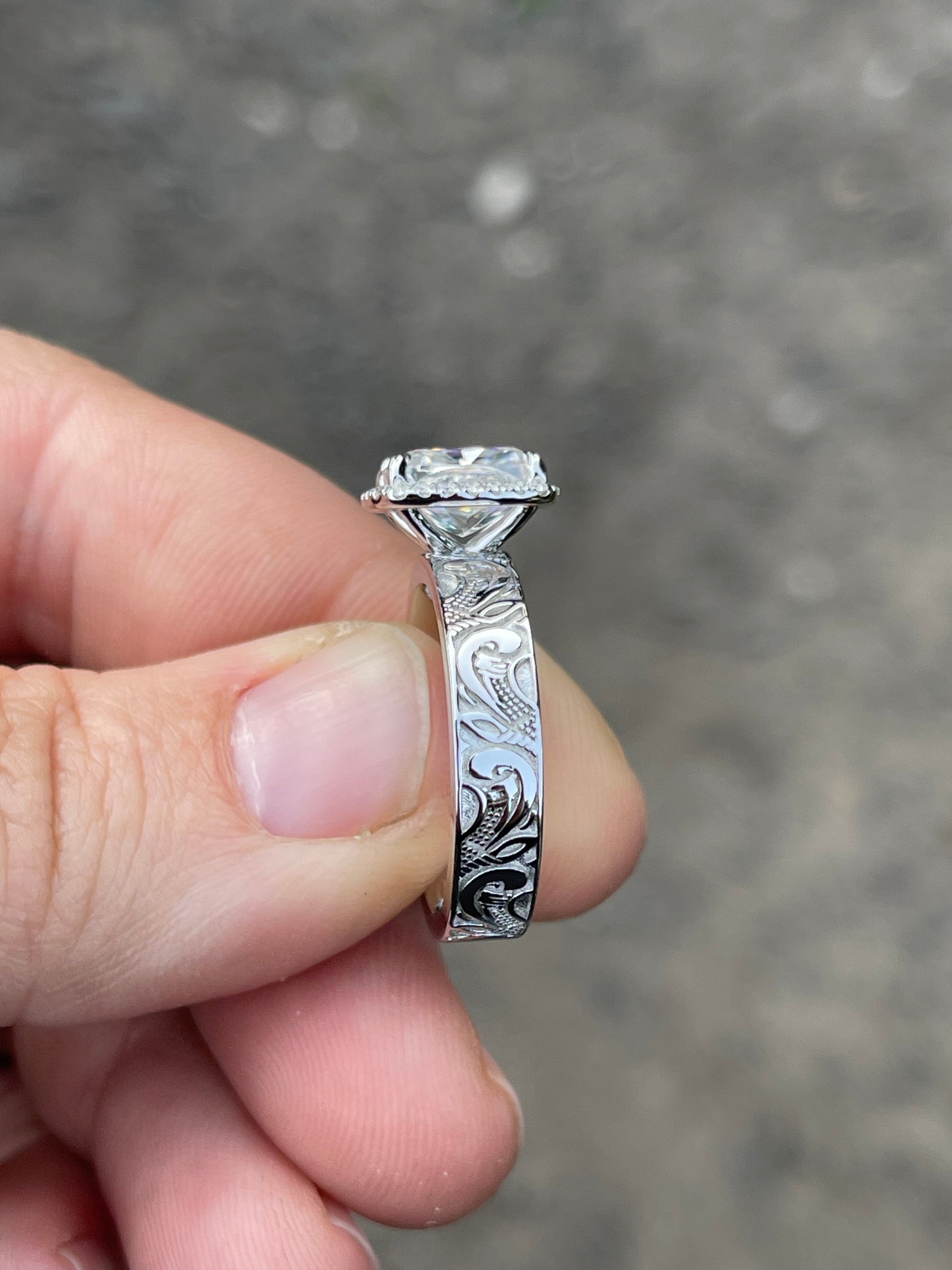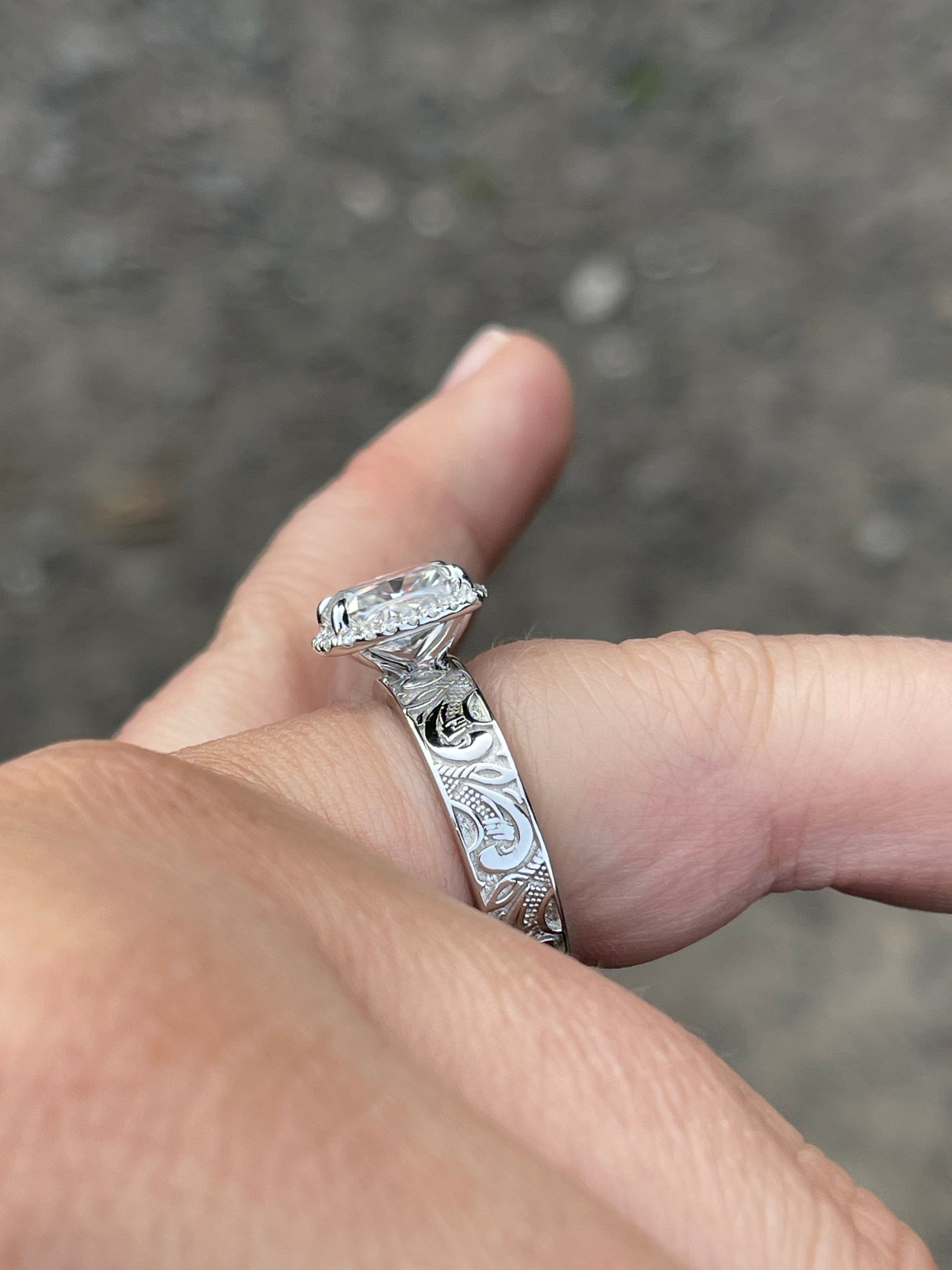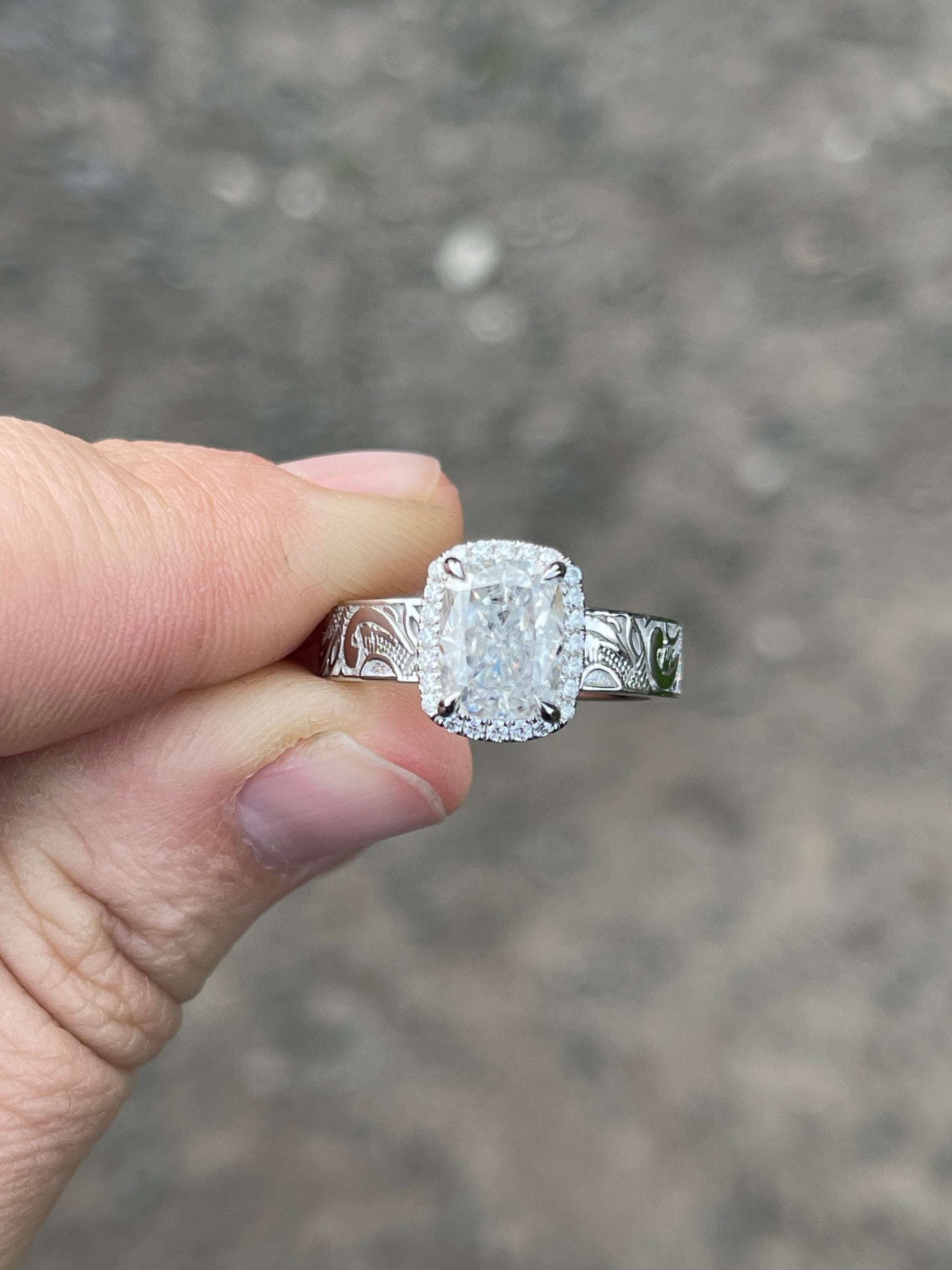 3ct Cushion Cut Moissanite with a Halo Setting and a 5mm Pattern Band