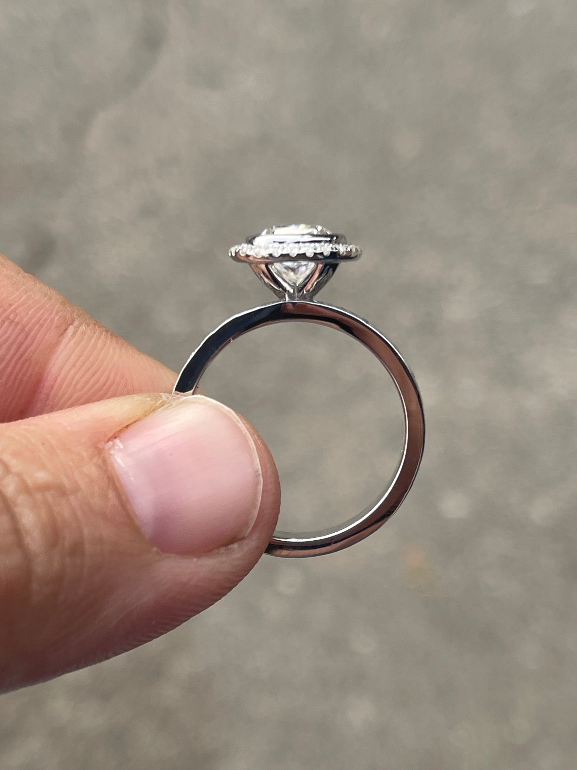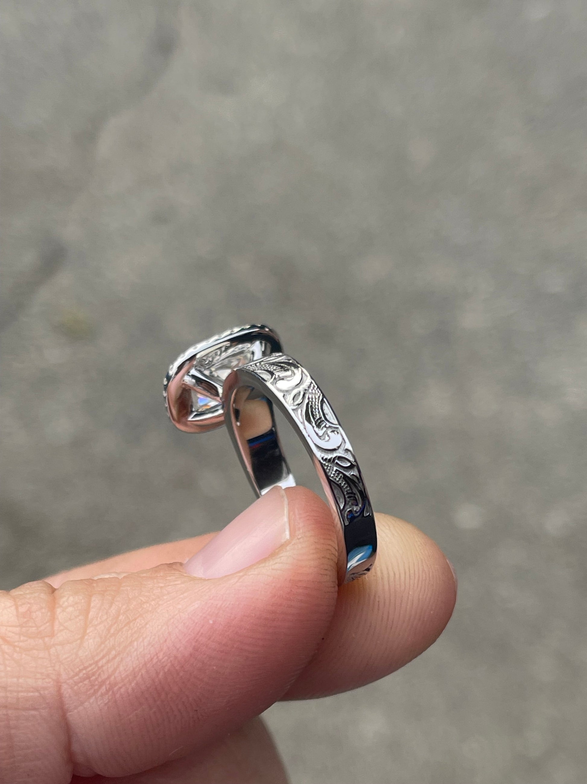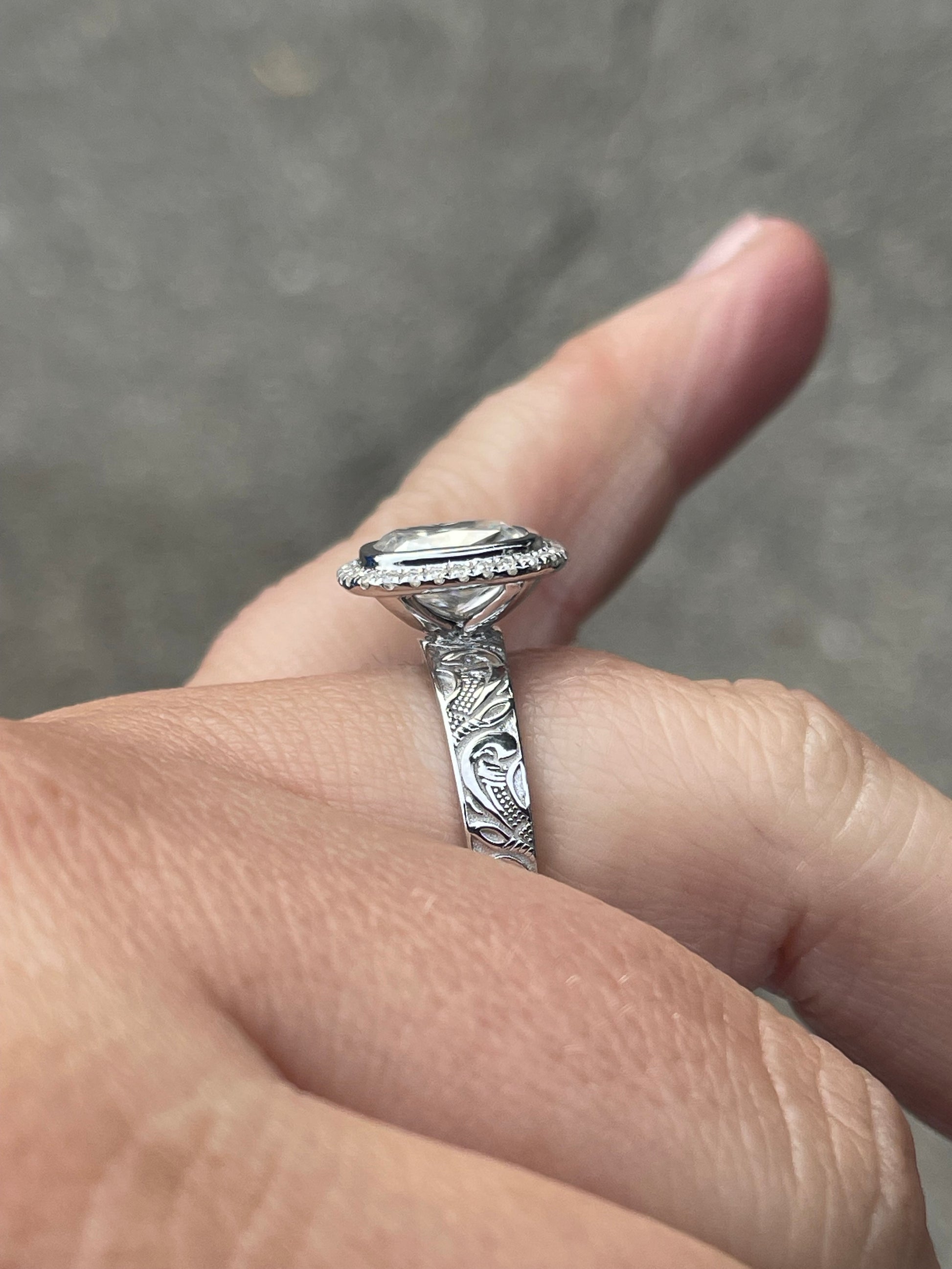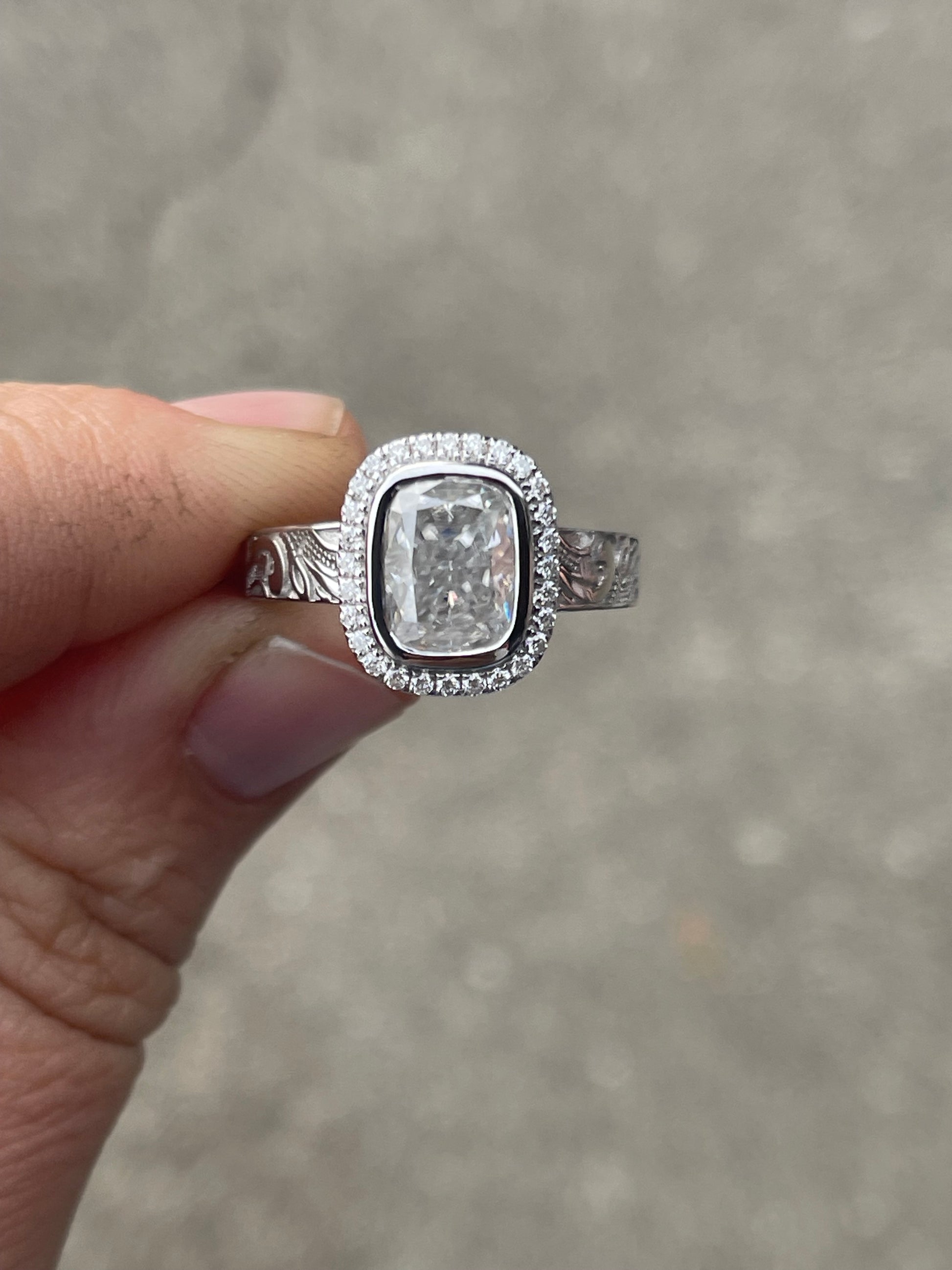 3ct Cushion Cut Moissanite with Halo Setting and 5mm to 3.5mm Pattern Band