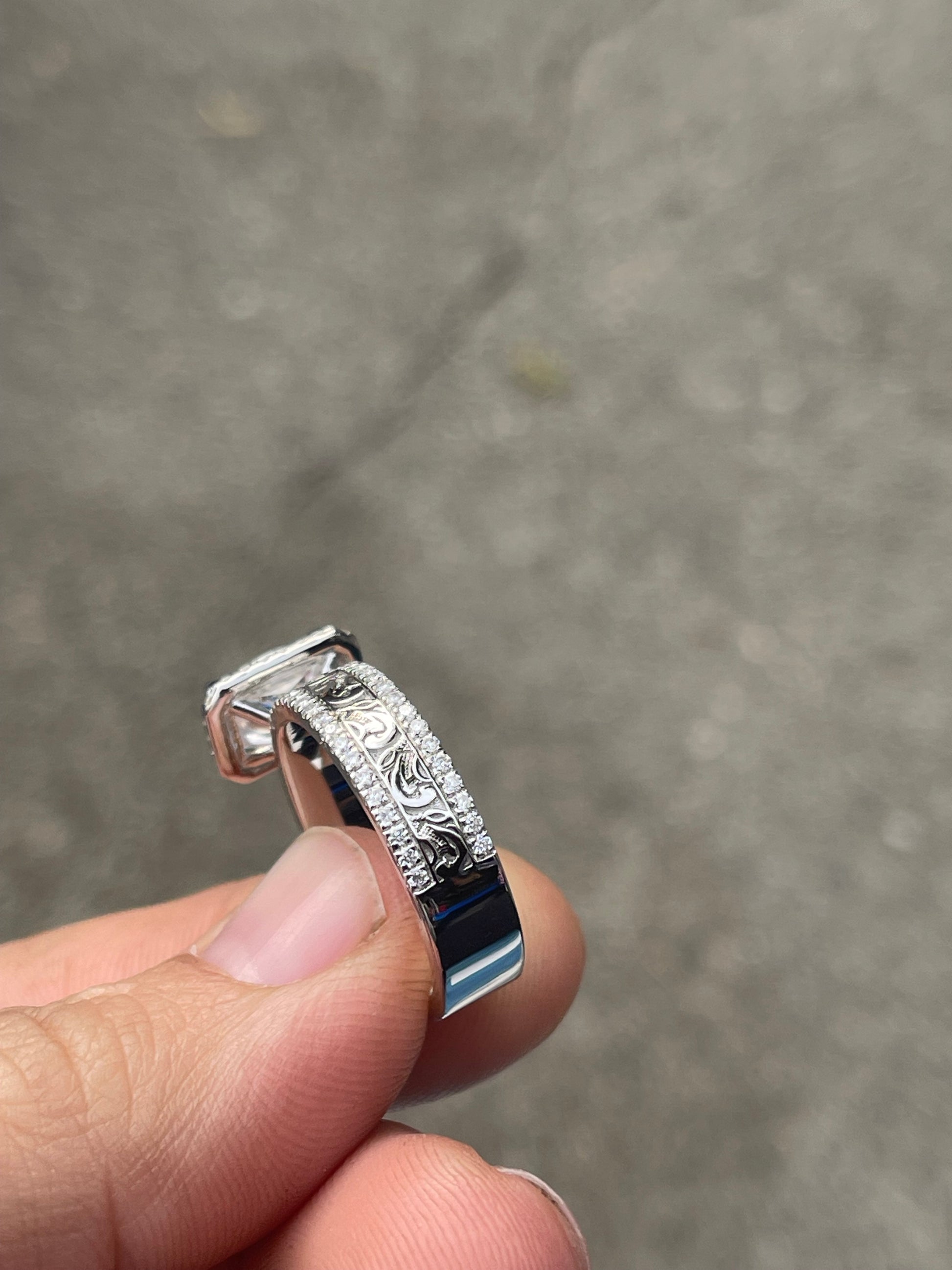 3ct Cushion Cut Moissanite with Halo and 5mm Pattern Band with Stones