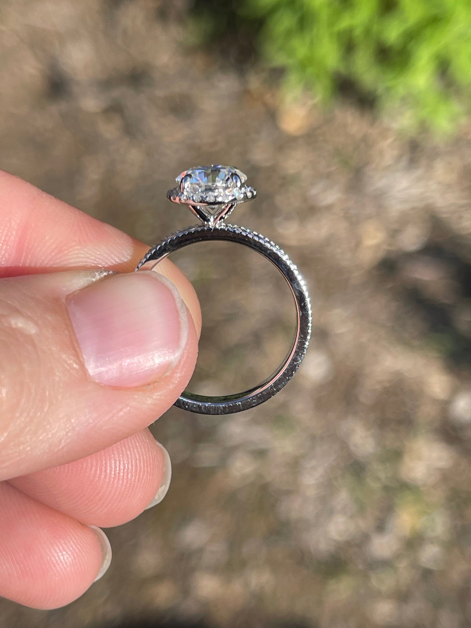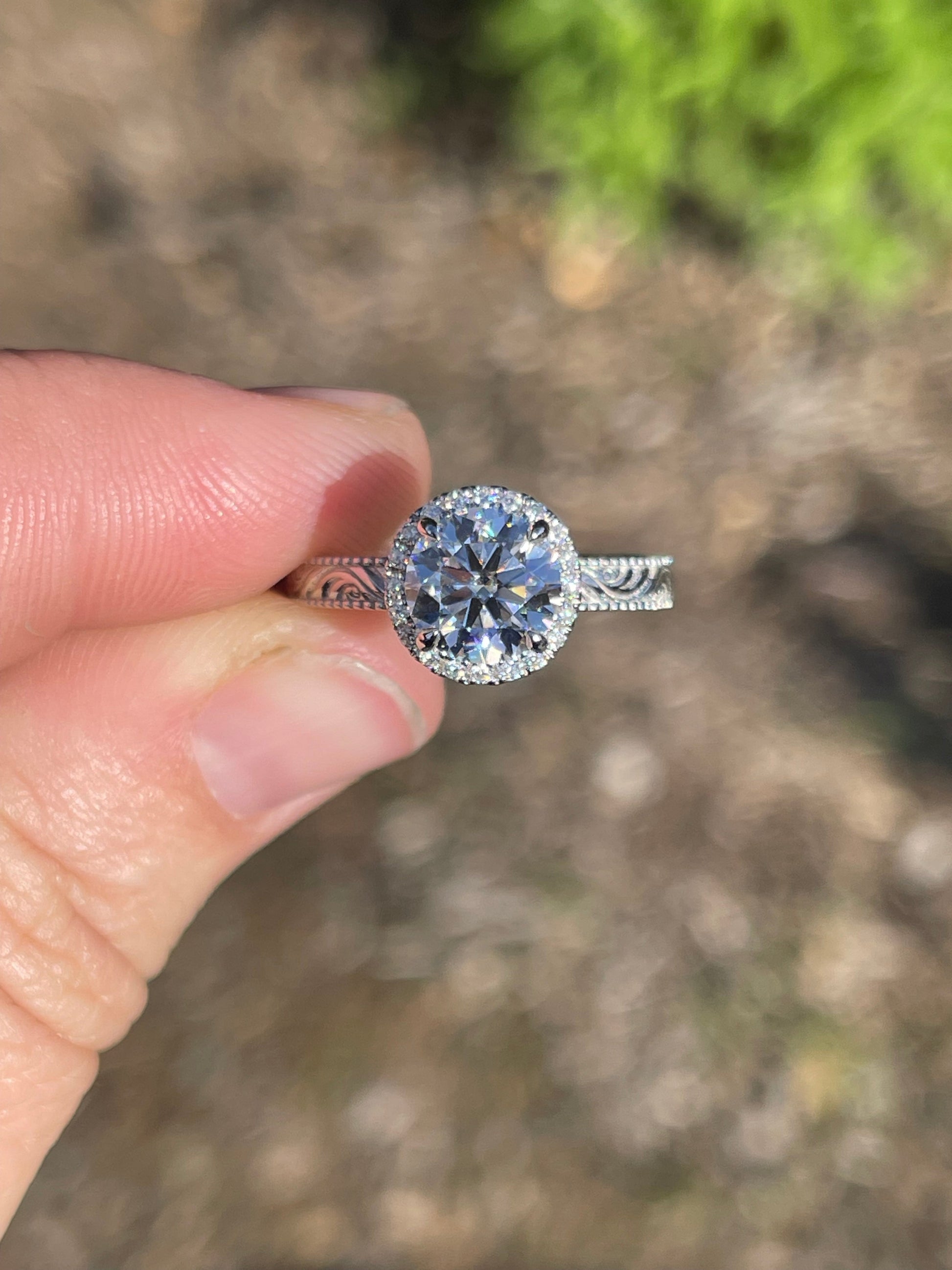 2ct Round Cut Moissanite 8mm with Halo Moissanite Stones on 3mm Pattern Band