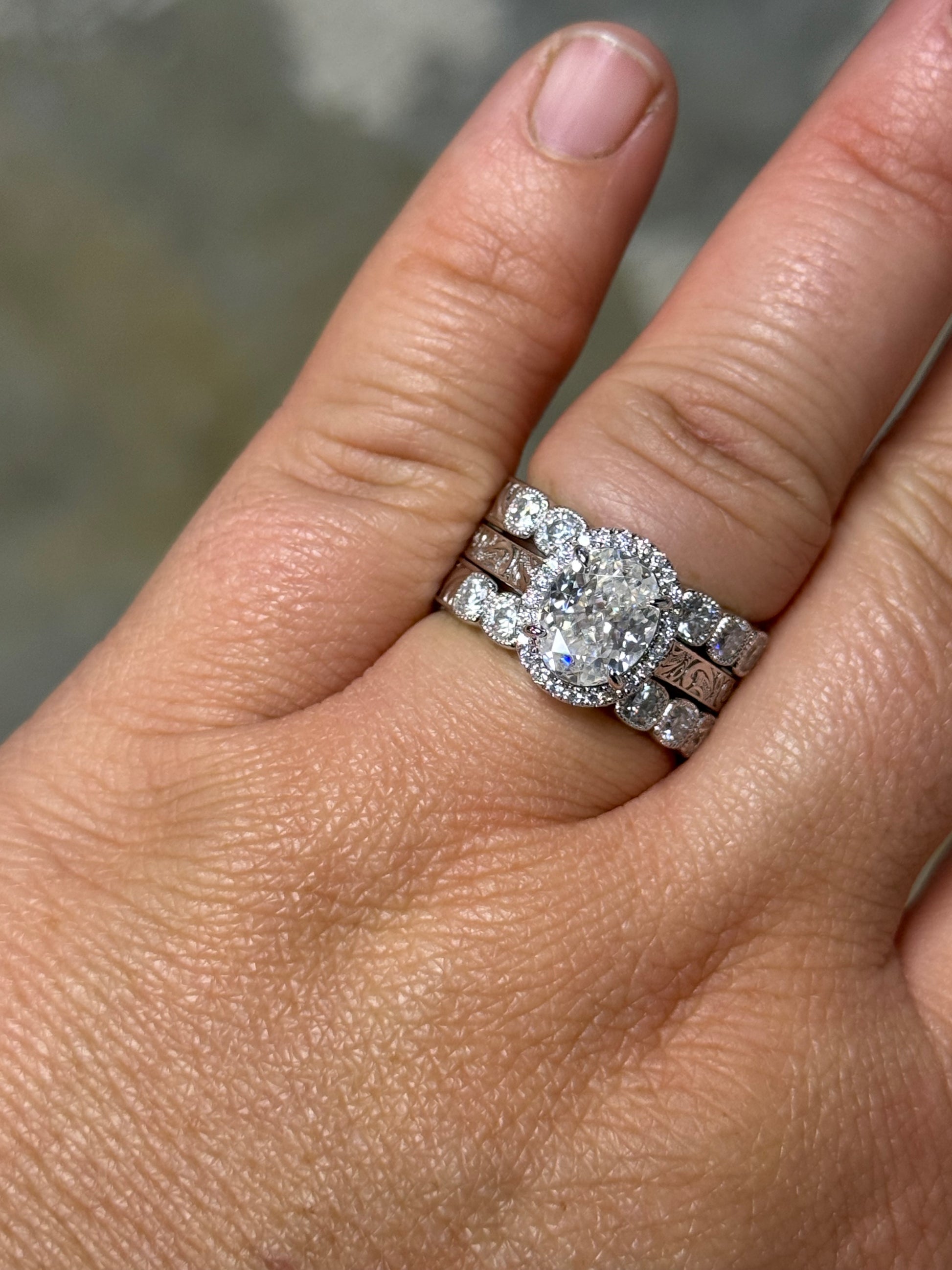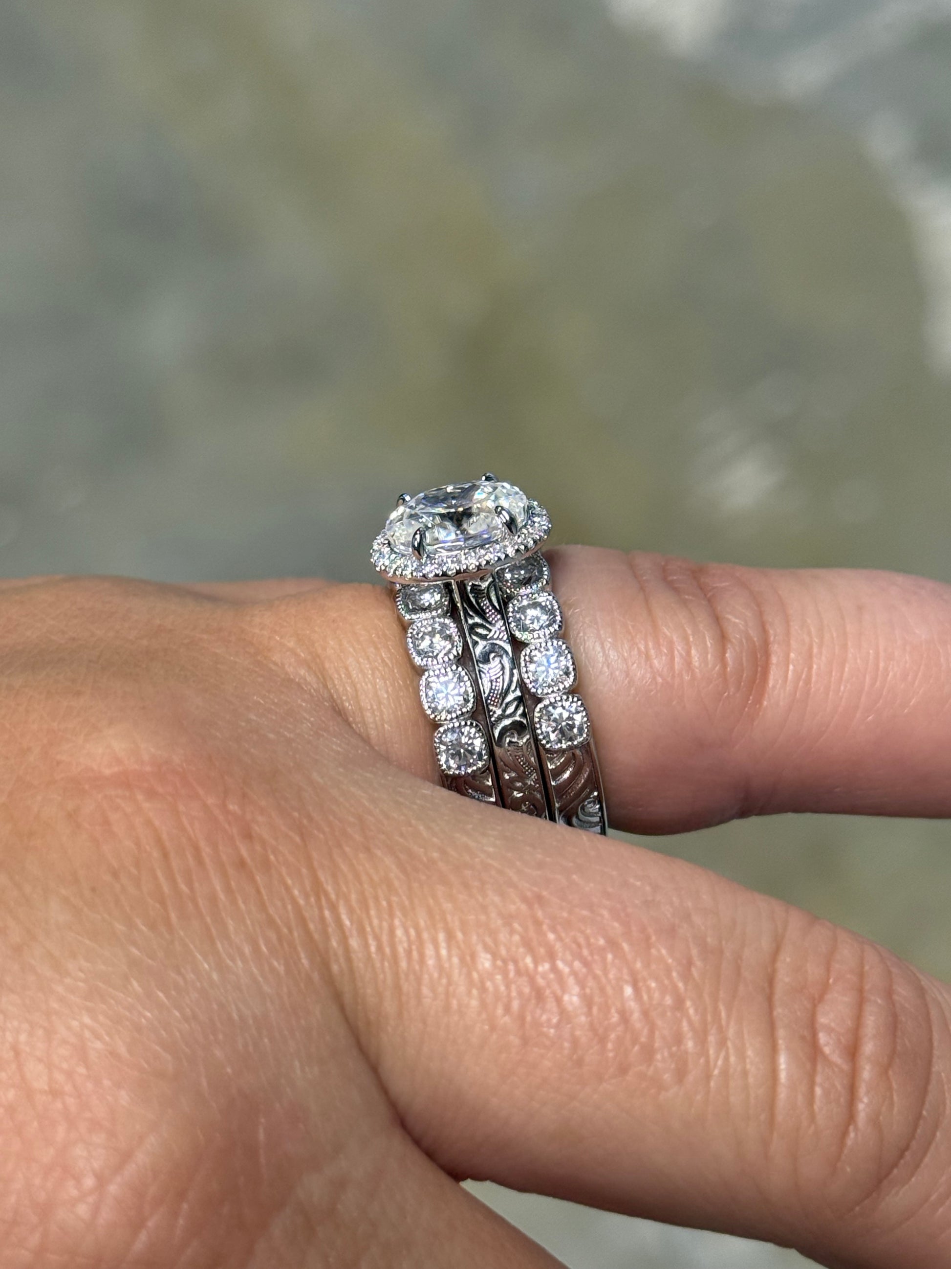 3ct Oval Cut Moissanite Halo with 3mm Channel Setting Pattern Band