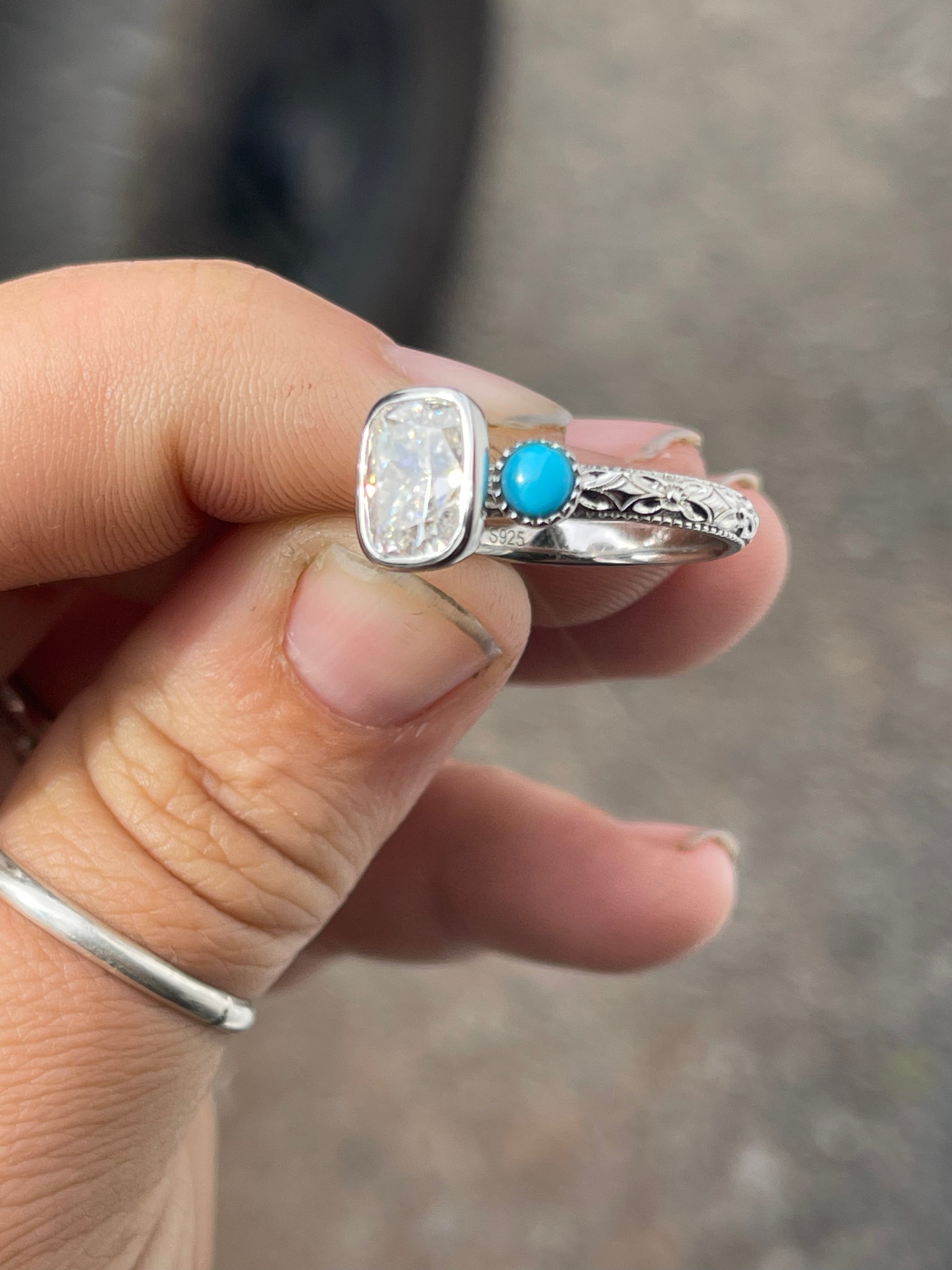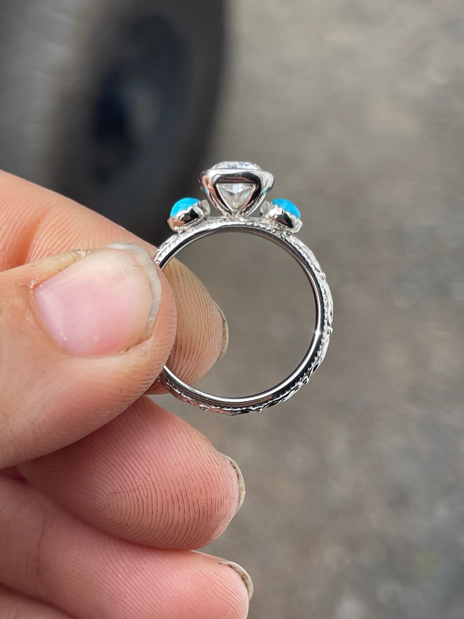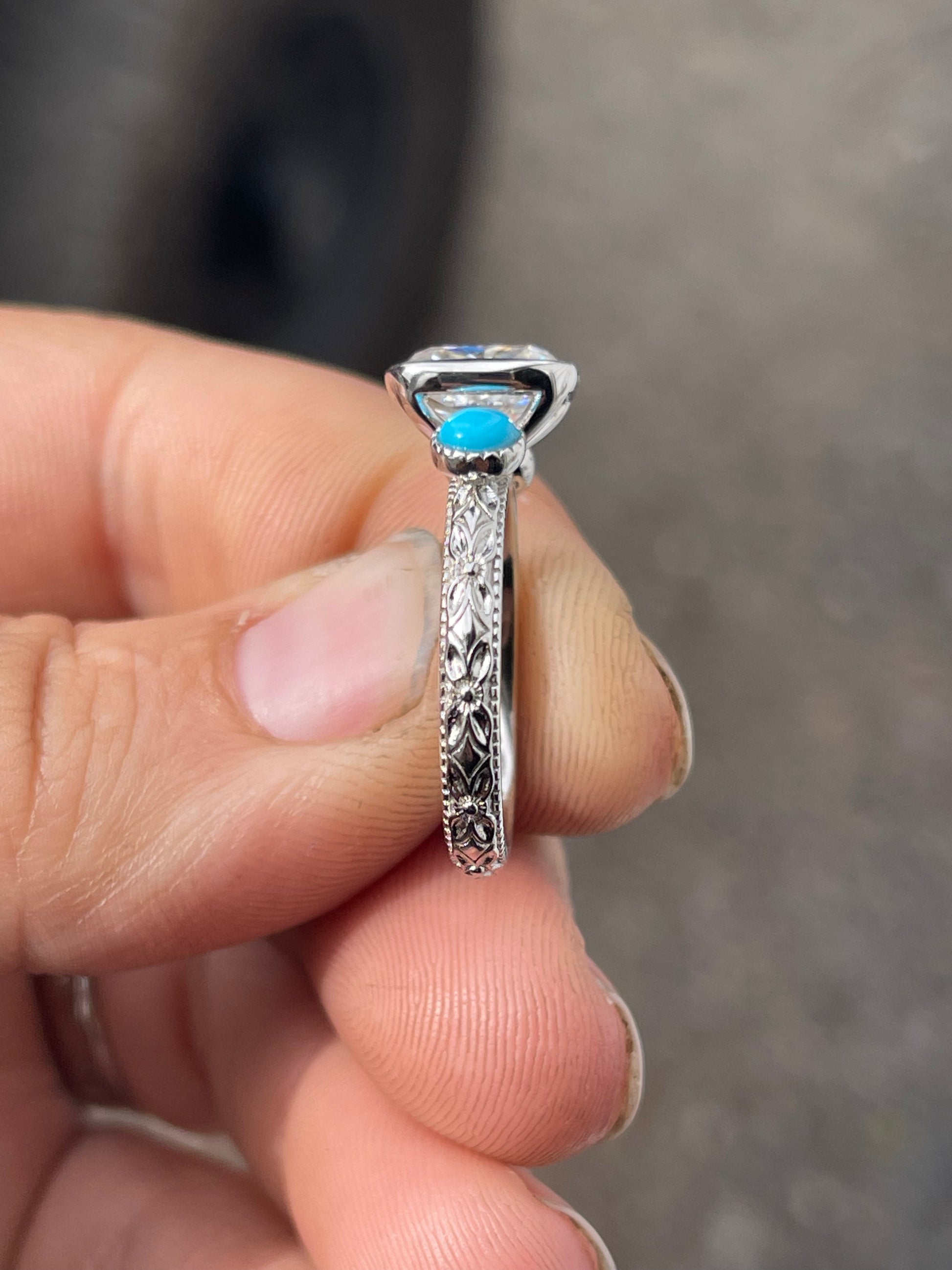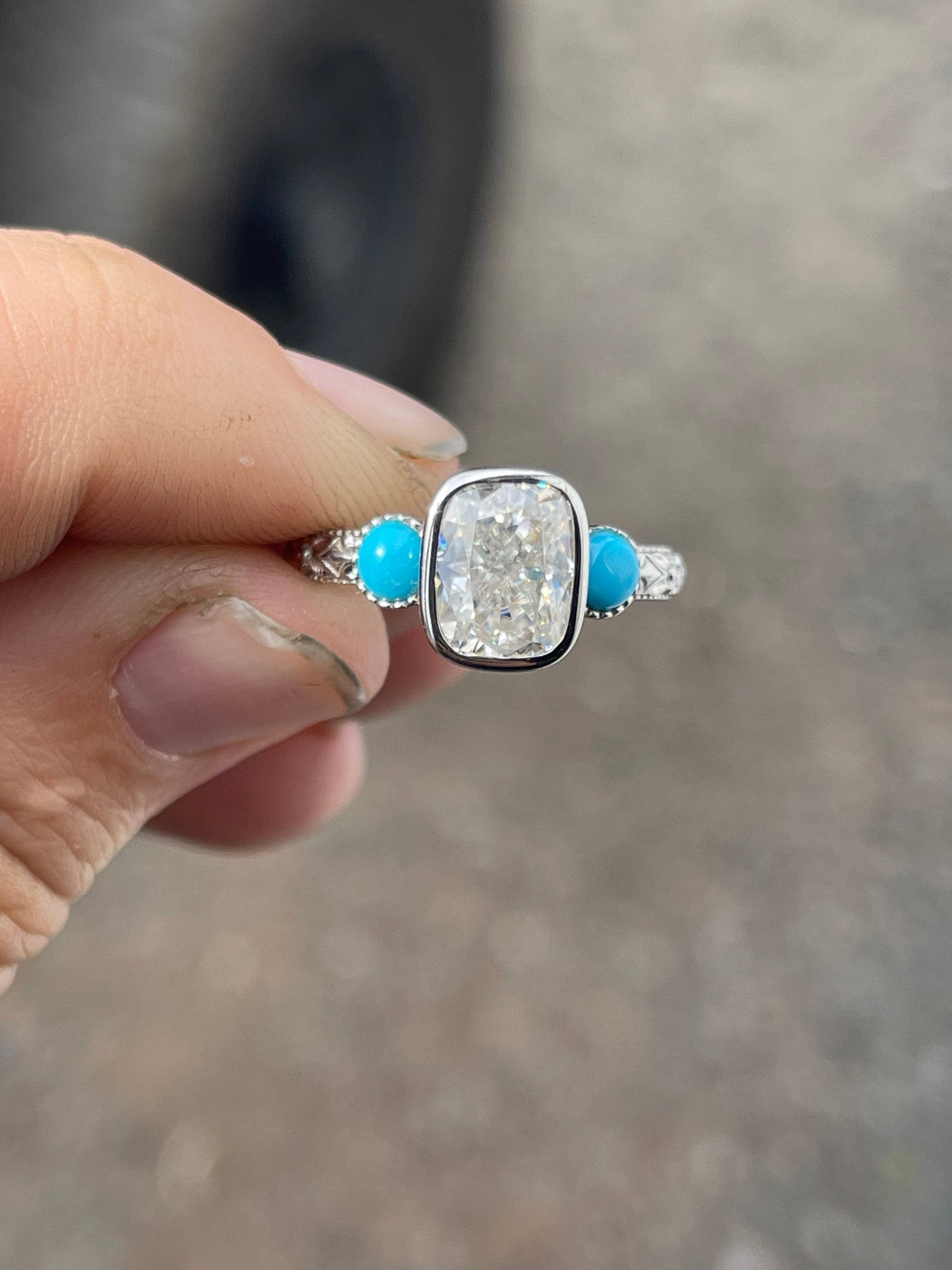 2.5ct Cushion Cut Moissanite in a Bezel Setting with 4mm Turquoise Side stones with Pattern Band