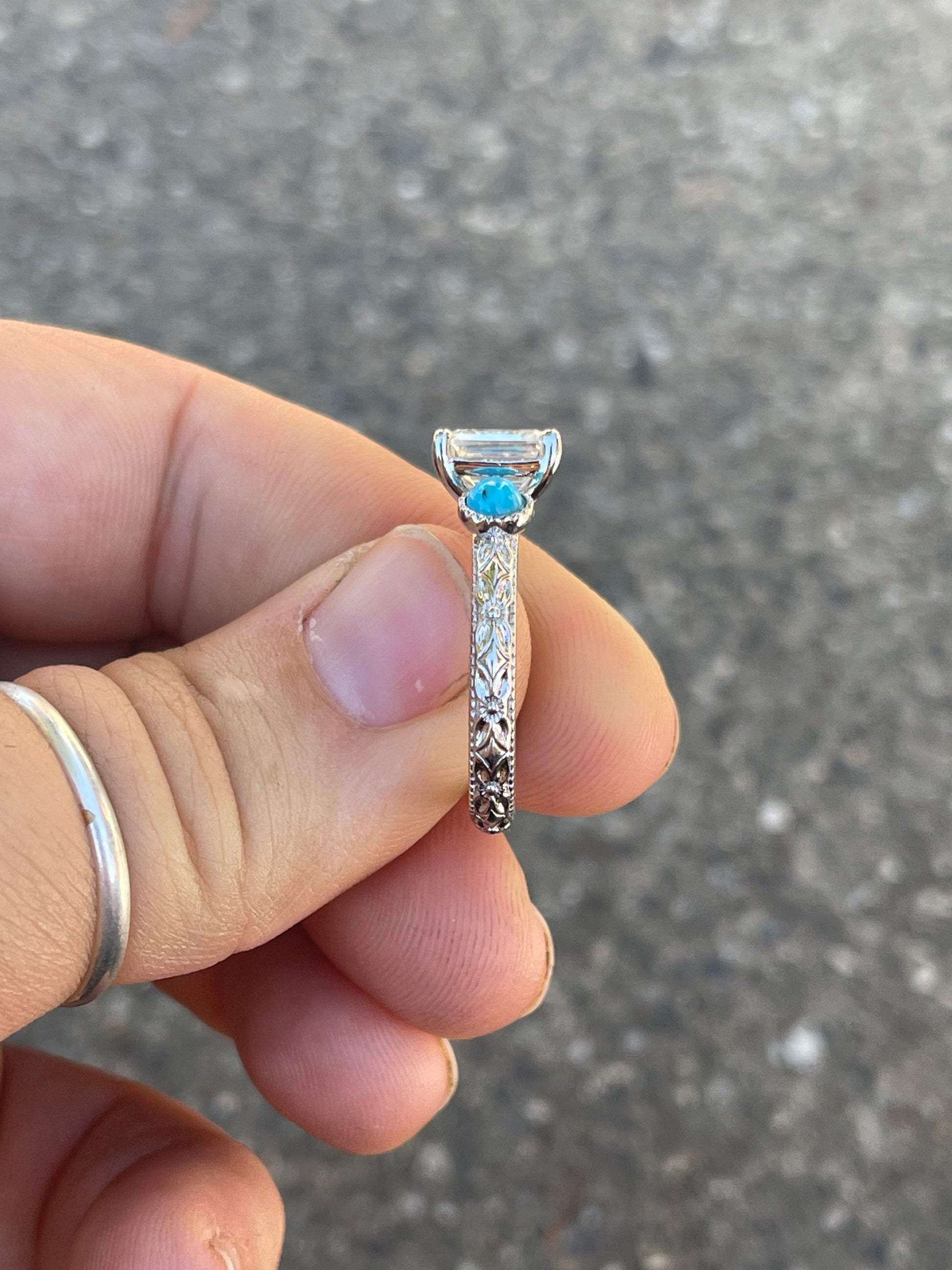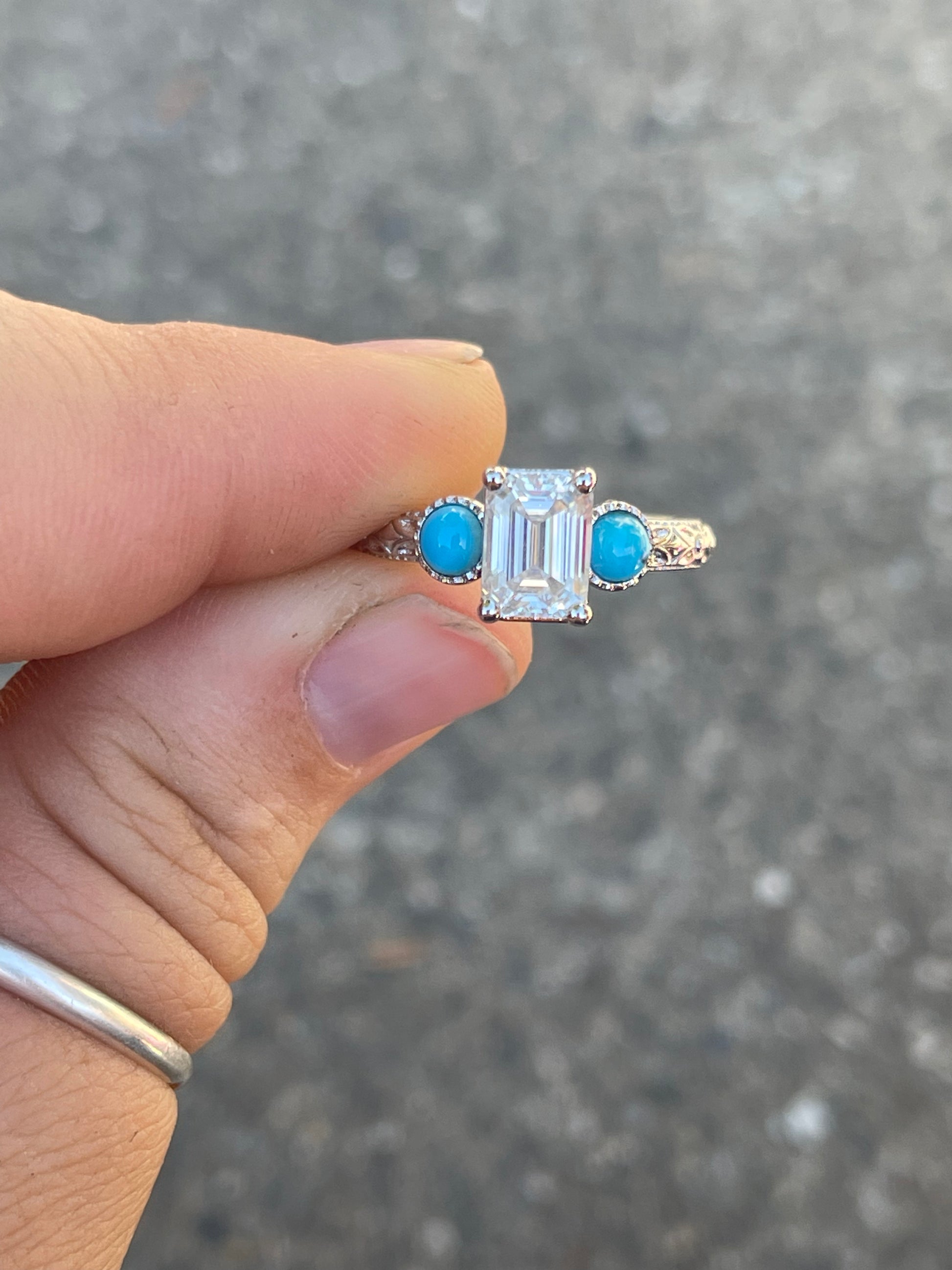 2.5ct Emerald Cut Moissanite in a Bezel Setting with 4mm Turquoise Side stones with Pattern Band