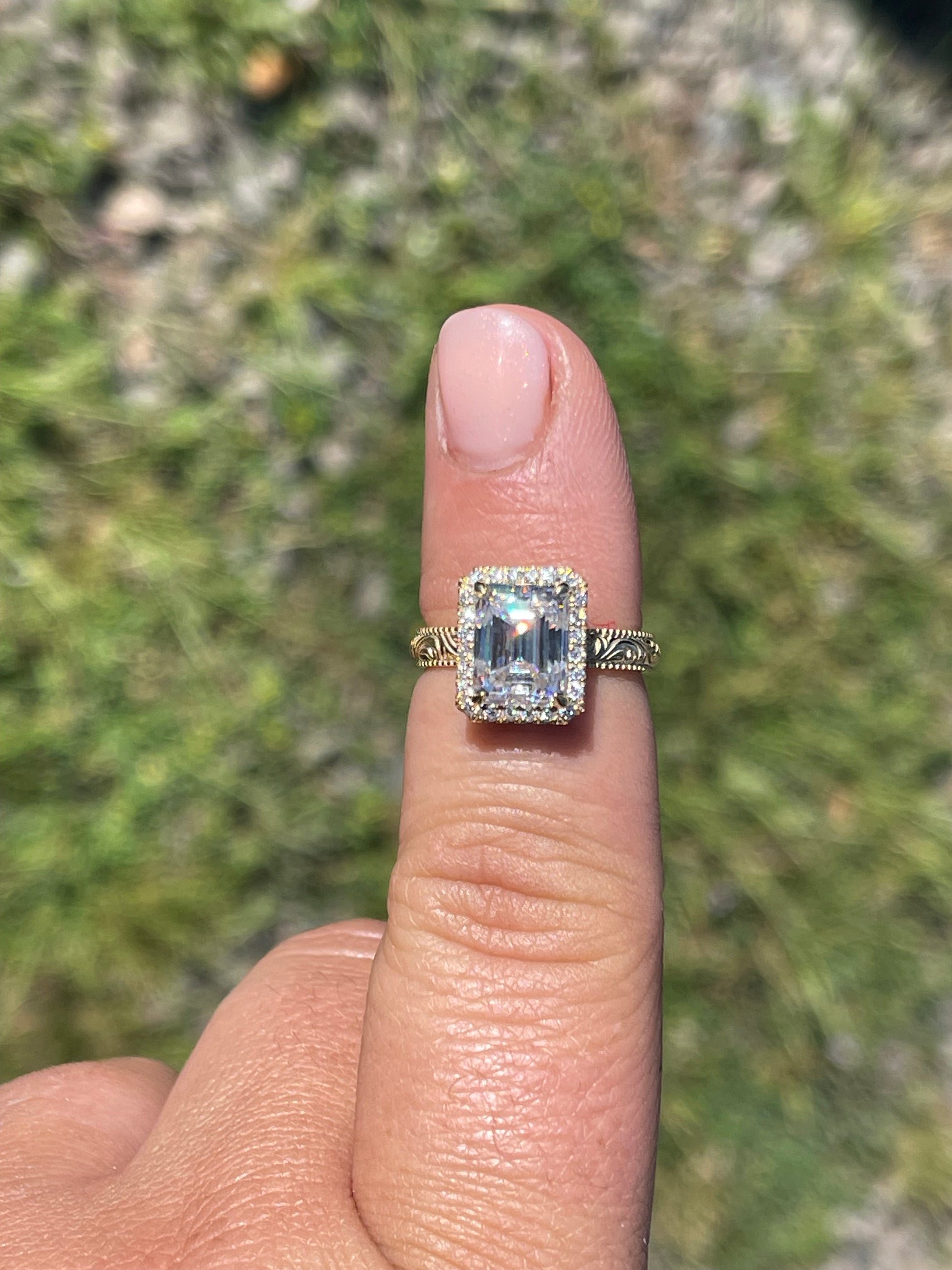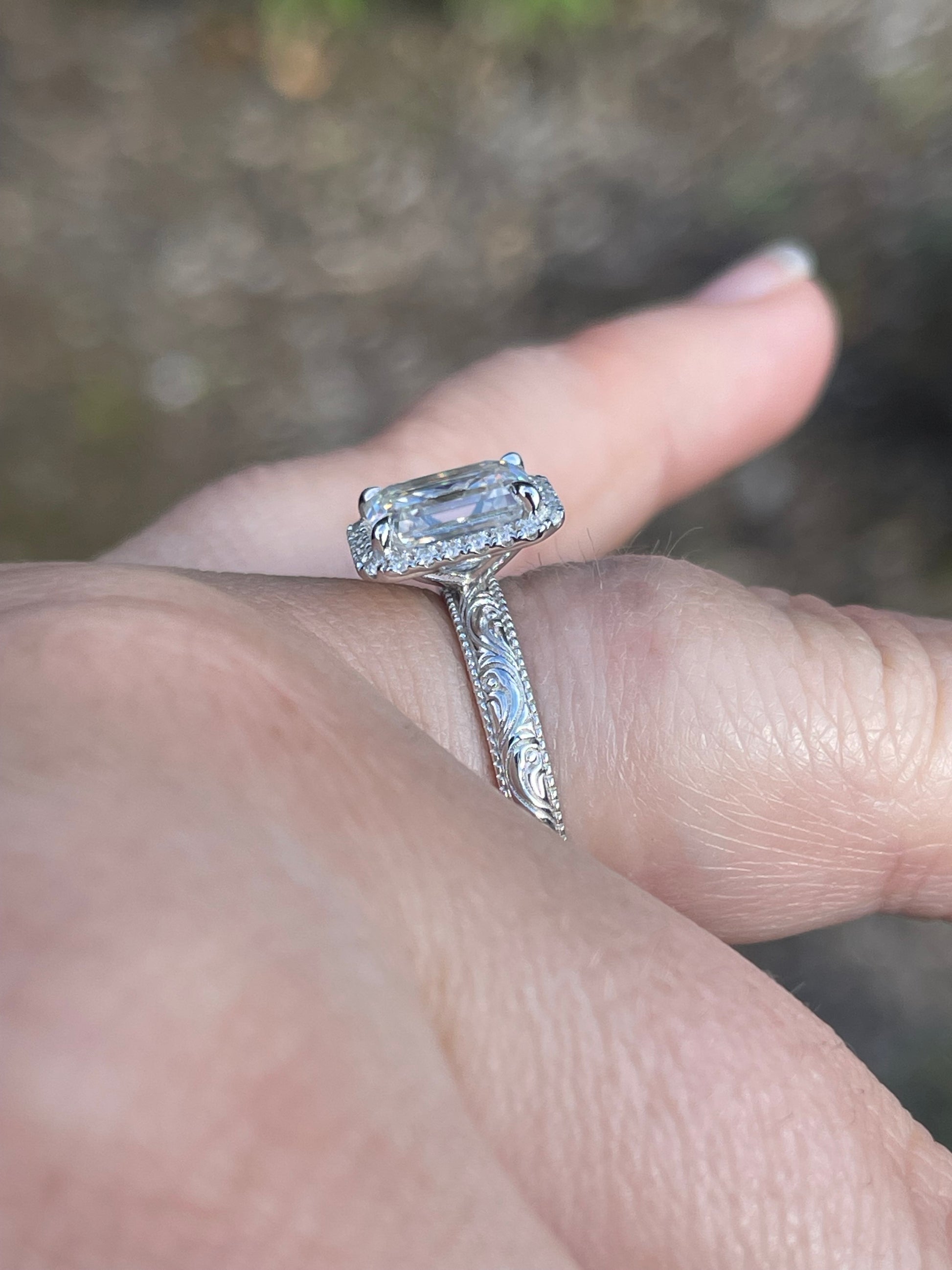 3ct Emerald Cut LAB DIAMOND with Halo LAB DIAMOND Stones on 3mm Pattern Band