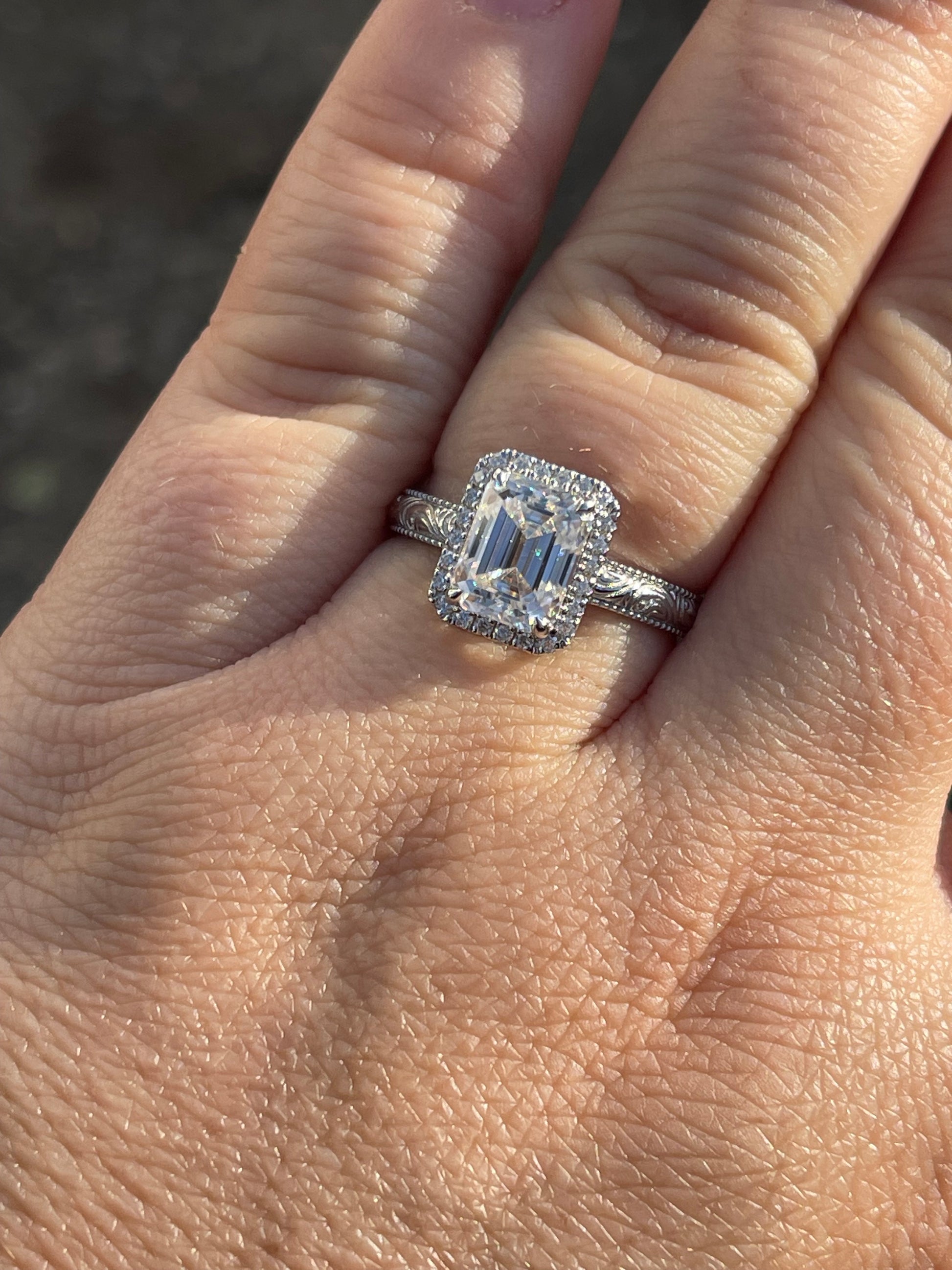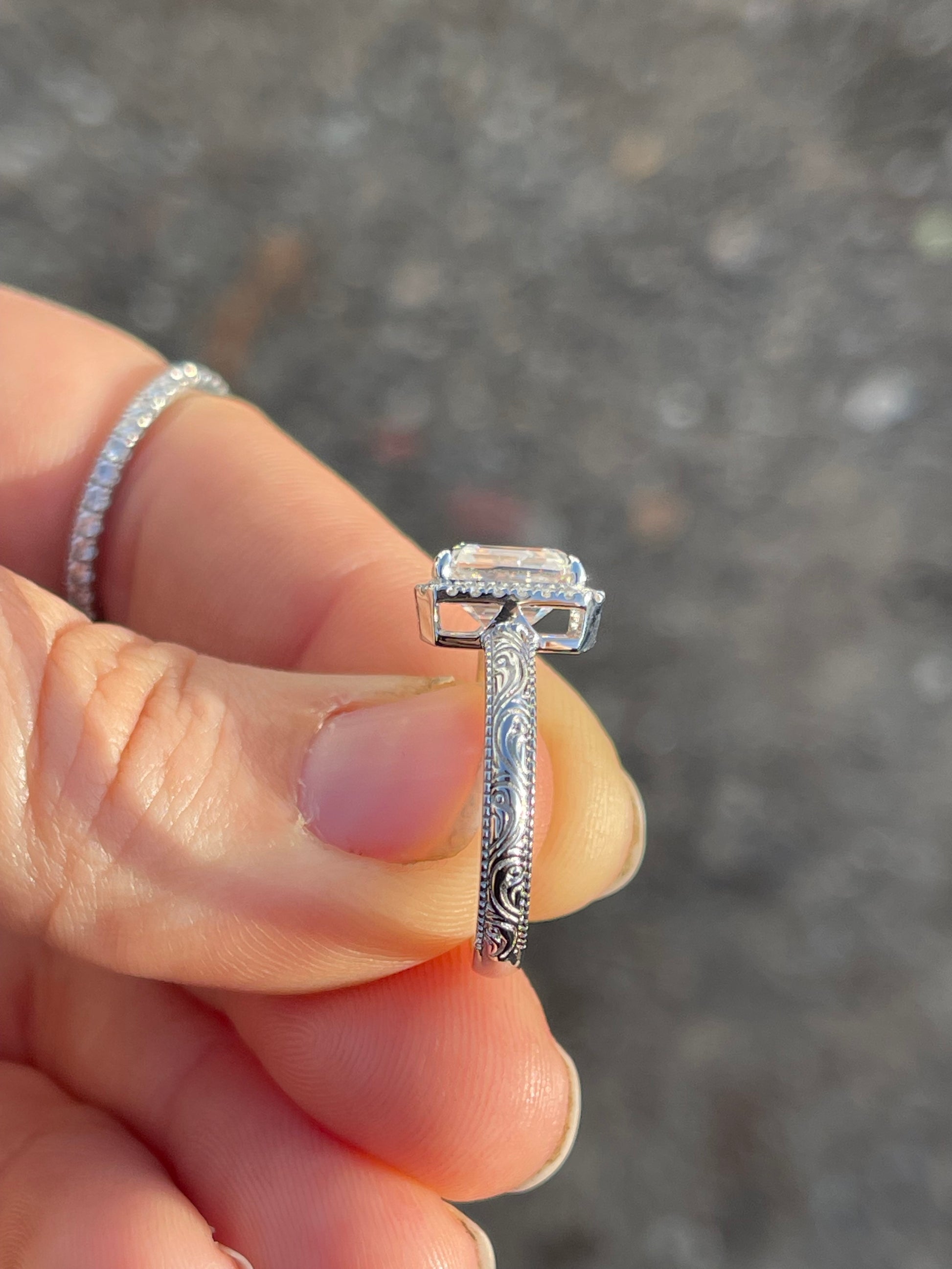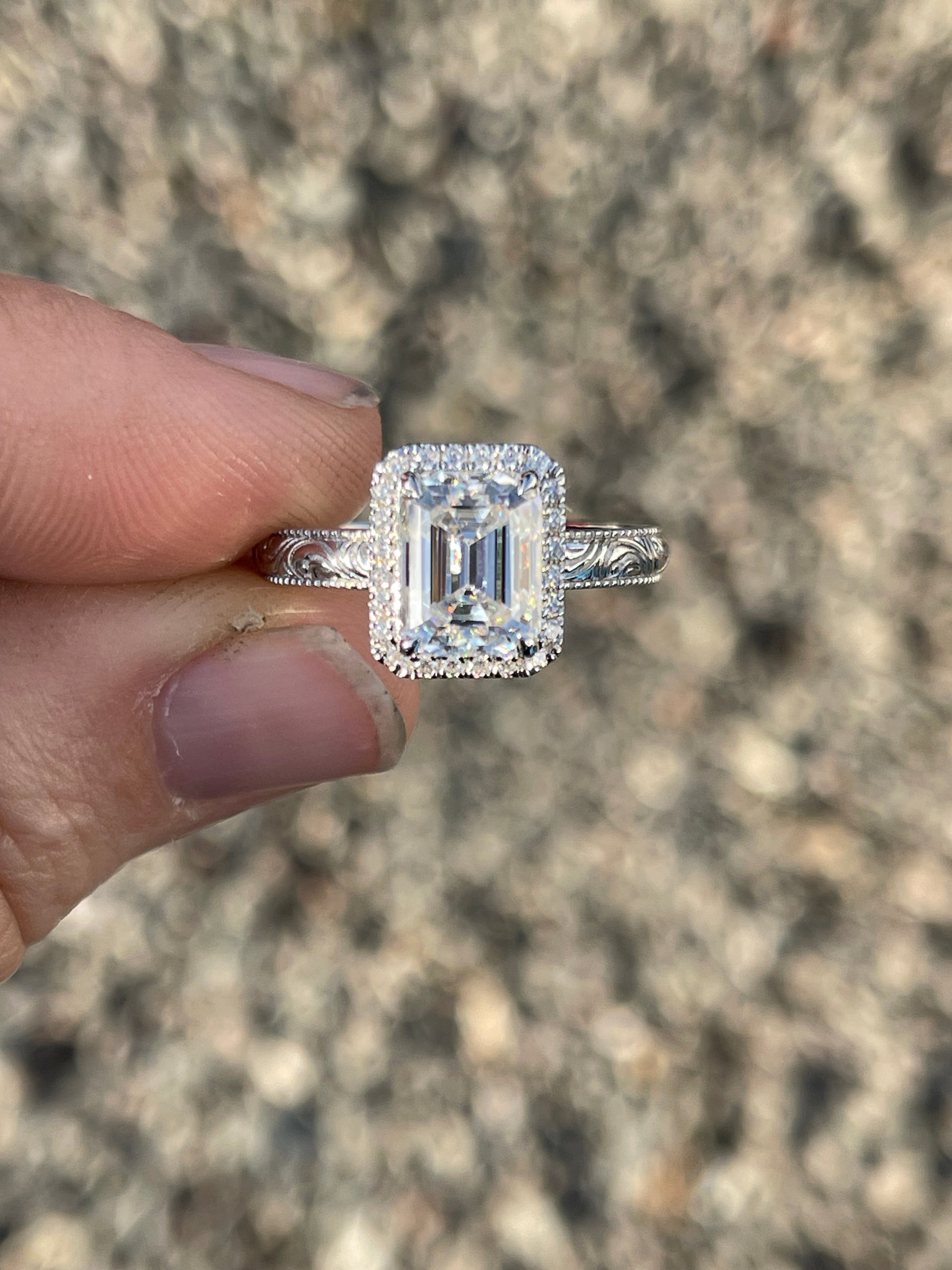 3Ct Emerald Cut Moissanite with Halo Moissanite Stones with Low Profile Setting on 3mm Pattern Band
