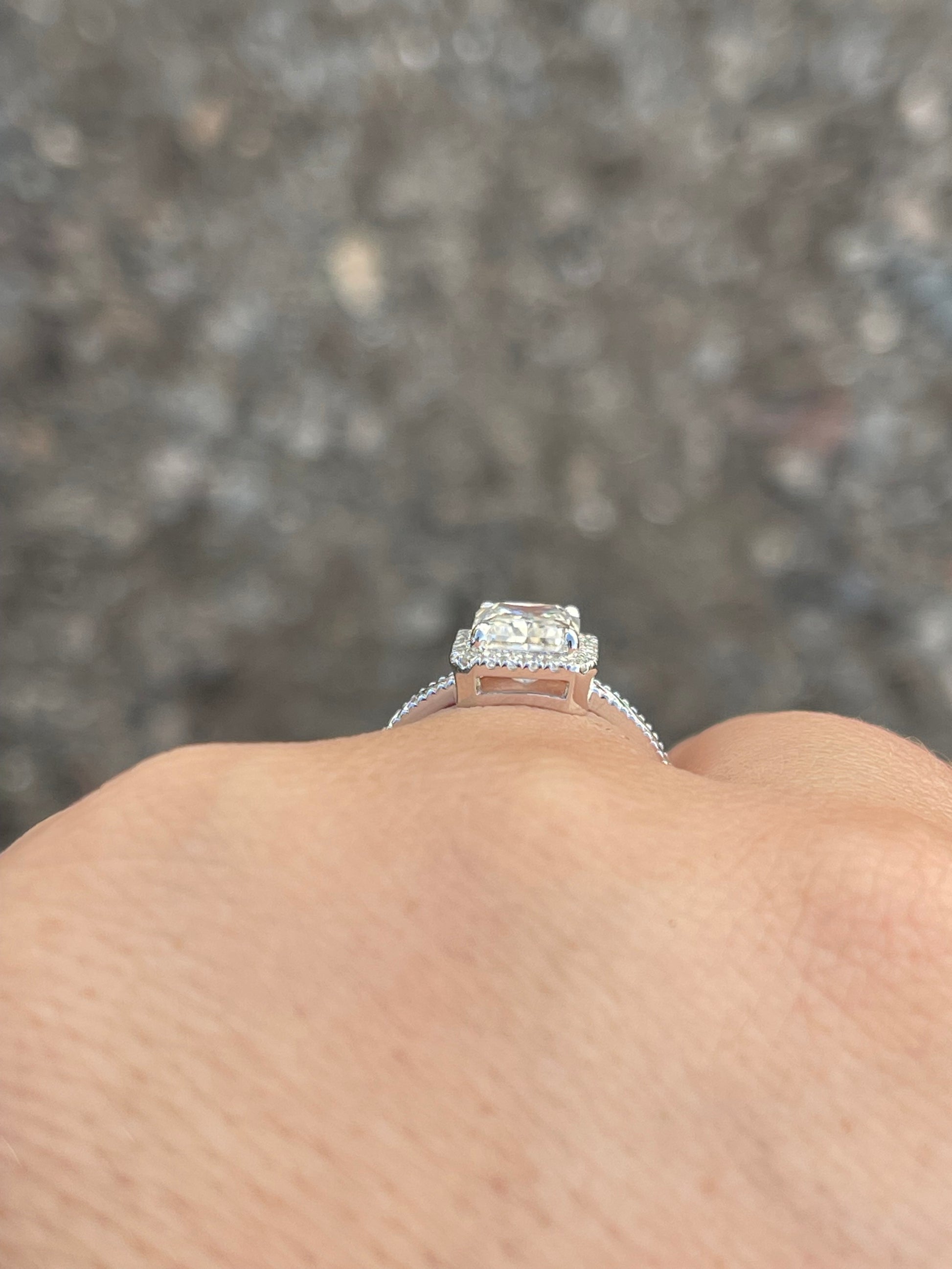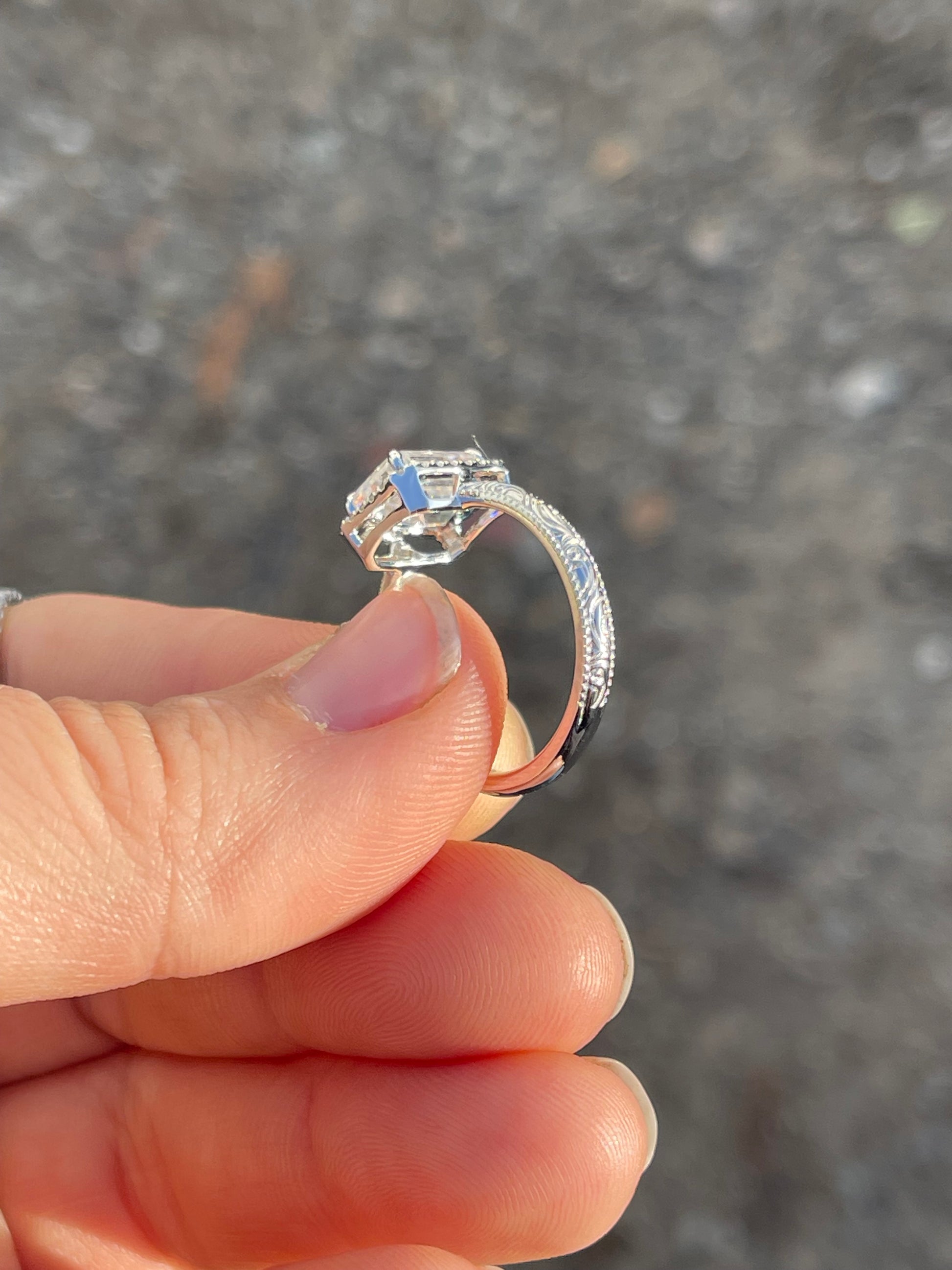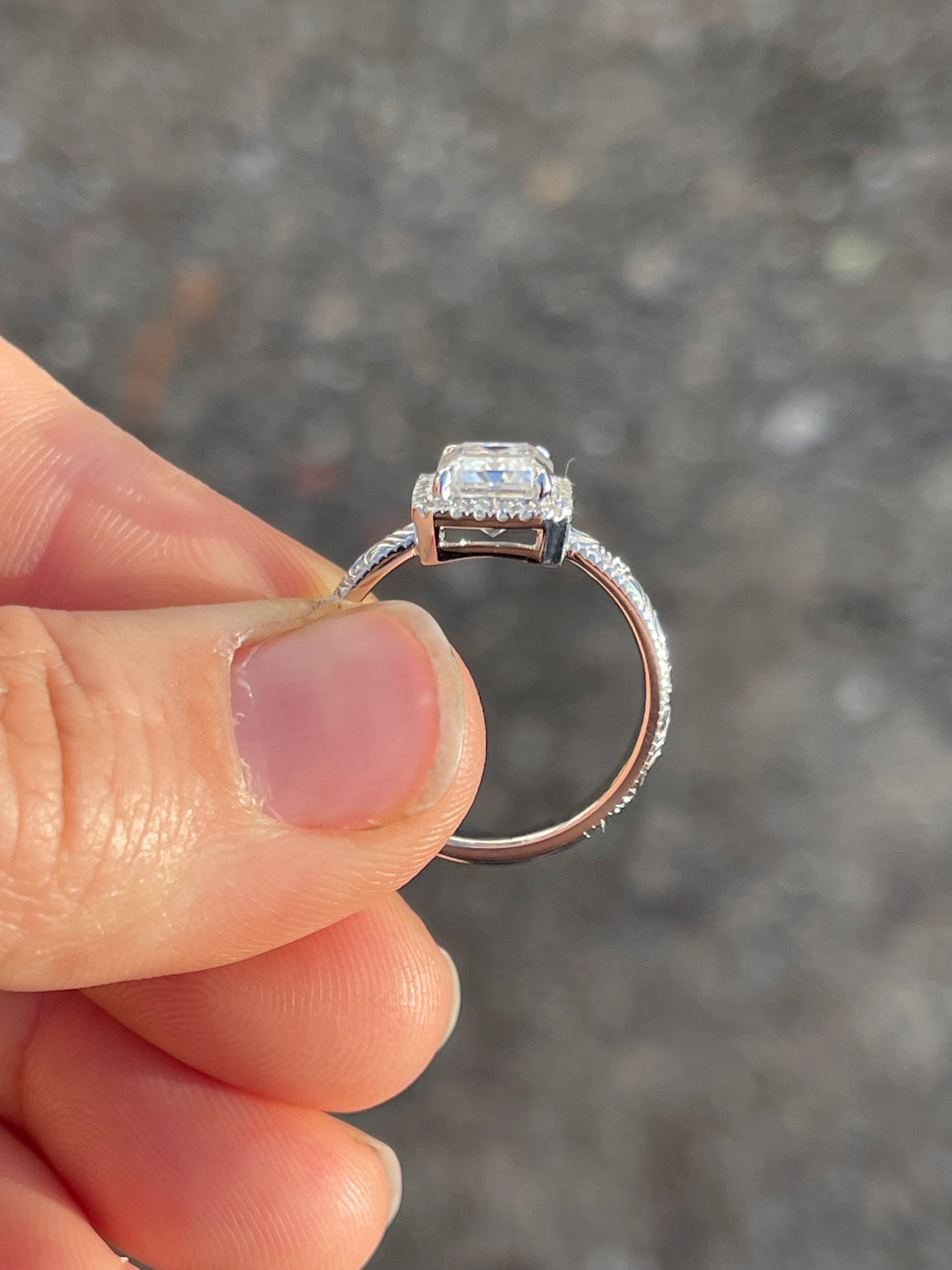 3Ct Emerald Cut Moissanite with Halo Moissanite Stones with Low Profile Setting on 3mm Pattern Band