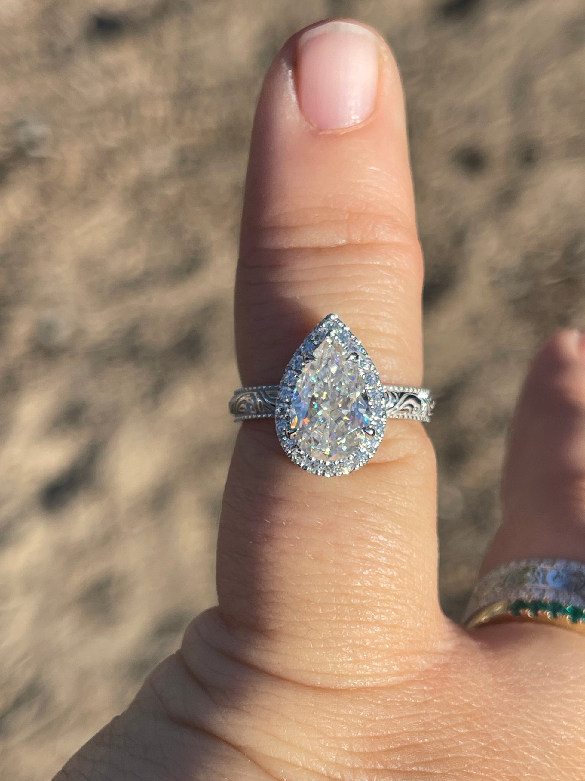 3ct Pear Cut Moissanite 7*10mm with Halo Moissanite Stones on 3mm Pattern Band Low Profile setting.