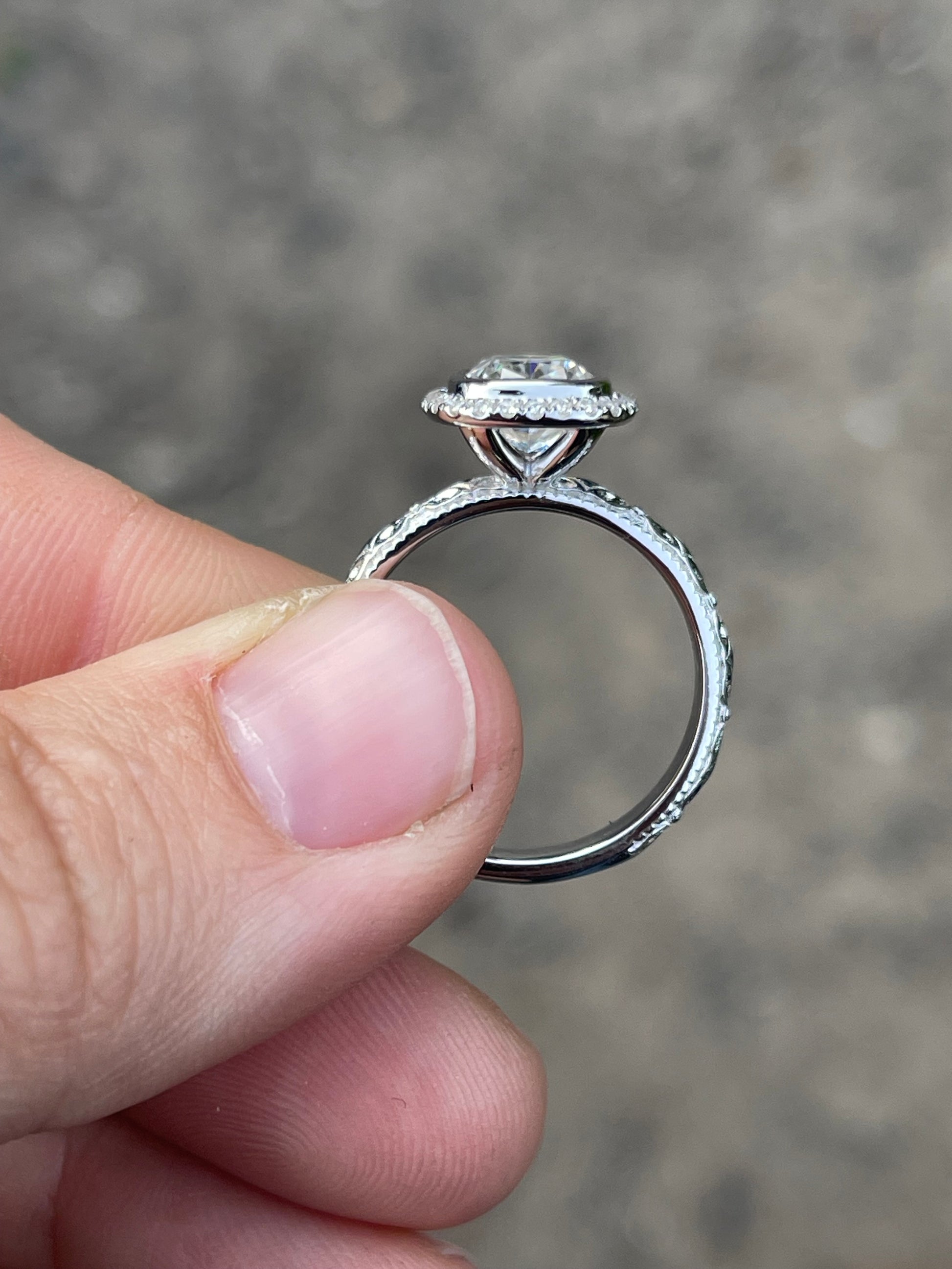 2.5 ct Cushion Cut Moissanite with Halo Setting and 3mm Pattern Band