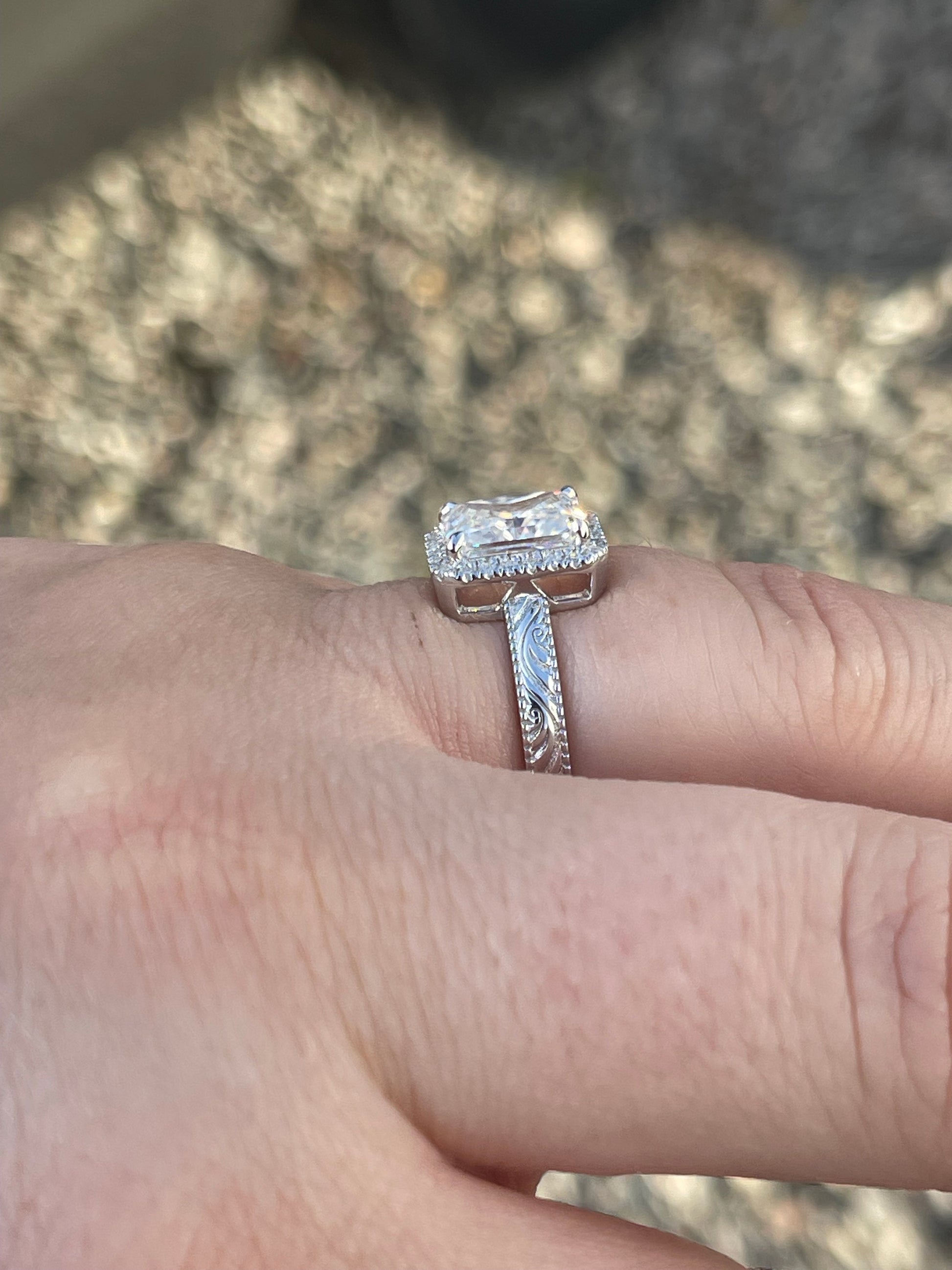 3ct Radiant Cut Moissanite with Halo Moissanite Stones on a Low Profile Setting in 3mm Pattern Band