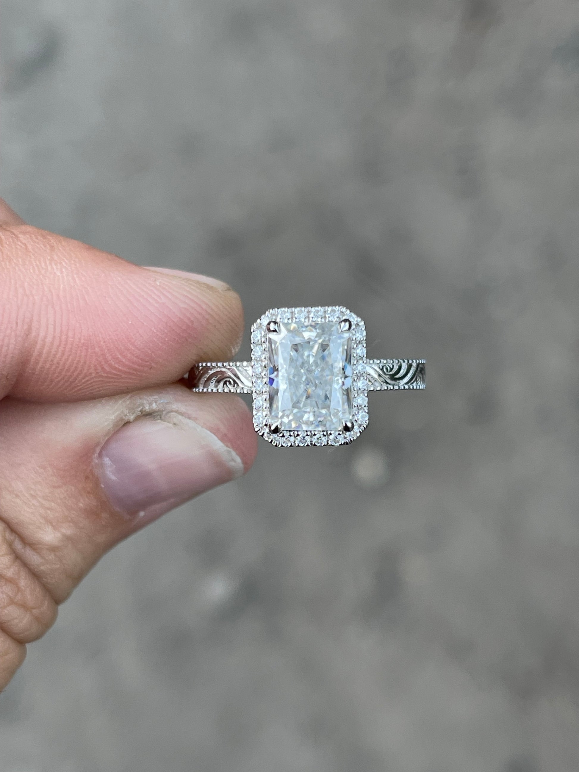 3ct Radiant Cut Moissanite with Halo Moissanite Stones on 3mm Pattern Band