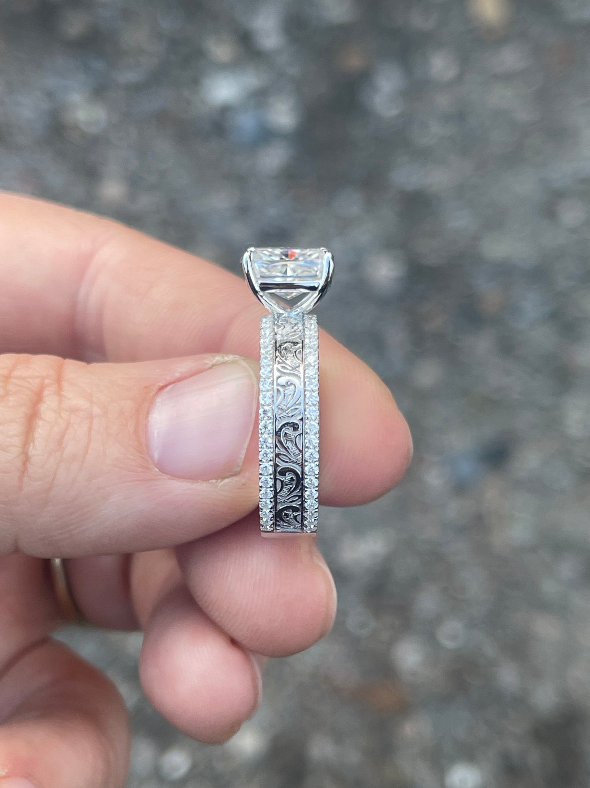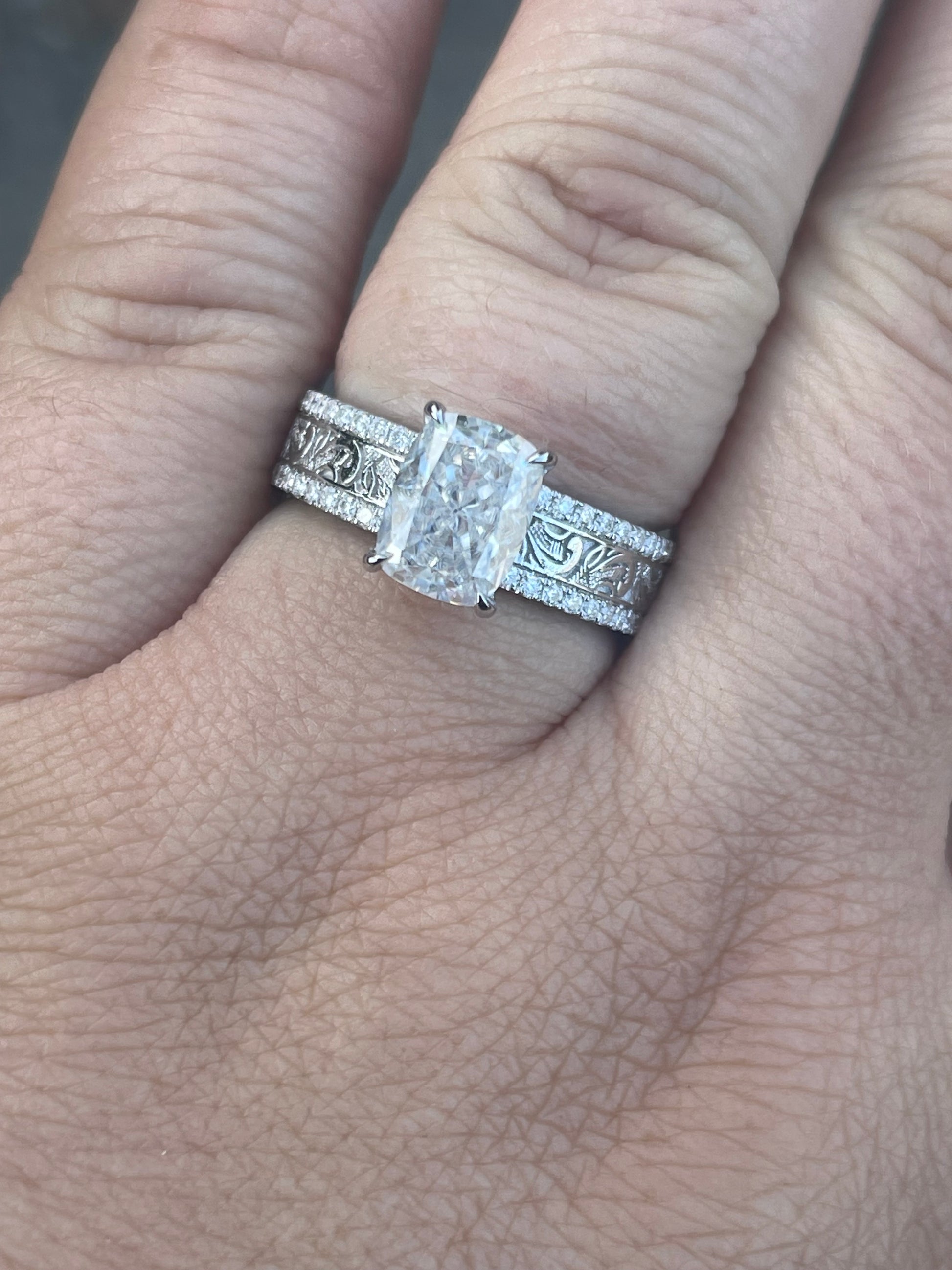 3ct Cushion Cut Moissanite with 5mm Pattern Band with Stones