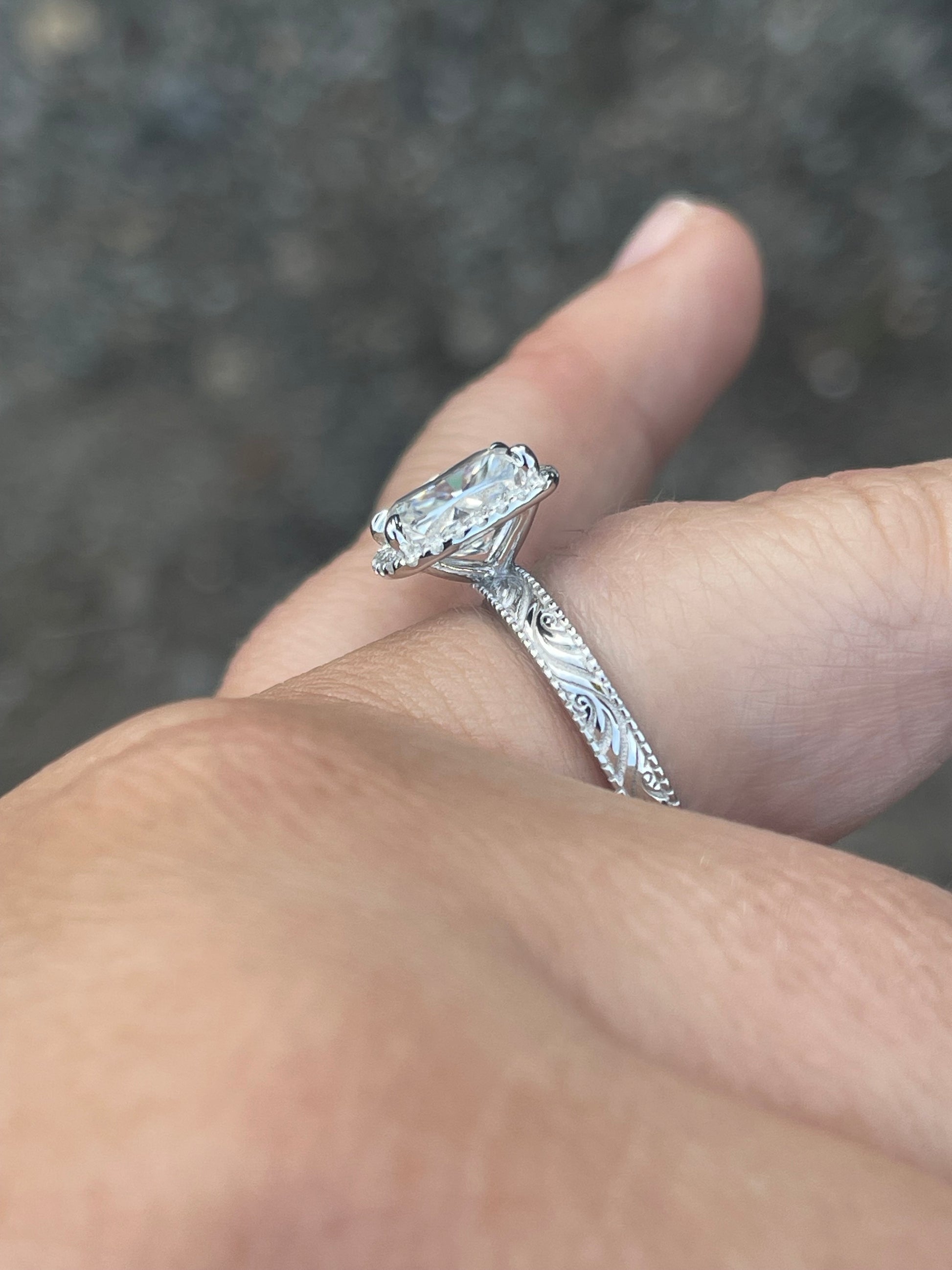 3ct Emerald Cut Moissanite with Moissanite Side Stones on 2mm Half Eternity Band