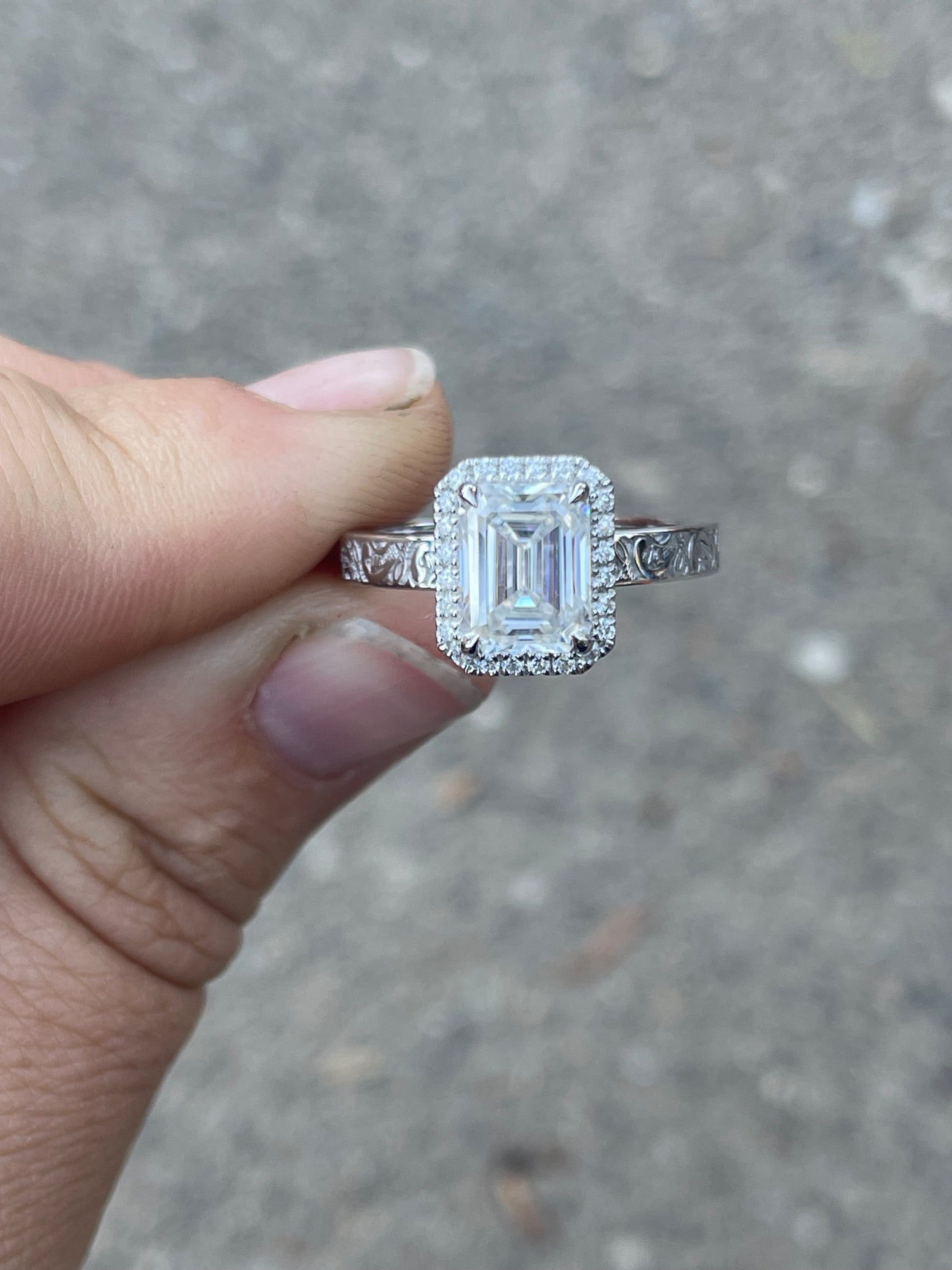 3ct Emeral Cut Moissanite with Halo Moissanite Stones on 3mm Pattern Band