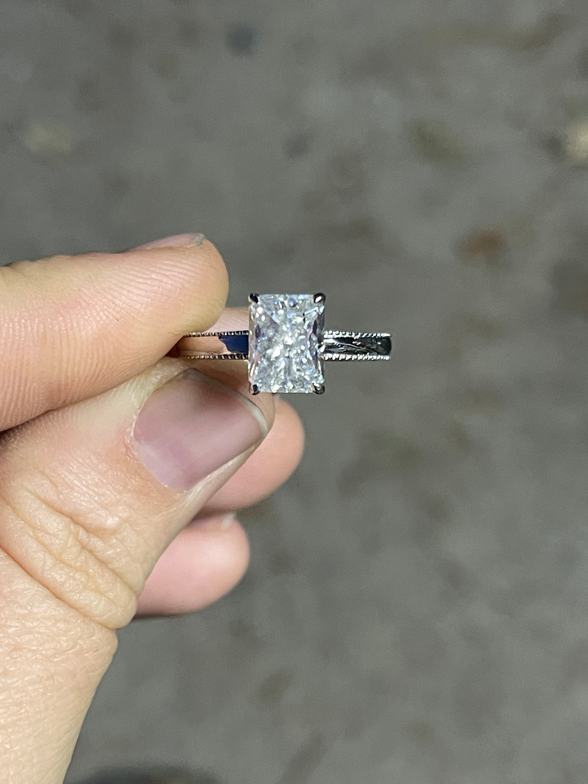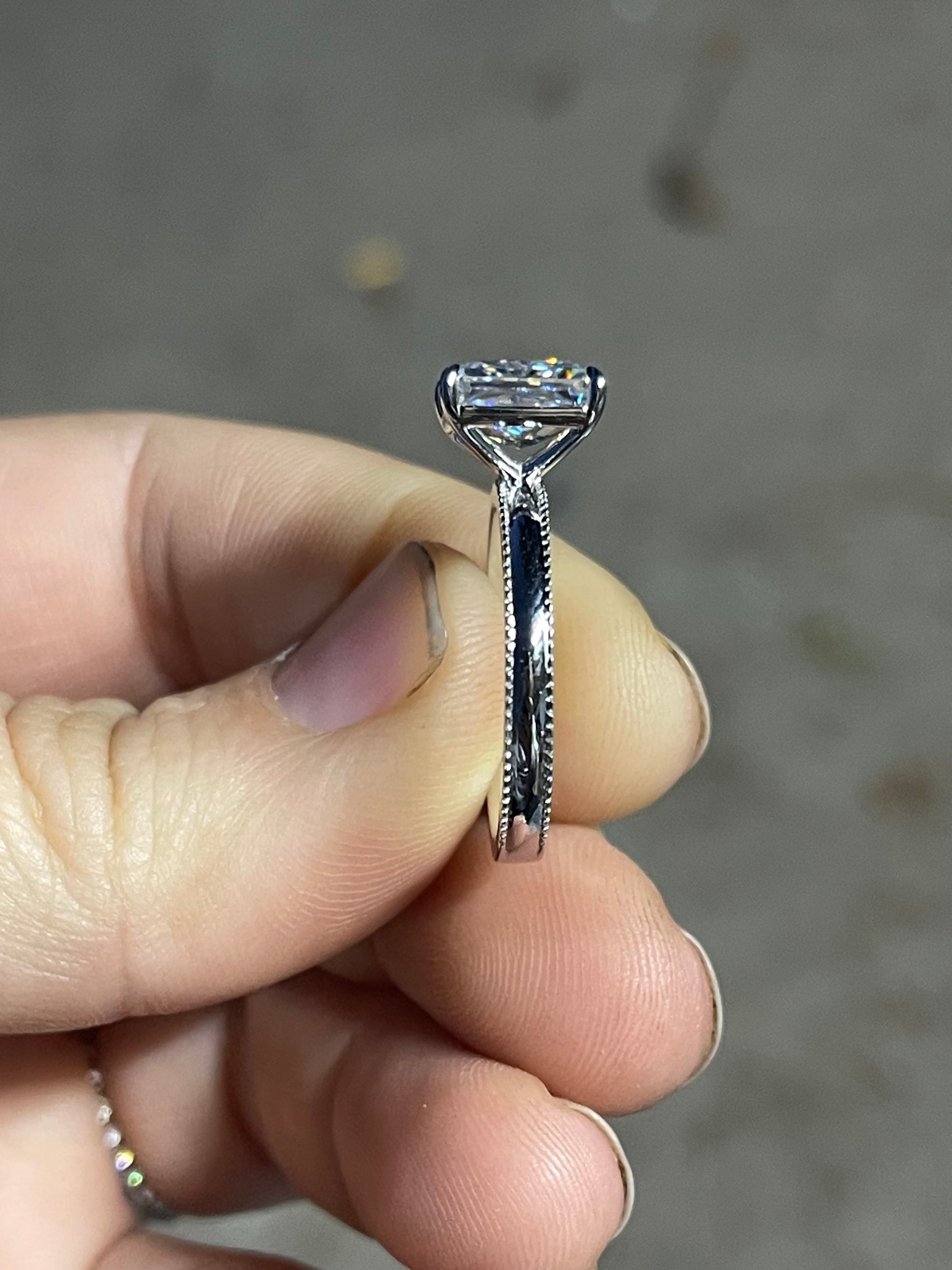 3ct Radiant Cut Moissanite with 3mm Smooth Band with Mill Grained Edges