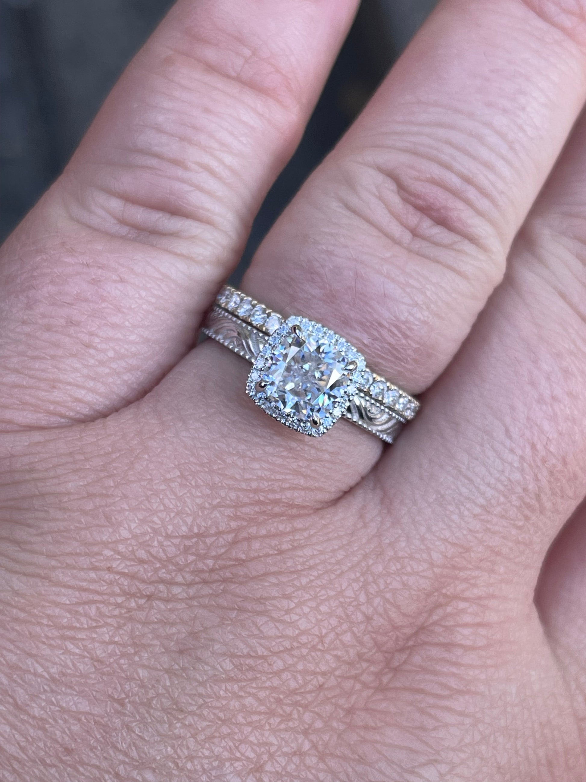 2ct Cushion Cut Moissanite 7*7mm with Halo Moissanite Stones on 2mm Pattern Band