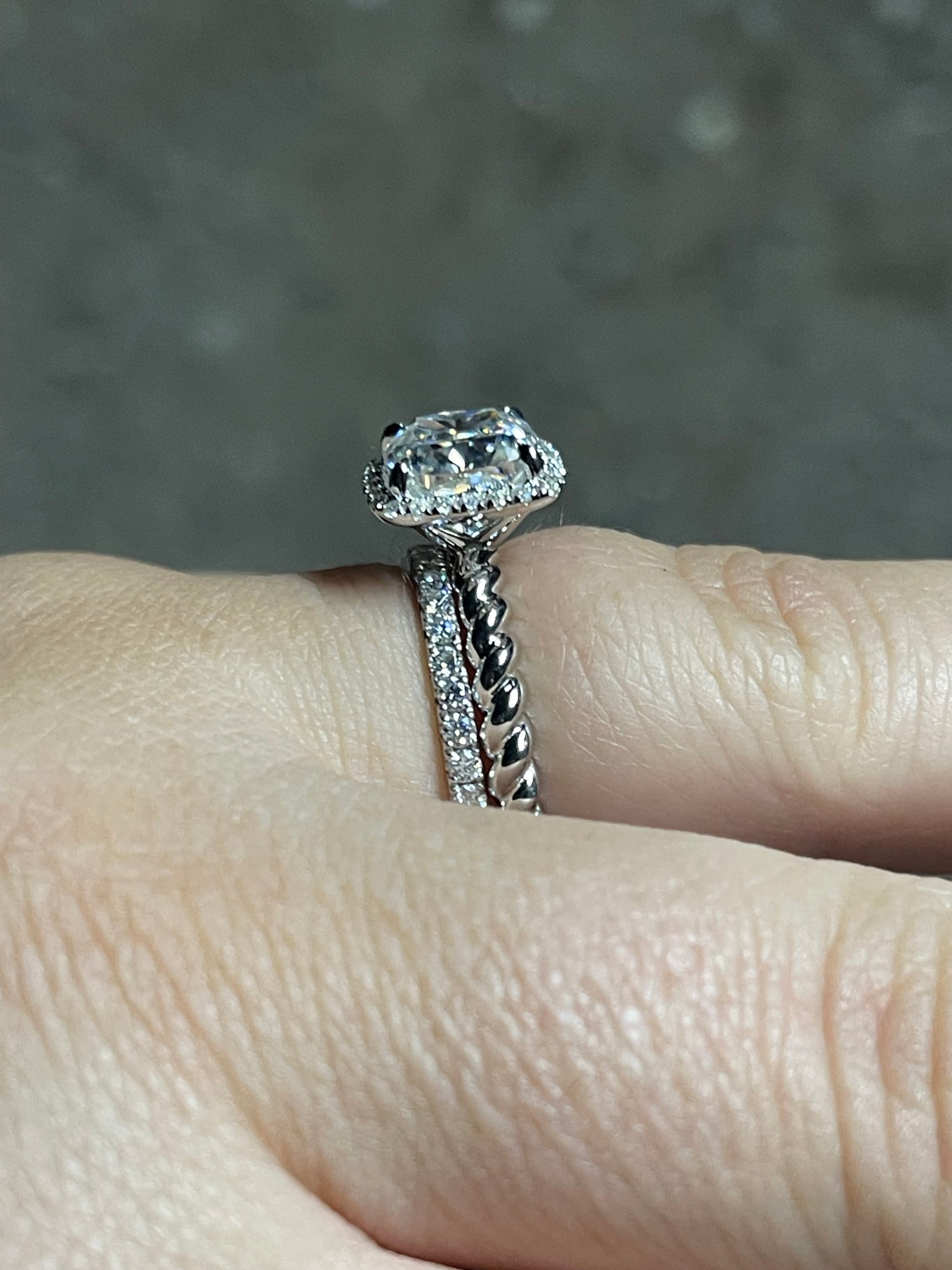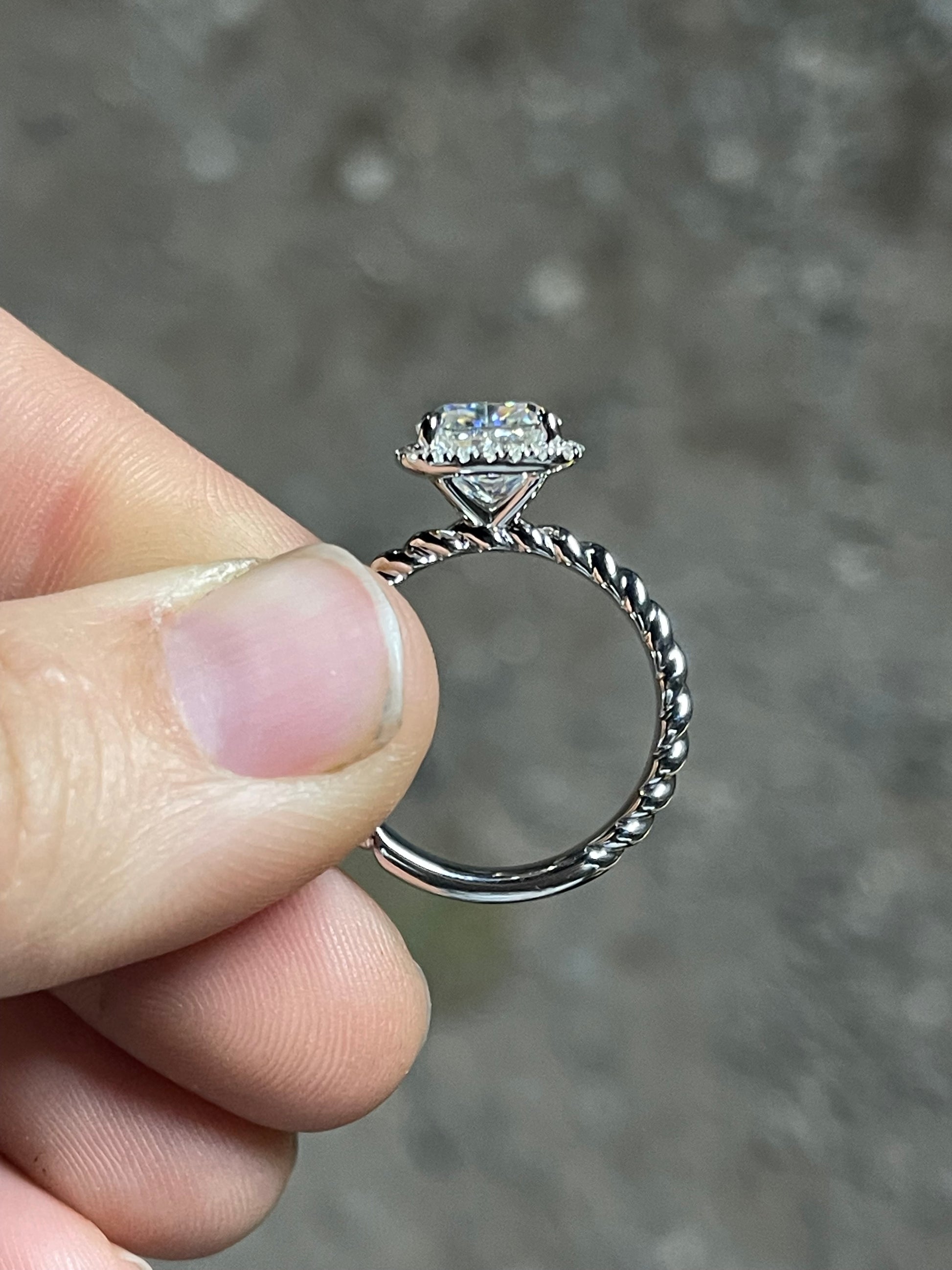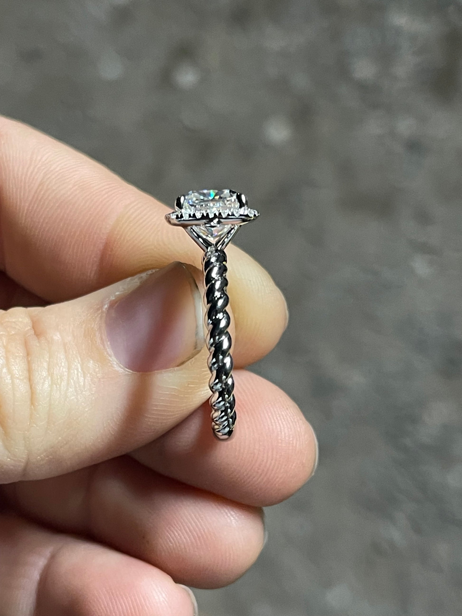 3ct Cushion Cut Moissanite with Halo Moissanite Stones on 3mm Twisted Wire Pattern Band