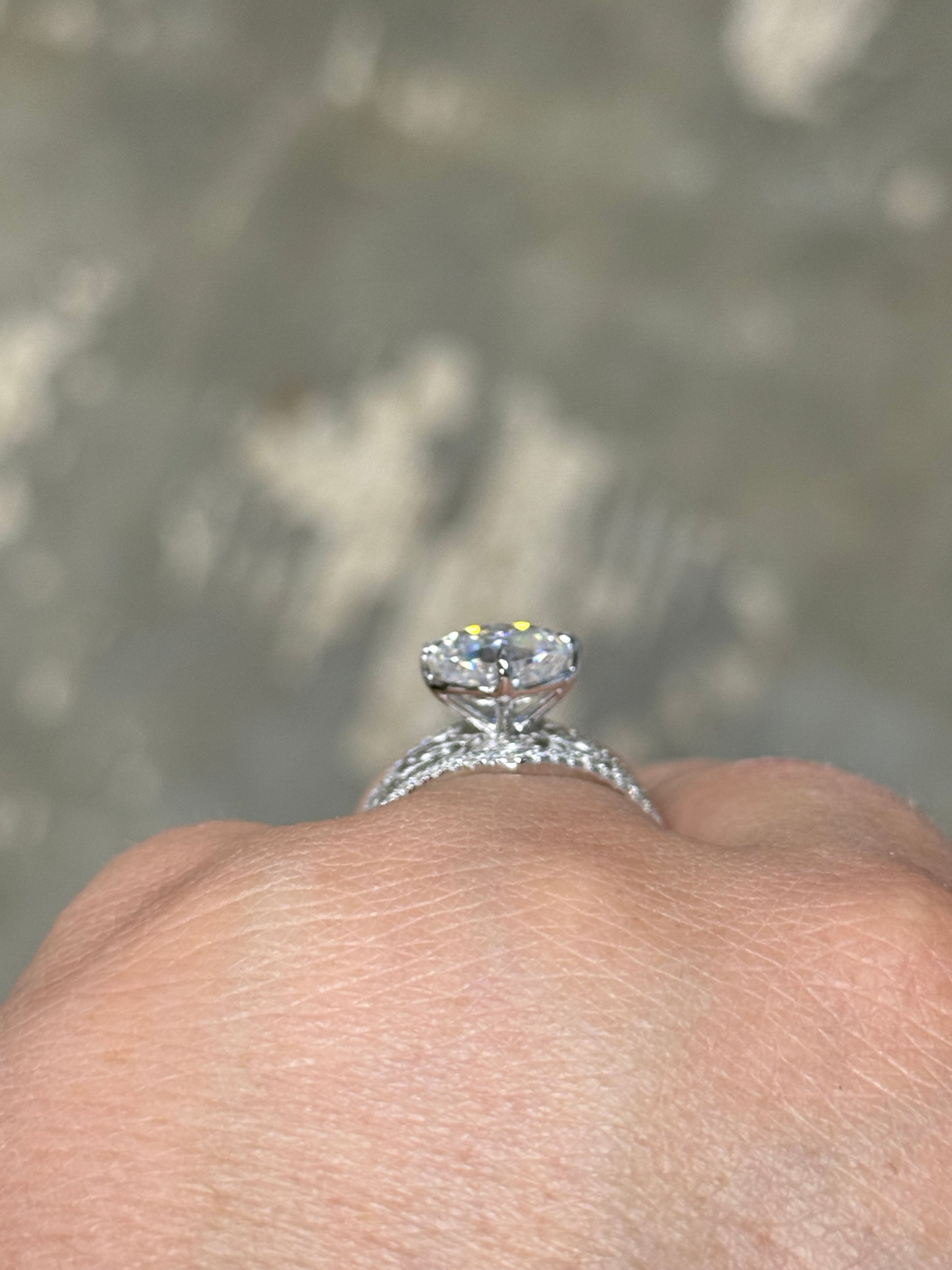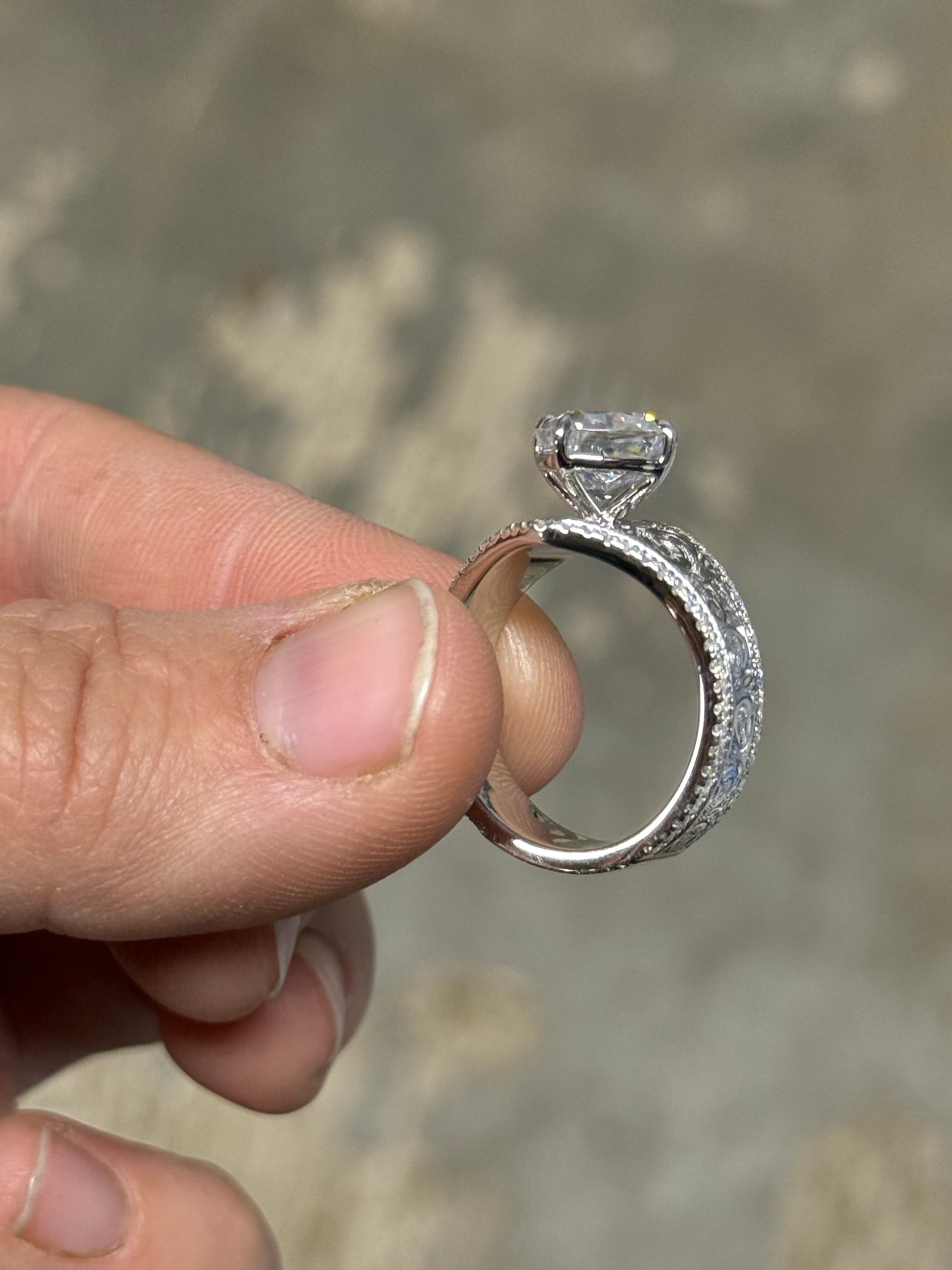 3ct Cushion Cut Moissanite with Halo and 5.8mm Pattern Band with Moissanite Stones